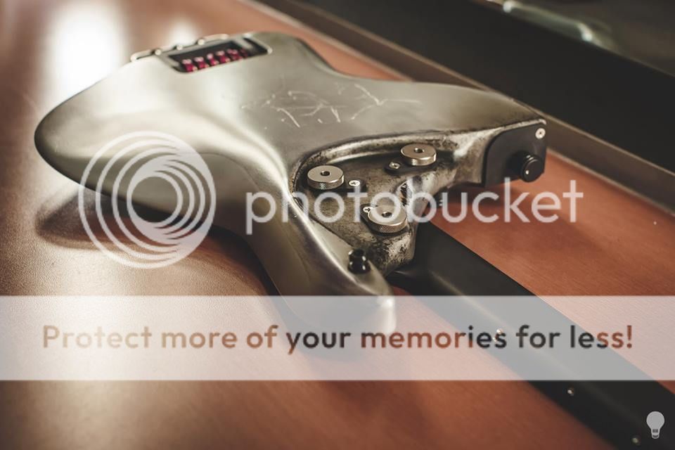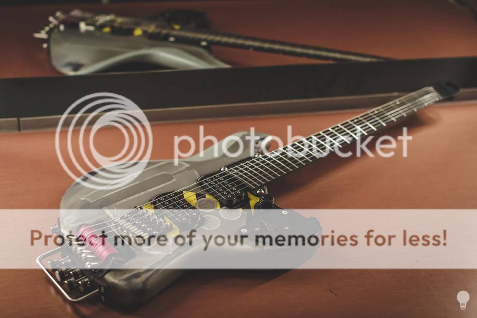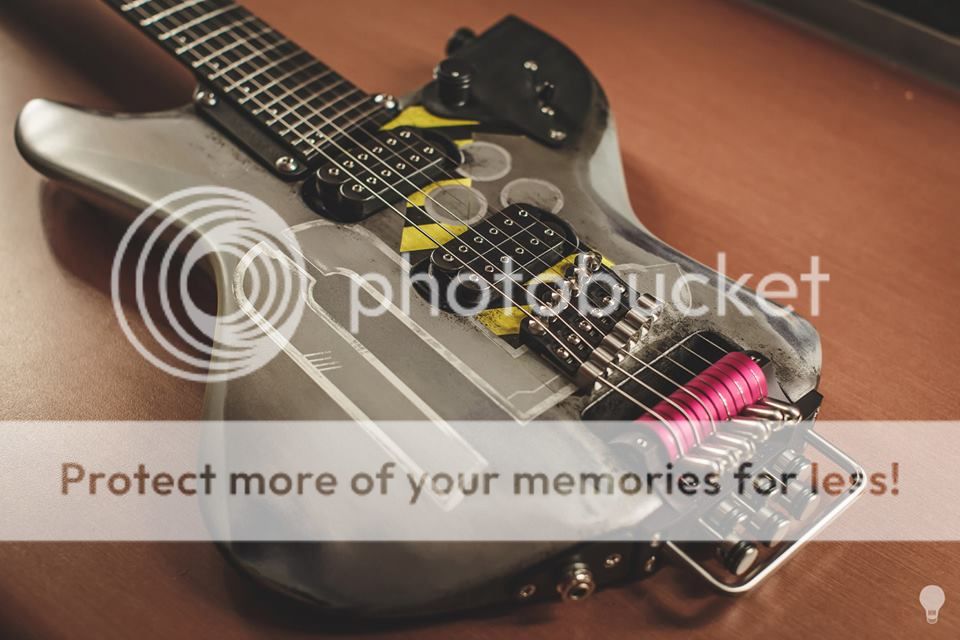 I took one look and hated it, and took some more looks and got interested, and read the specs and though "holy sh*t". This guitar belongs to a guy named Misha Mansoor, who is a guitarist in the band Periphery....I don't dig all of their music, but the guy is an accomplished guitarist. He got in touch with Rick and told him to build a guitar based on steampunk and an F-22.0 This is the result...I ask that people don't make snap judgements....take a look at it, how it's constructed, and the ergonomics of the thing....one thing I thought was really cool is that it's designed to sit on your outer thigh and have the neck (which is made out of aluminum, BTW) be up in a classical position, and another was where the controls are in relation to where your hands are when playing. Rick holds a bunch of patents for neck profiles, and also bridges, tuning hardware and intonation devices. It's an interesting look and an unconventional guy and his take on what makes a guitar playable.
