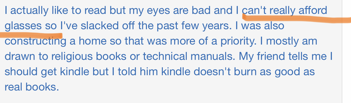 Seriously though, not being able to afford something like glasses is completely alien to me.