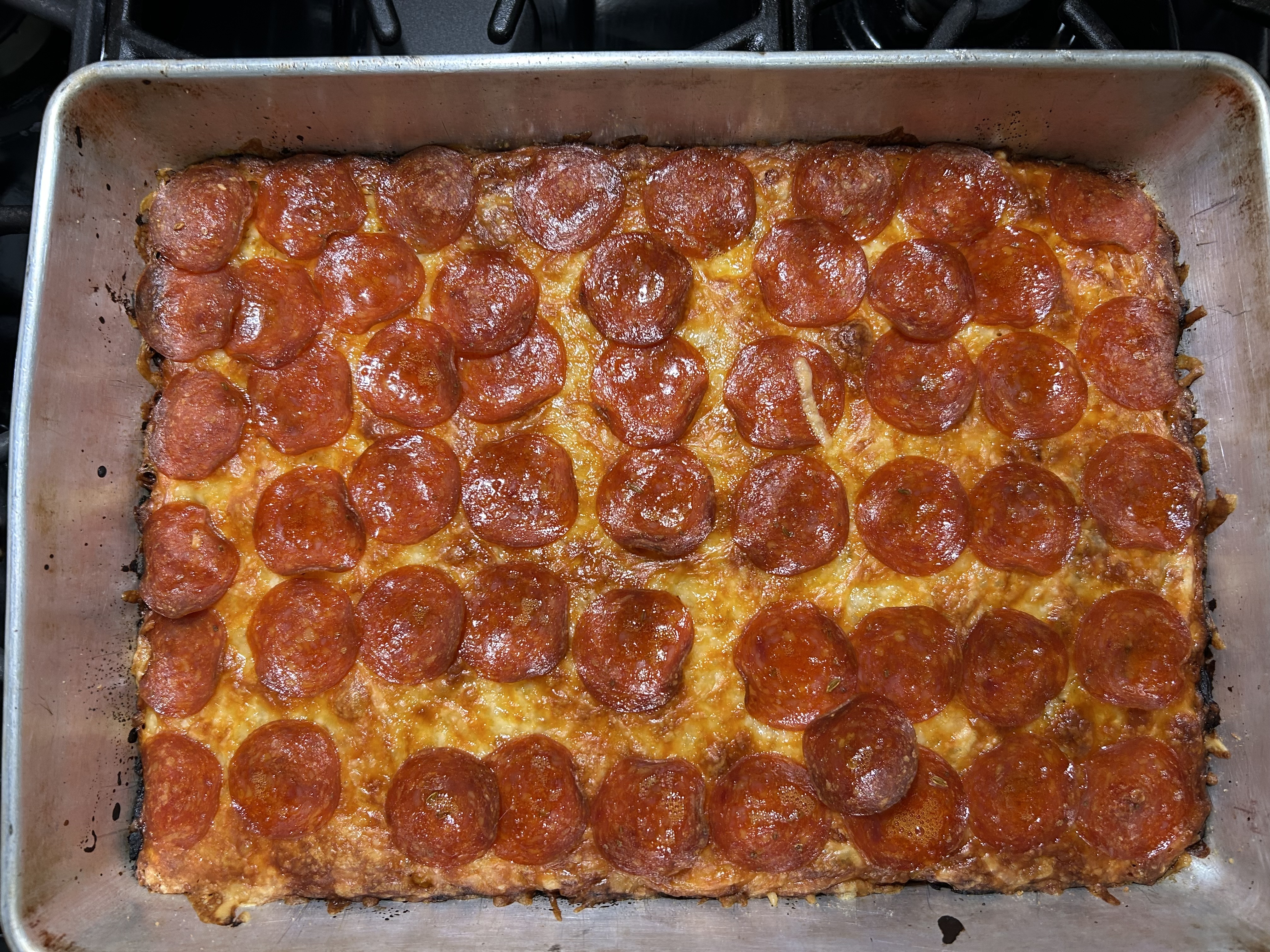 It’s 20 degrees, so the Ooni is tucked away in the garage. I took a stab at a Detroit style pizza. I don’t like a lot of sauce, but that can be worked around. I don’t bake, so I explicitly followed the directions. The dough simply didn’t rise (yes, I checked the dates…)