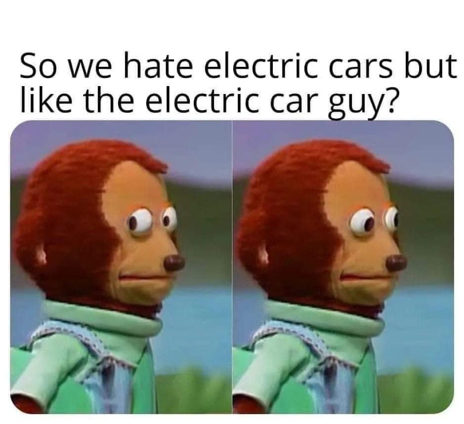 Touché, but I hear all the progressives are selling now that Musk is a far right extremistAnd I would say the real question is, " So we love electric cars, but we hate the electric car guy?"
