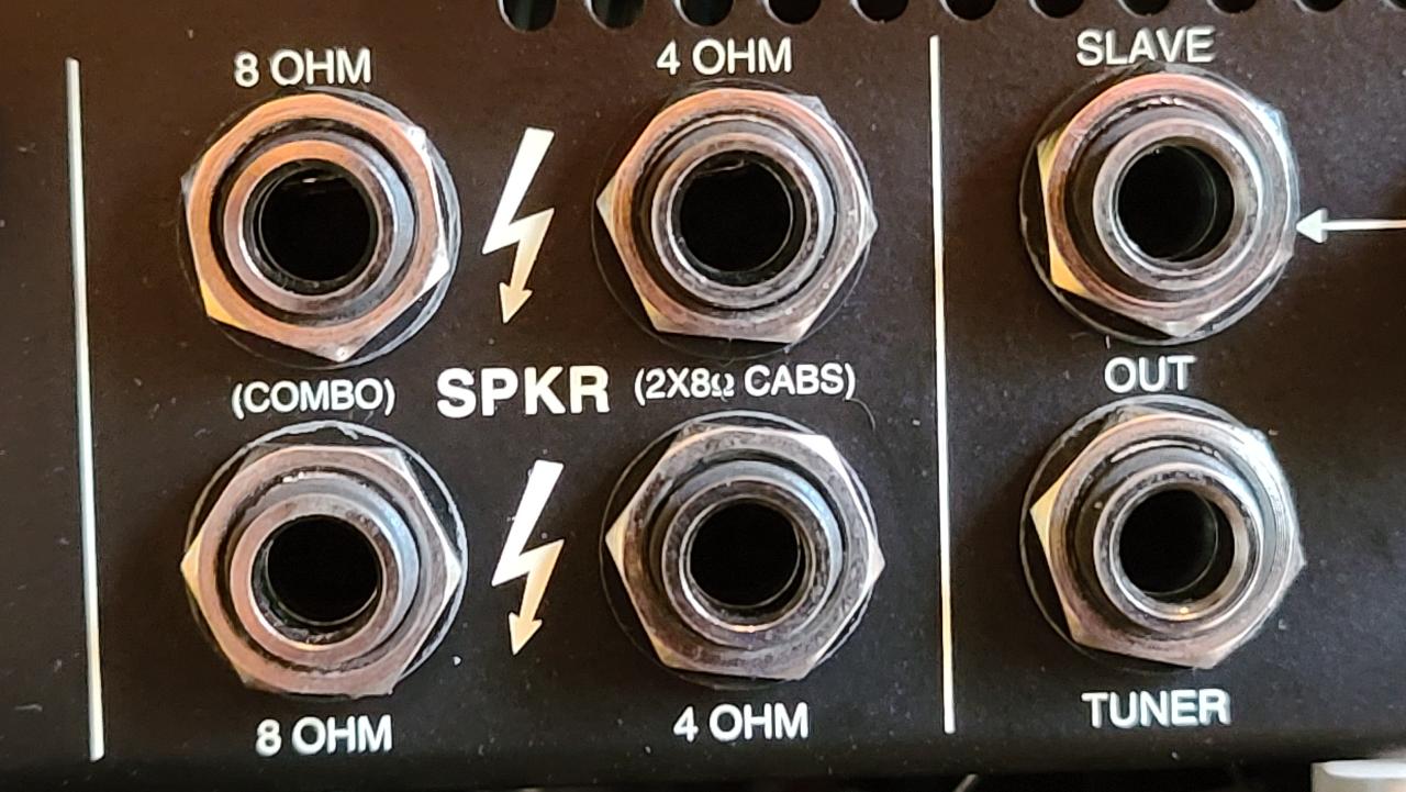 Two 4 Ohm and two 8 Ohm jacks are provided for speaker interfacing. The MARK V is not very sensitive to speaker mismatches and will not be damaged by them, except that very low ohmage loads will cause the power tubes to wear faster