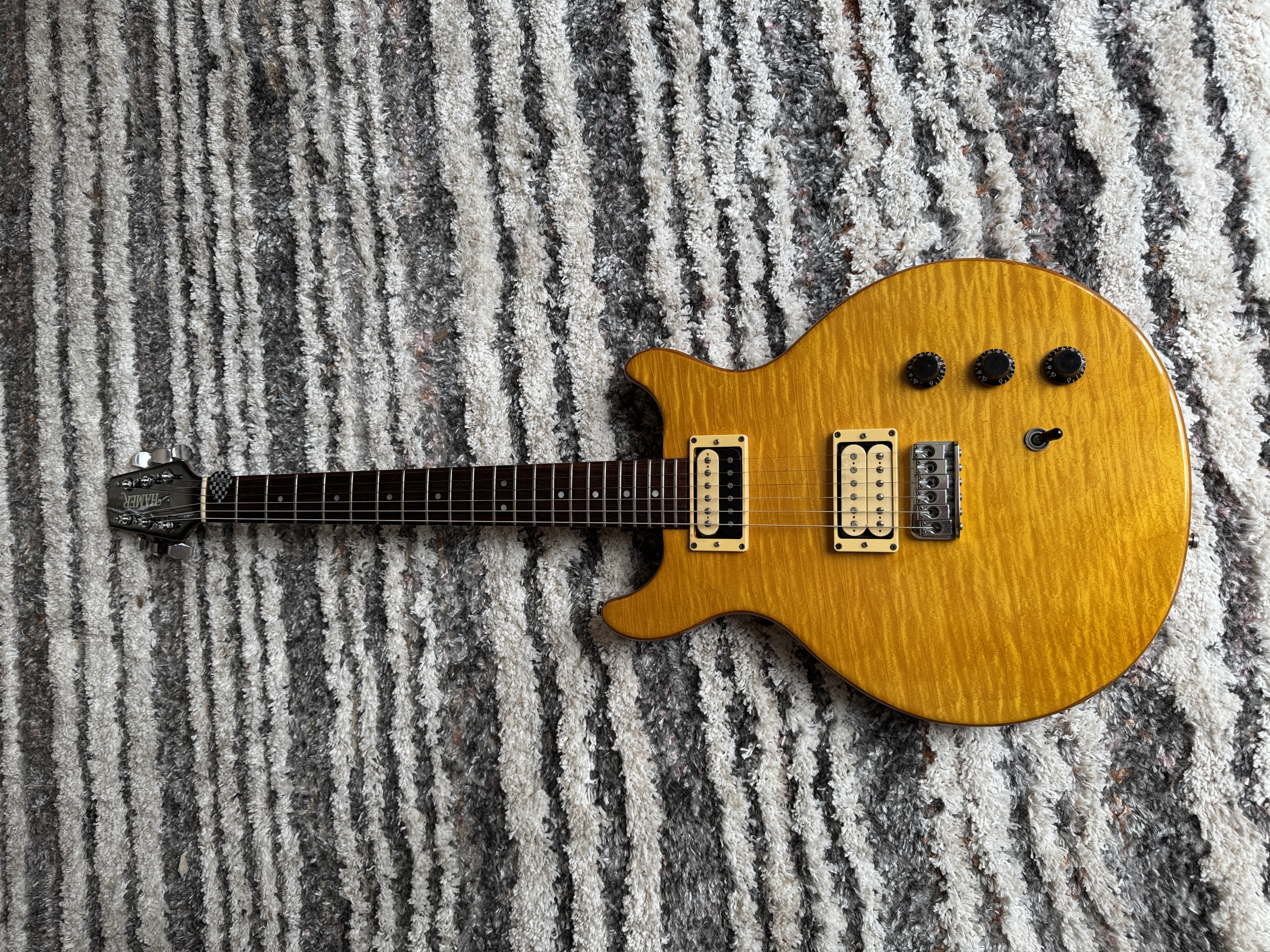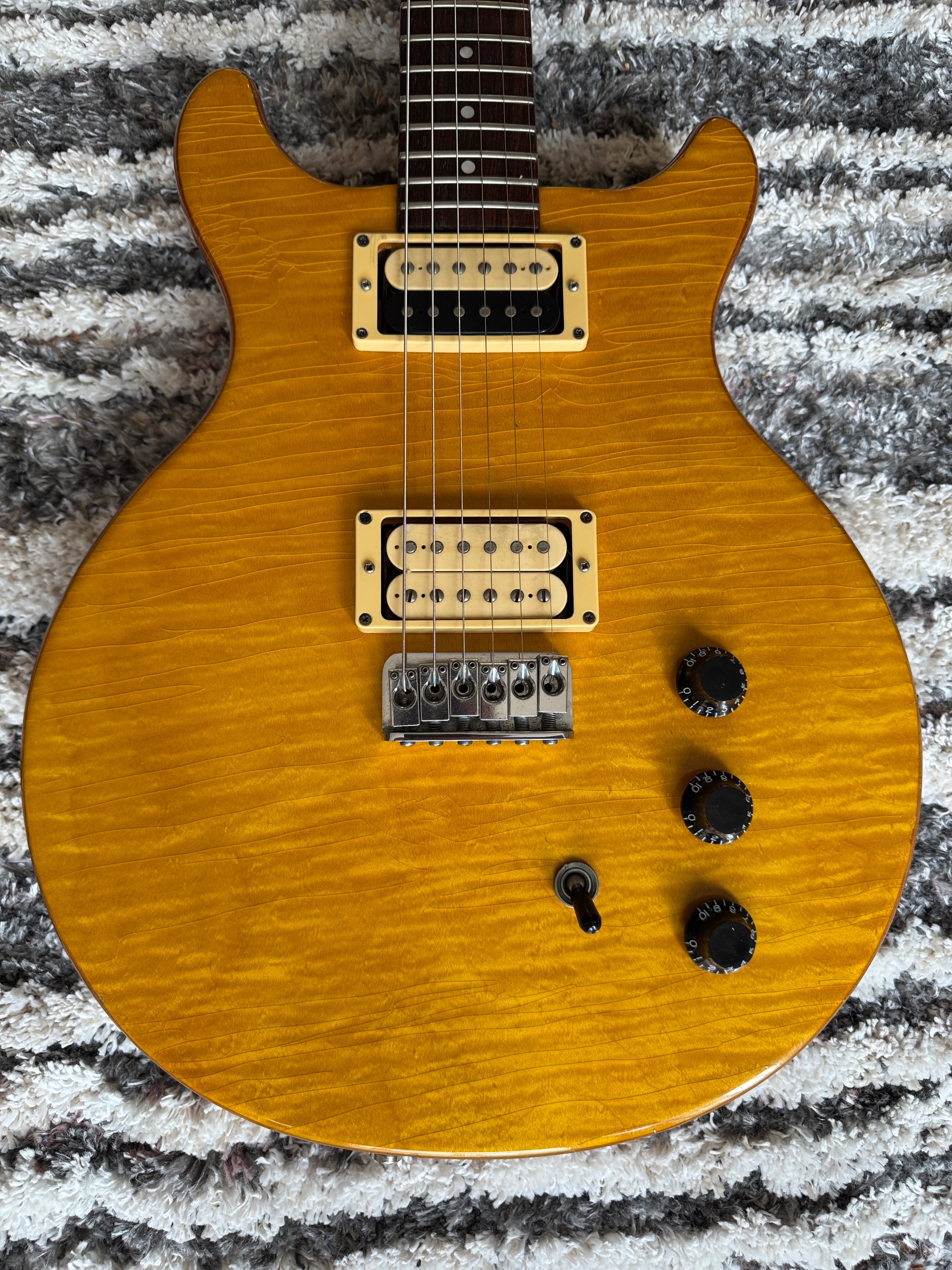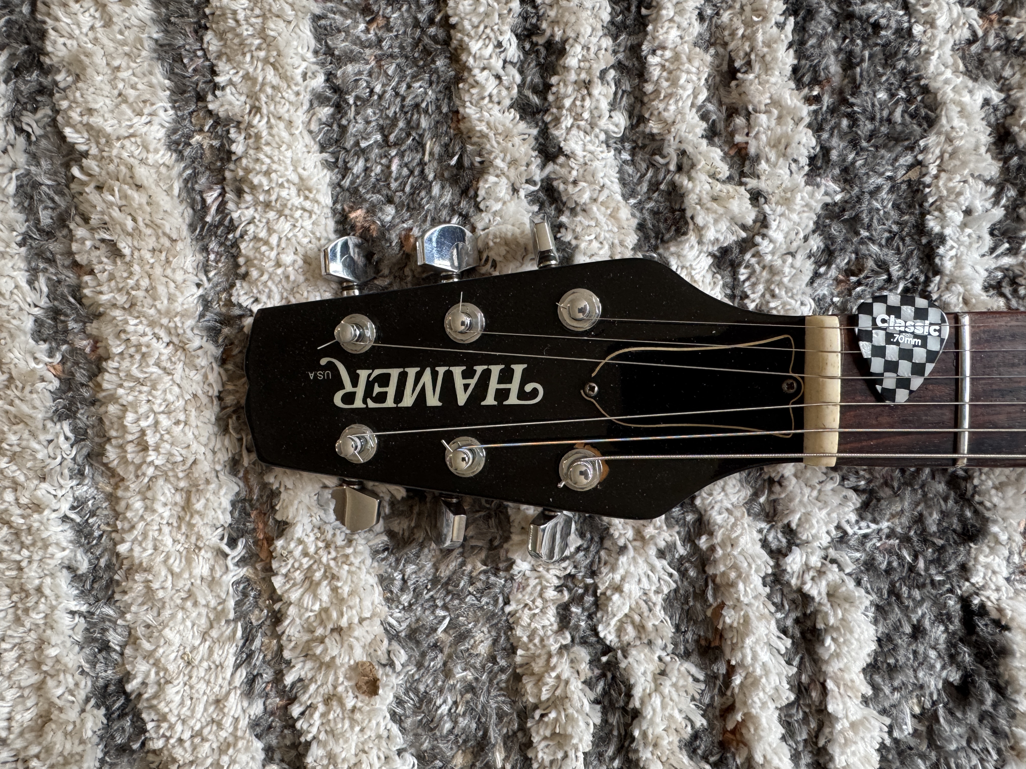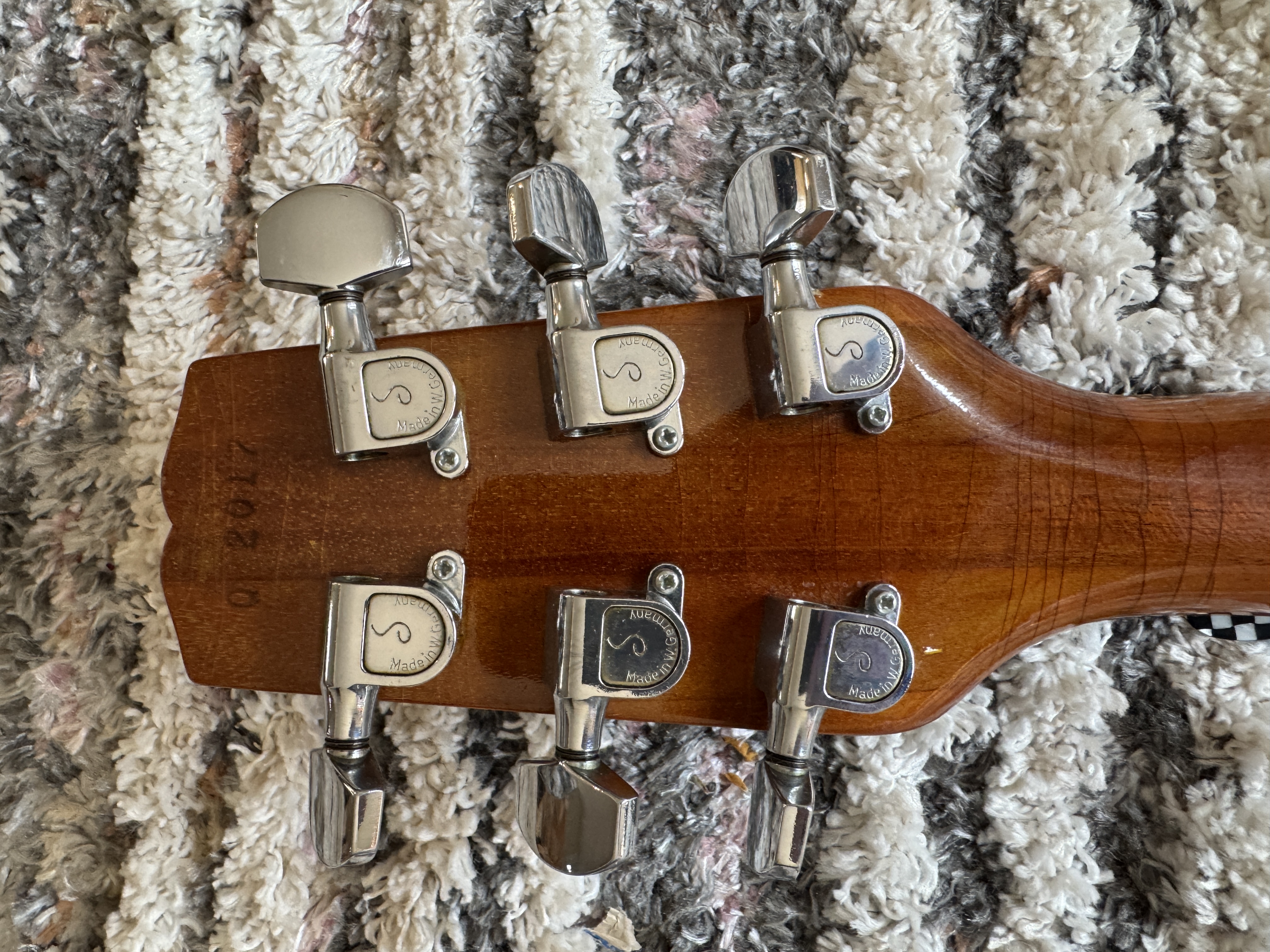 There is the usual wear on the back and sides including slight buckle rash and few superficial nicks (see photos). The body has finish-checking which is difficult to show in pictures. The case has wear along the top and bottom edges. Fret and nut wear are minimal.
