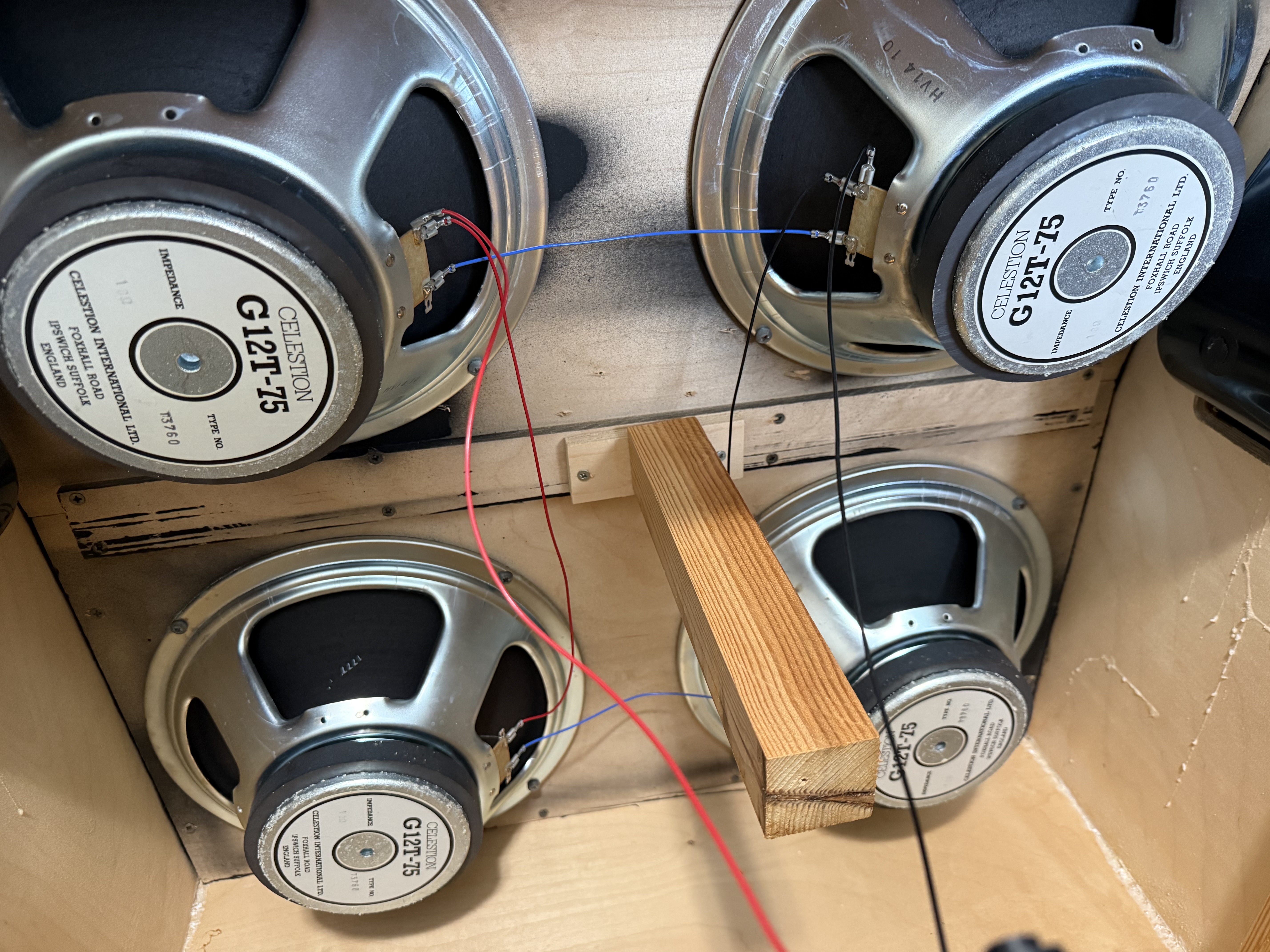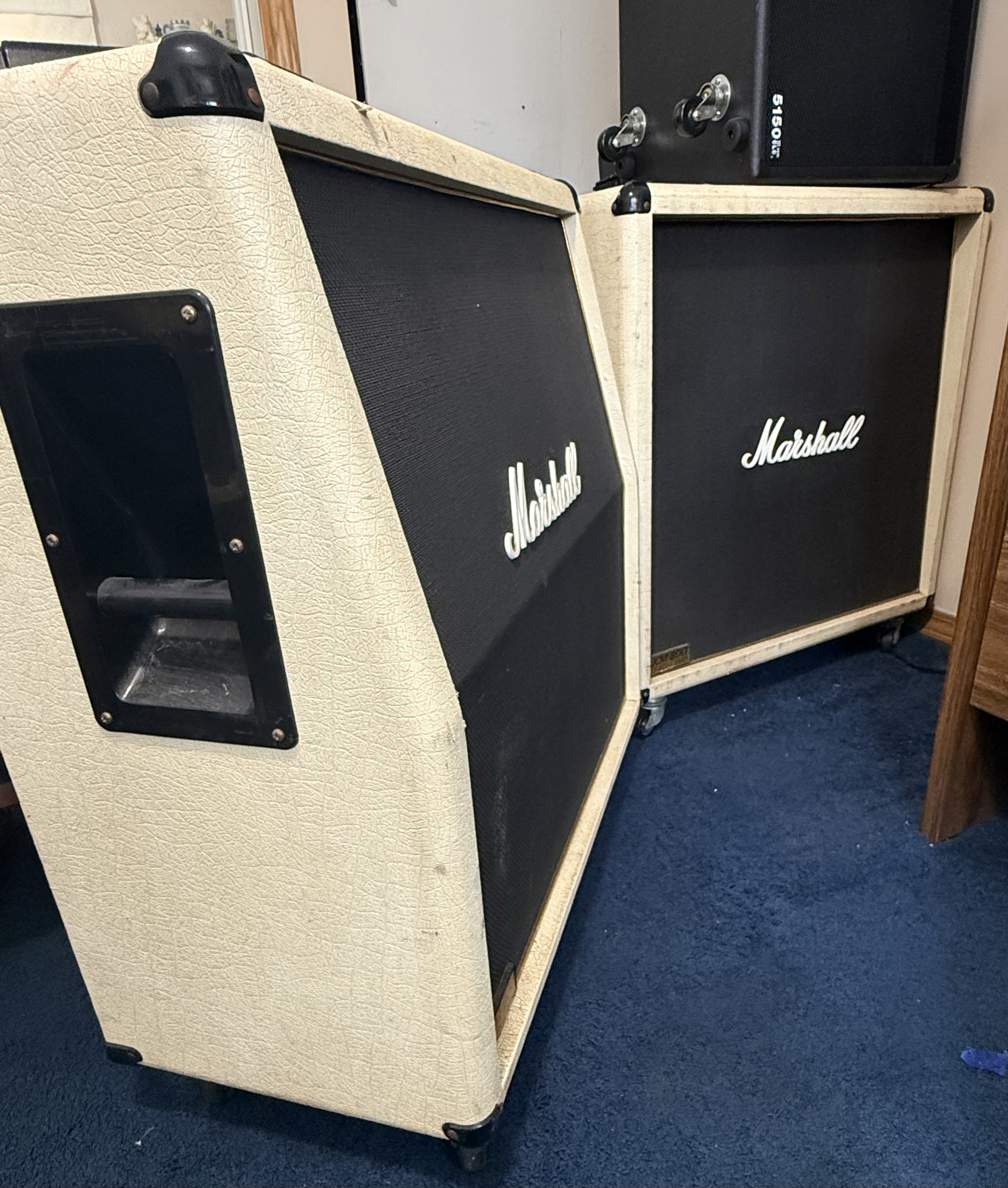 1987-jcm800-top and bottom Marshall cabinets in factory white tolex. Original celestion “white label” g12t-75’s in both.