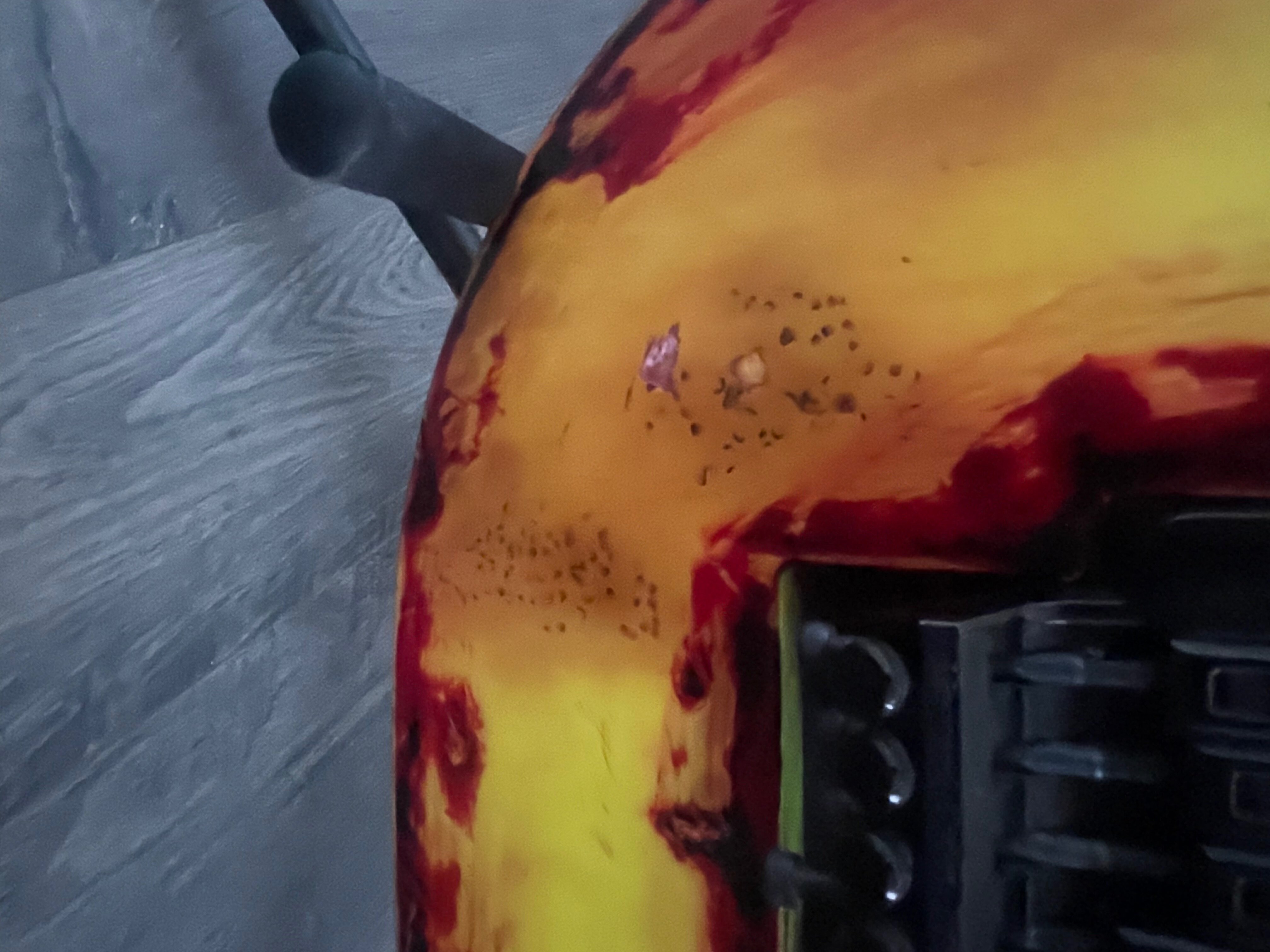 So this finish is Desert Sun yellow however someone made it their art project. it’s cool and all and I tried to remove the paint to reveal the original yellow underneath. I kinda got close and left it alone. I’m sure I can get that pesky red and black paint all off but it requires lots of patience. I might get back to it at some point, but enjoyed playing it so put it back together. But has a couple of dings as well. THe pickups are still there and the neck plays super fast, and has no issues. The frets have plenty of life, and there are no cracks or breaks on the guitar.