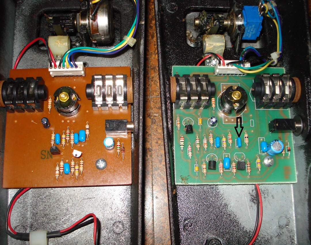 Hi, I recently picked up a 1990 Original CryBaby Wah pedal and I was trying to do the Lower range Mod but can not figure out which capacitor it is that I have to Change...There are 4 capacitors but this is not the standard layout board....I have included a picture to show what I mean....The board on the Left is like the layout they have now and the arrow is pointed to the capacitor I need to Change but can not figure out which capacitor it is on the board on the left.....I know it is not the two bigger ones it is one of the two littler ones.....If any can help me it would be greatly appreciated......Thanks