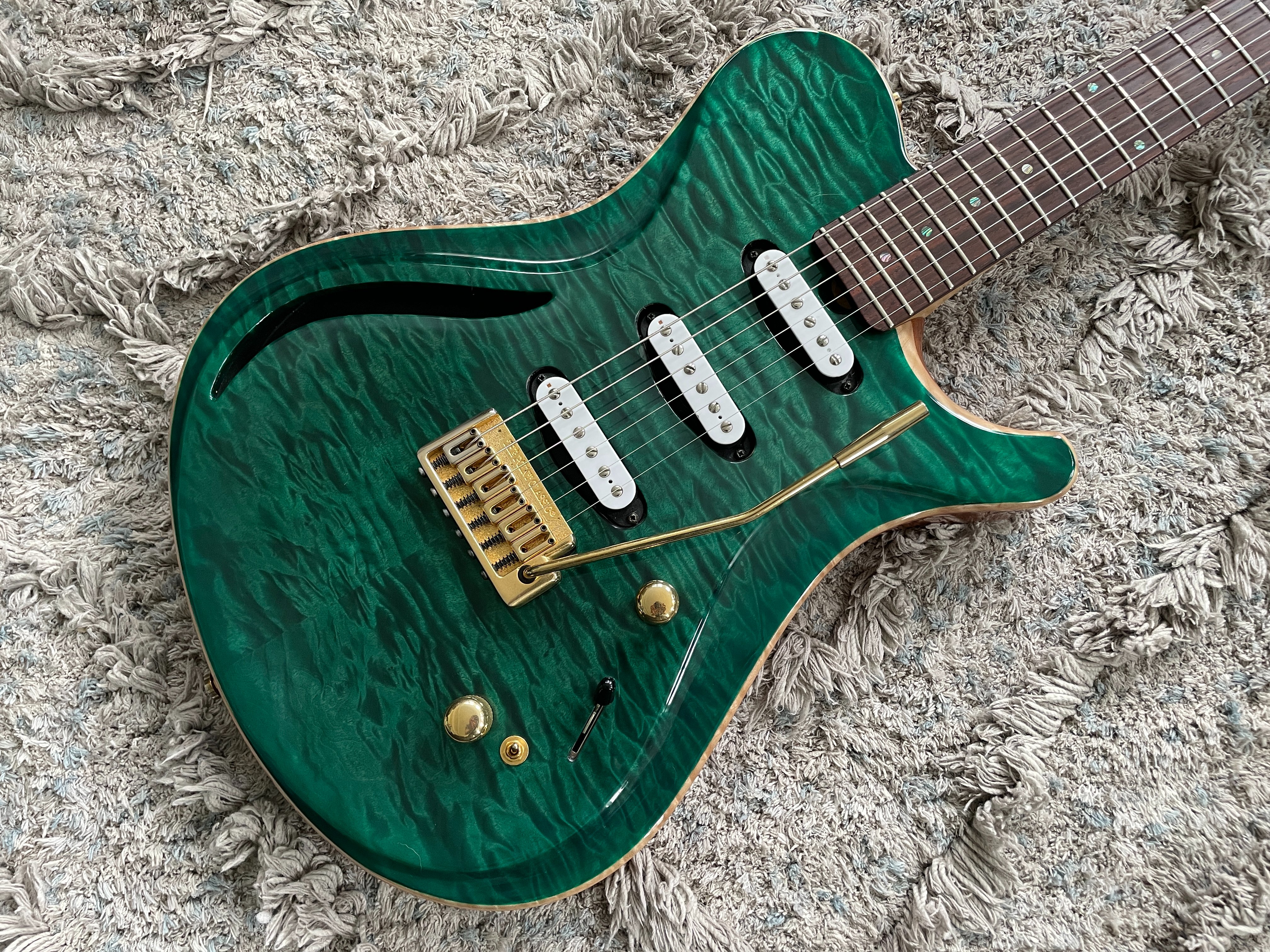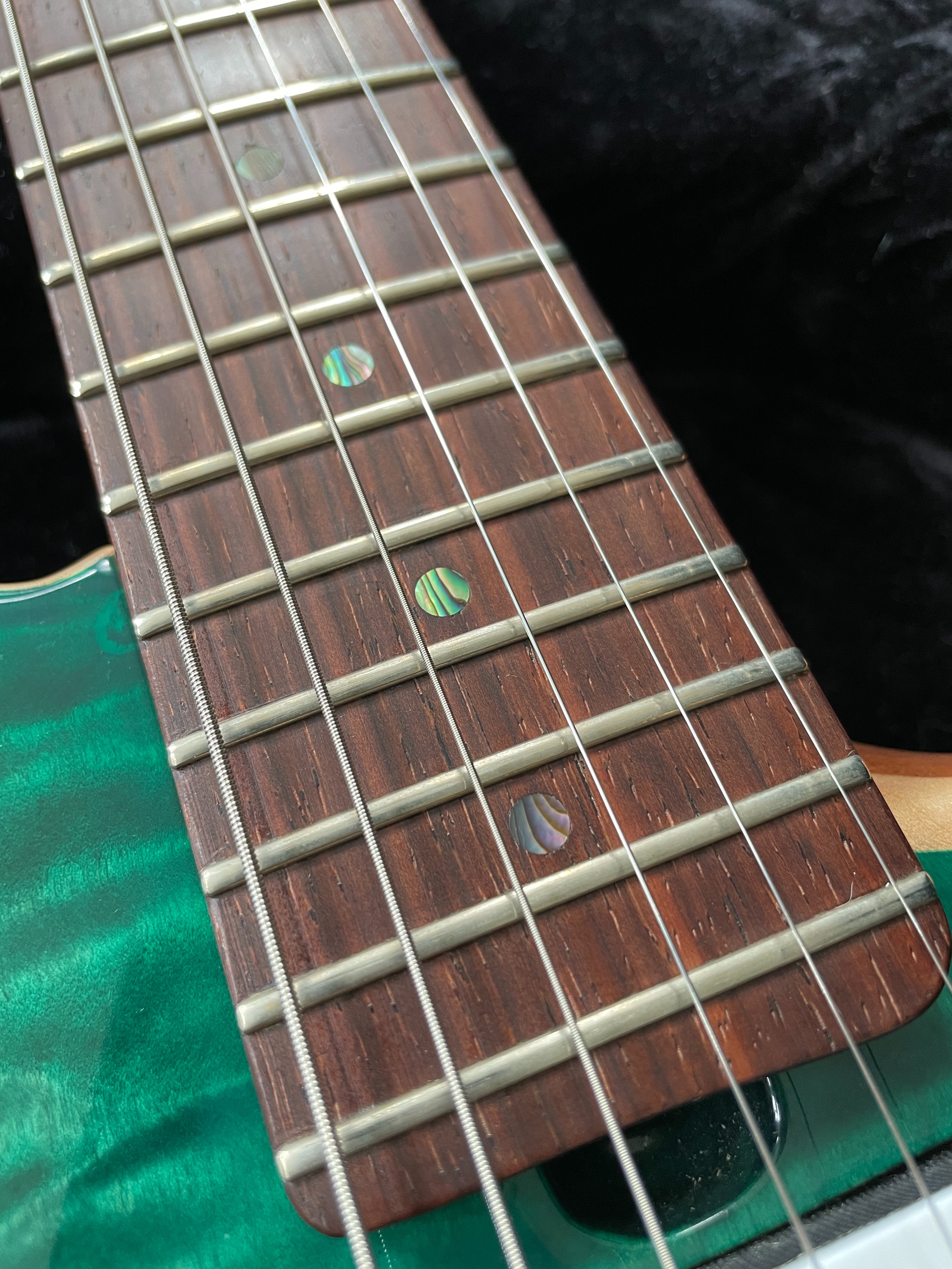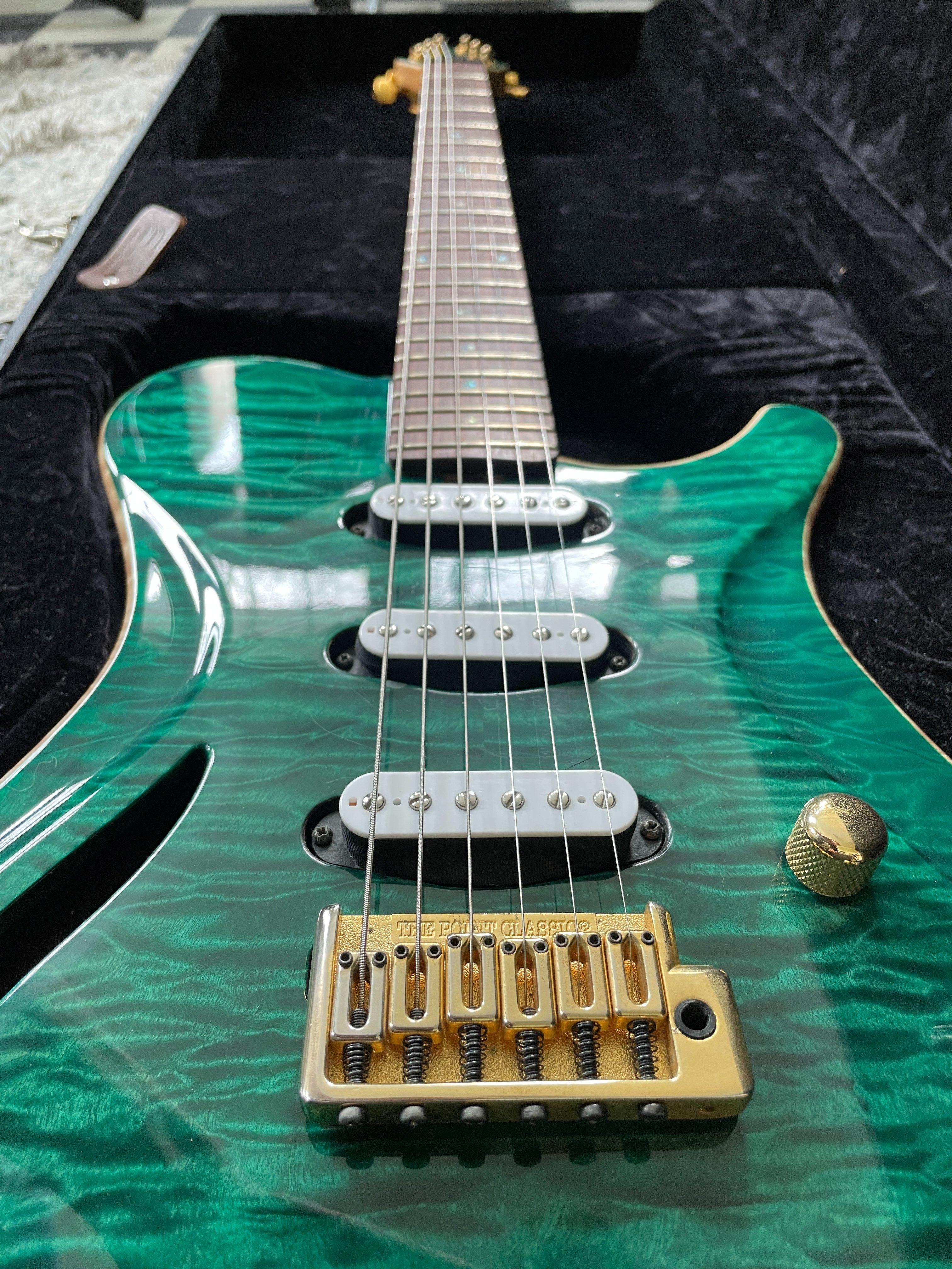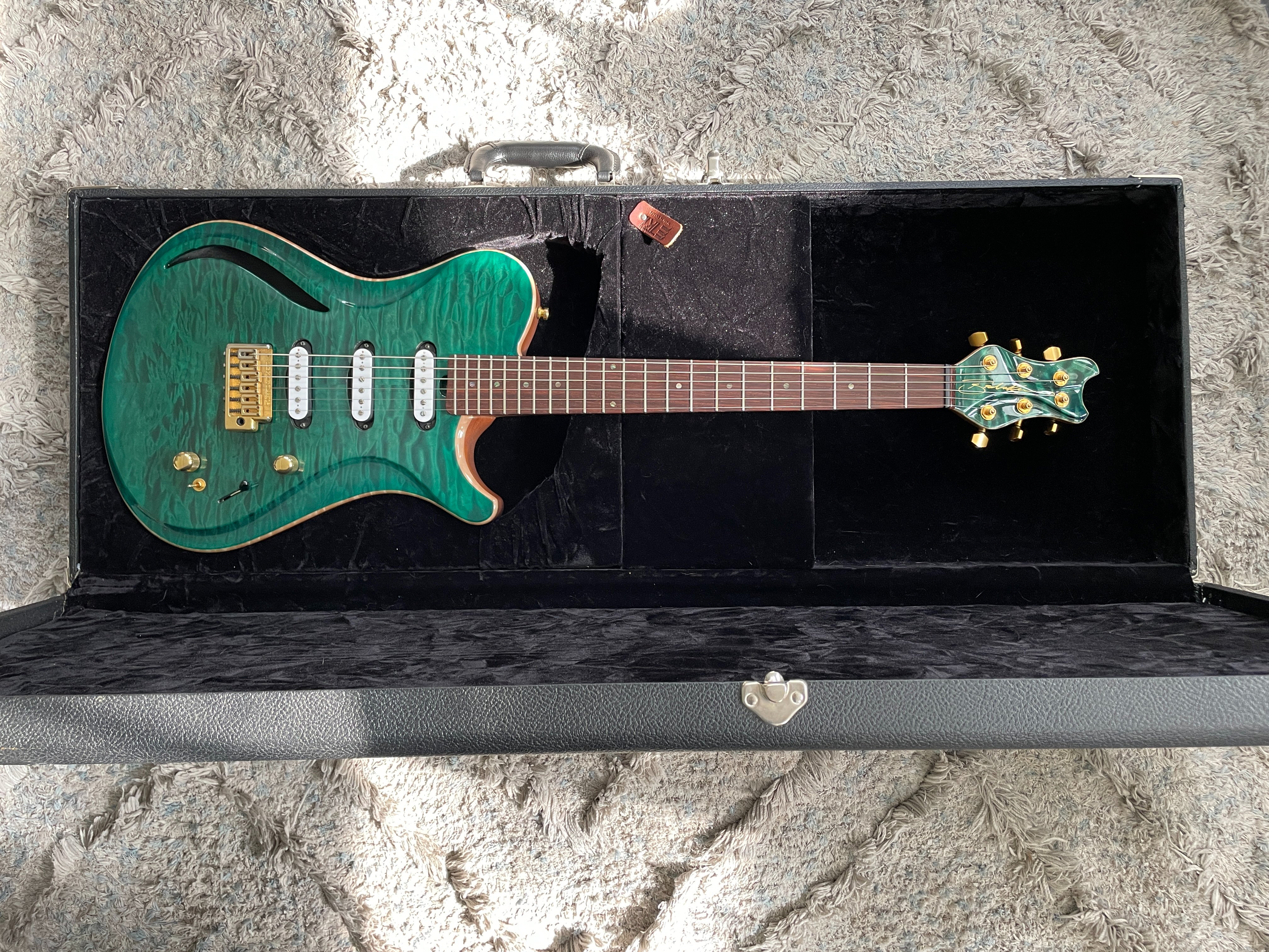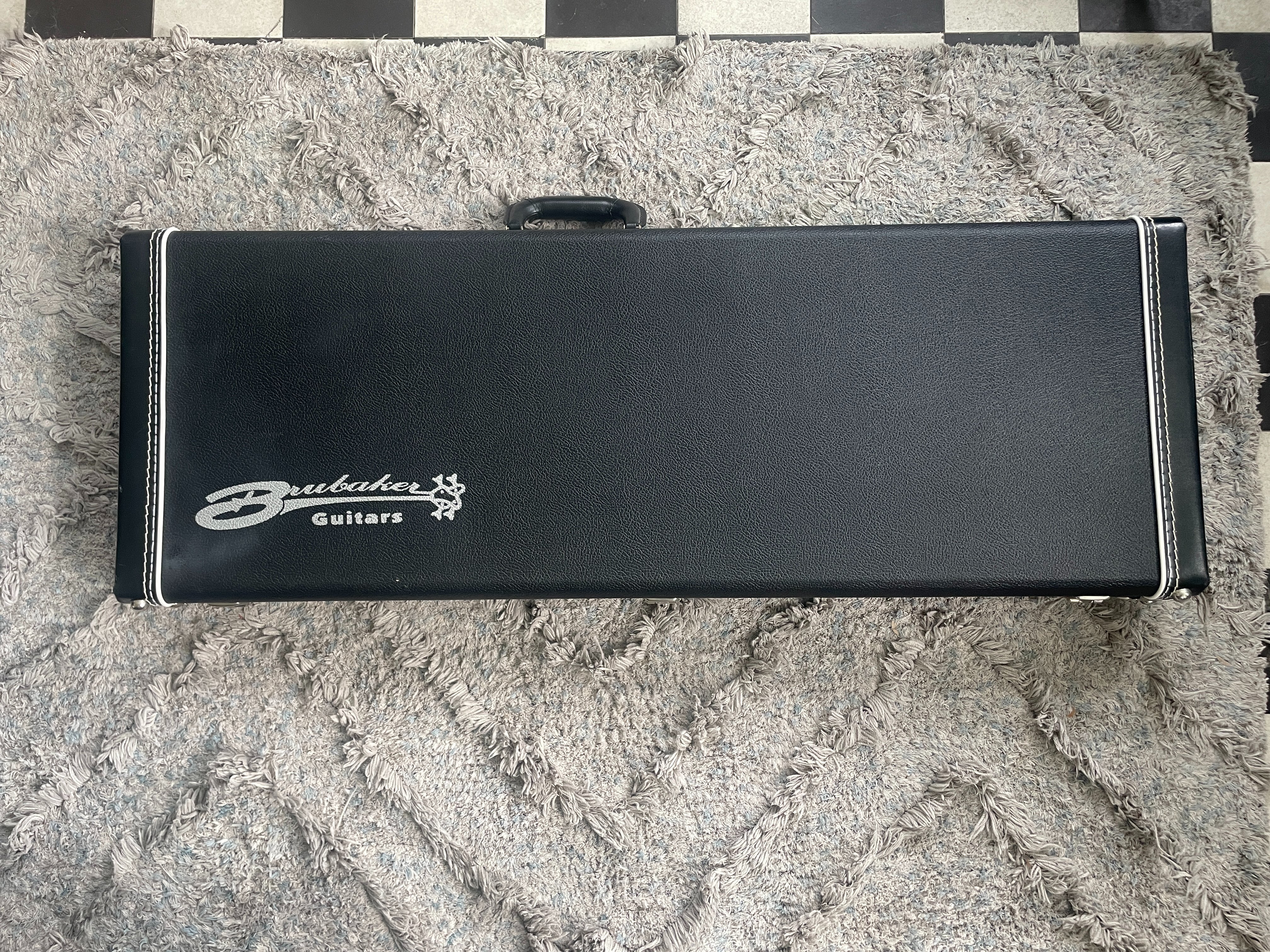 2001 Brubaker K-4 NC (Nashville Custom) in a beautiful green quilt top with gold hardware. I got this guitar in a trade and don't really play it much unfortunately. It comes with the hard case and original paperwork from Brubaker. It's currently strung with 11-52 NYXLs and the bridge is set up beautifully parallel to the body. The gold tremolo bar is included. Gold strap locks are included, though the hardware isn't as clean as it once was.
