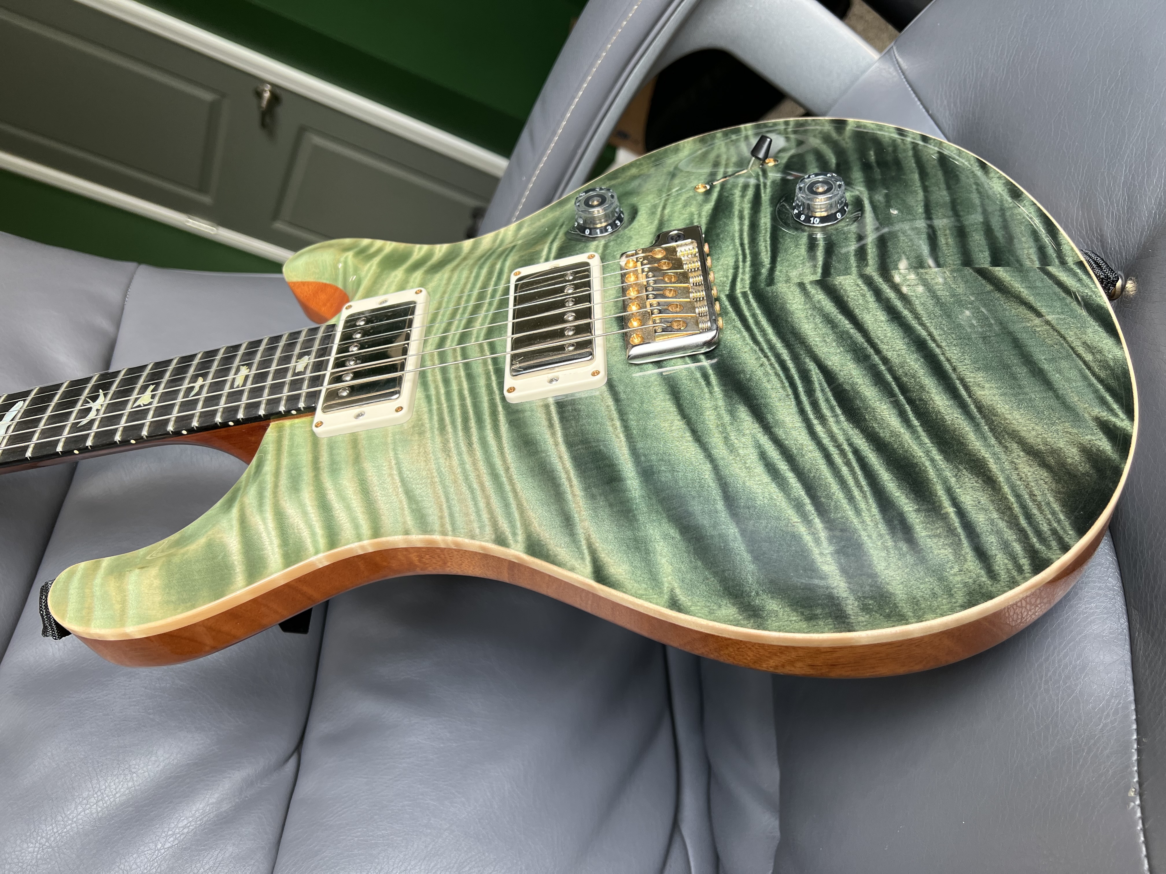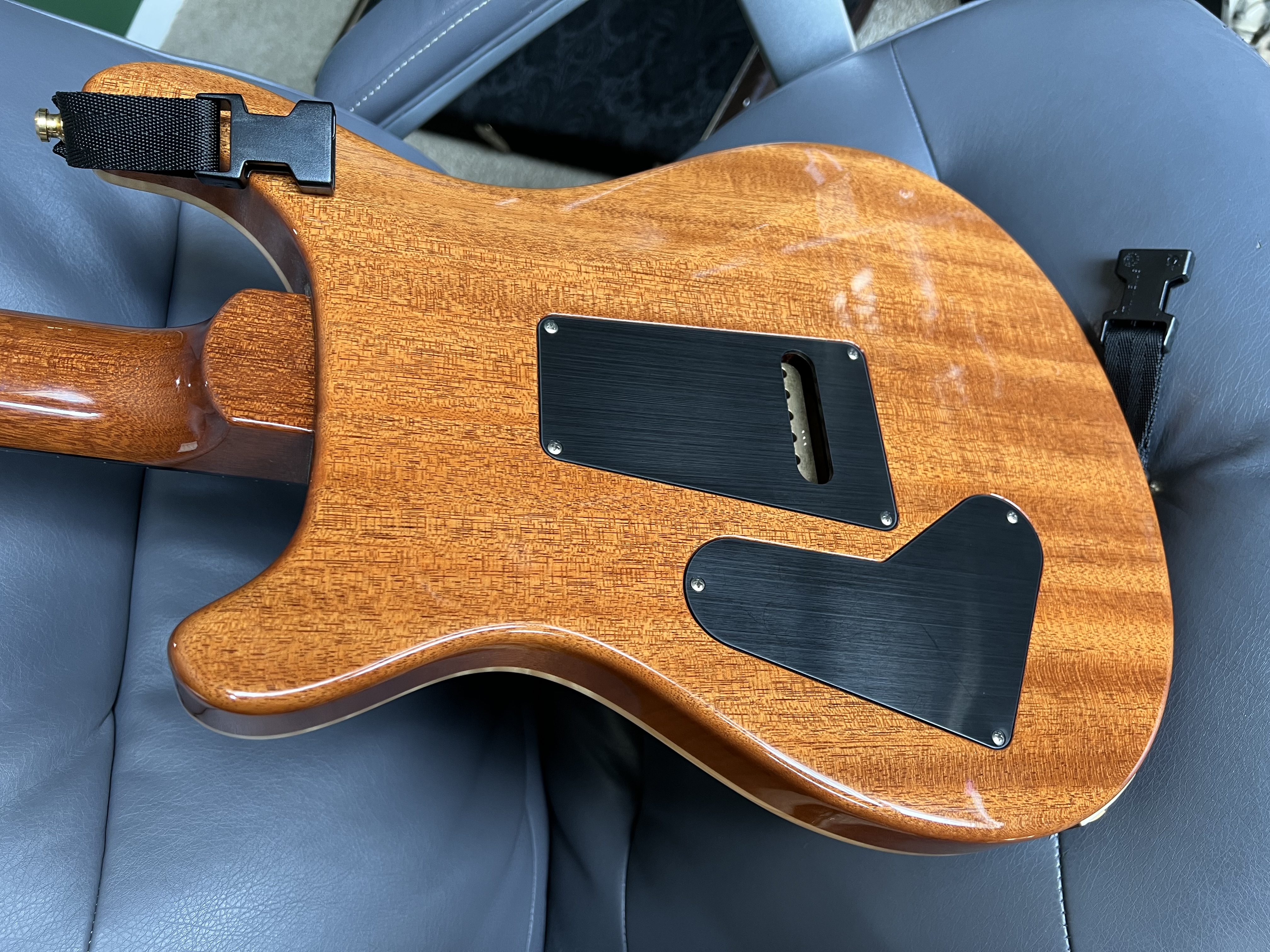 African Ribbon Mahogany back with a gorgeous fat flame maple top in Trampas Fade (rare)