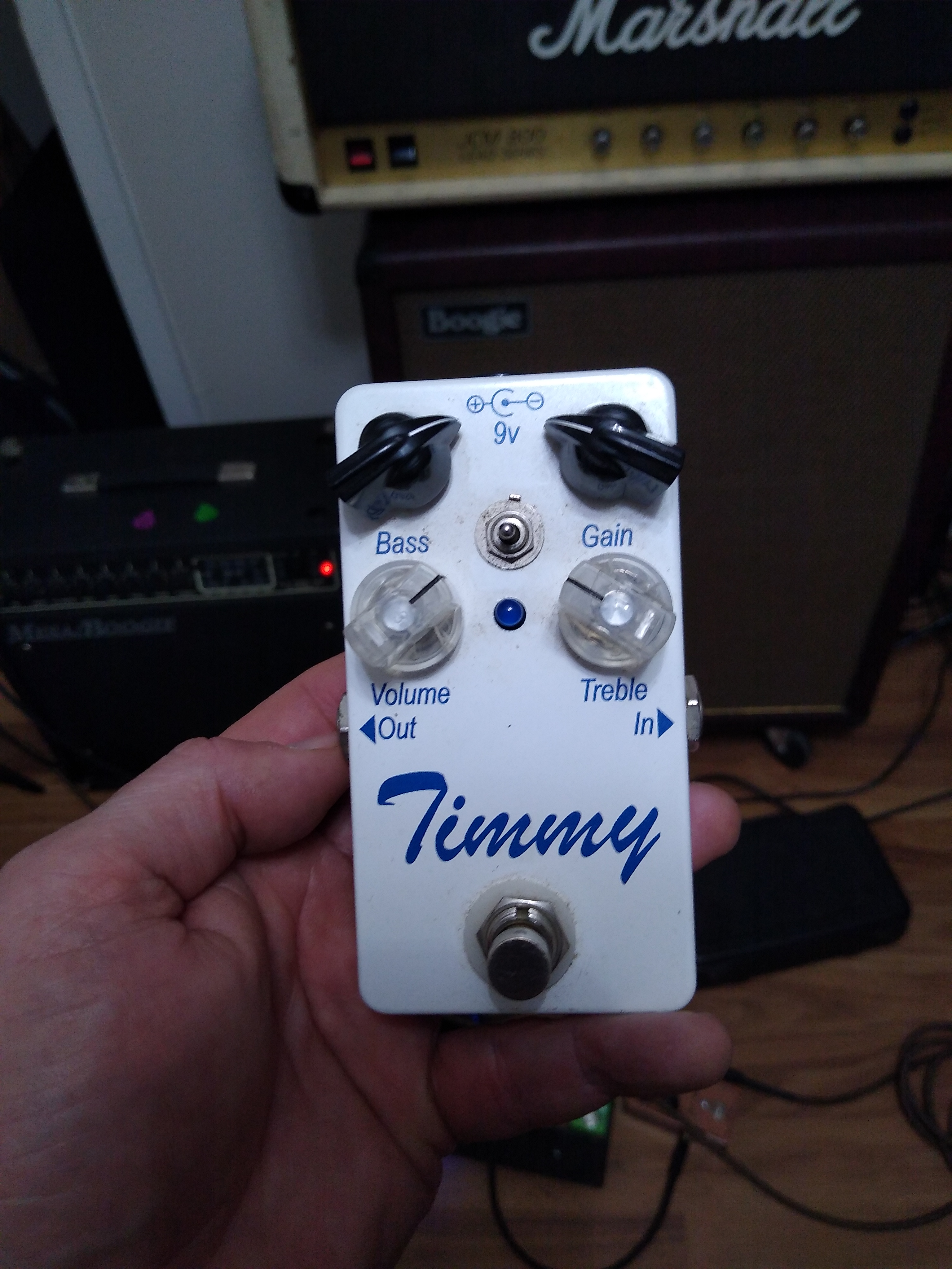 This one. Don't remember which dealer I bought it from. It basically sounds and behaves like all the other Timmys and Tim I had. The pic shows my normal settings for boosting a crunchy amp. The bass knob at 2 o'clock is actually quite a bit of bass reduction. The bass and treble knobs work in reverse. So, 7 o'clock would be full on bass and treble. Anything clockwise is subtracting those frequencies. Bass is pre gain. Bass at 1-2 o'clock is a bit fatter than tube screamer territory, kinda like a Klon with the gain at 9 o'clock, but tighter than both. And the Jam Ray is even tighter. Just got mine home and will be working on a video.