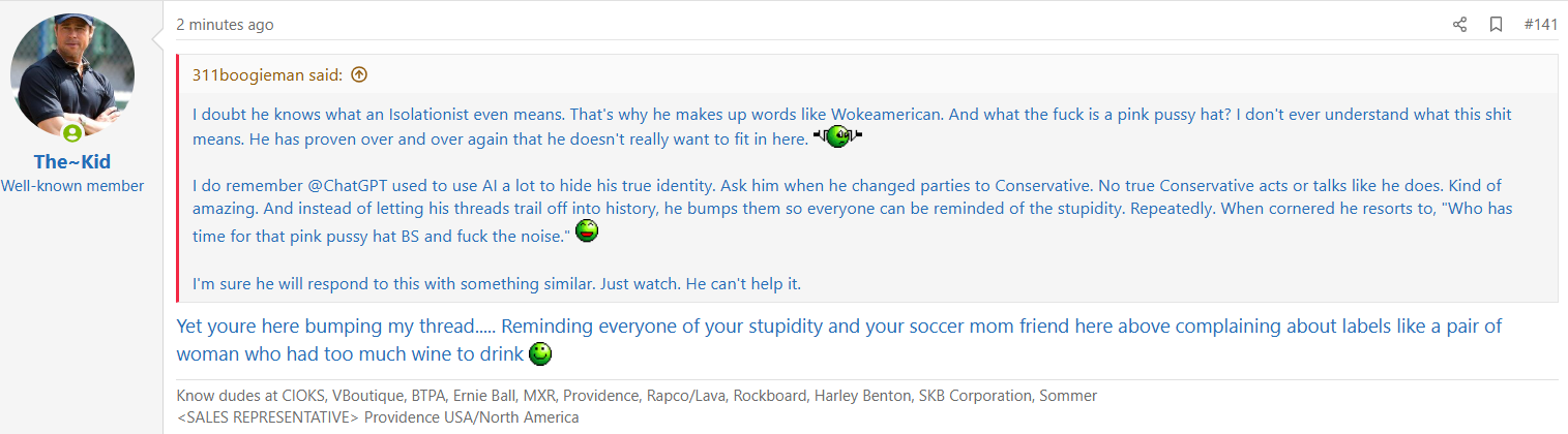 I do remember @ChatGPT used to use AI a lot to hide his true identity. Ask him when he changed parties to Conservative. No true Conservative acts or talks like he does. Kind of amazing. And instead of letting his threads trail off into history, he bumps them so everyone can be reminded of the stupidity. Repeatedly. When cornered he resorts to, "Who has time for that pink pussy hat BS and fuck the noise."