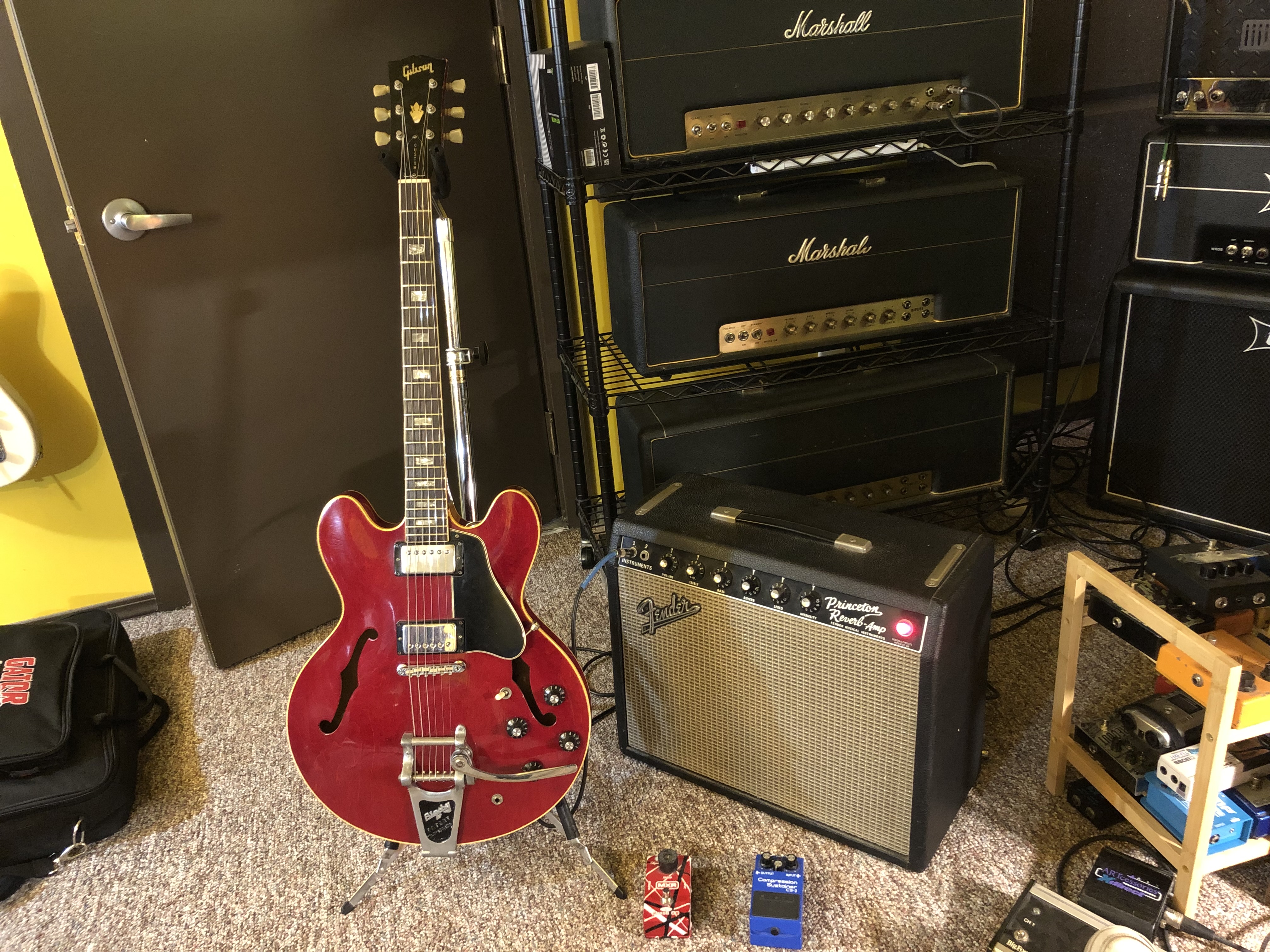 The ES and amp are my wife’s. I get to use them anytime. She has a ‘64 or ‘65 Deluxe Reverb that I use sometimes. This Princeton, I can’t believe how good it sounds. Sat in the corner a long time before giving it a real go. Really great with the ES and even my Ibanez John Scofield. That 70’s classic rock stuff with the ES type guitar is one of my favorites.Wow niiiiiiice rig. I use an Edwards ES w/57 classics into a Rockett Blue Note into a Twin and it definitely gets the job done, clean or mild OD. I have two separate amps with different speakers in each one and they both sound great now that I got all the bugs out! Even with the amp cranked and the Blue Note set with Gain and Volume at about 1 o clock it will still clean up nicely with my guitar volume knob. I have done about 800 gigs with that arrangement now sometimes just plugging straight in but the Blue Note makes a pretty nice boost with a wide range of low OD tones. So many other tones are available just by mixing the pickups and playing with guitar's tone knobs but I'm sure I'm preaching to the choir telling you!