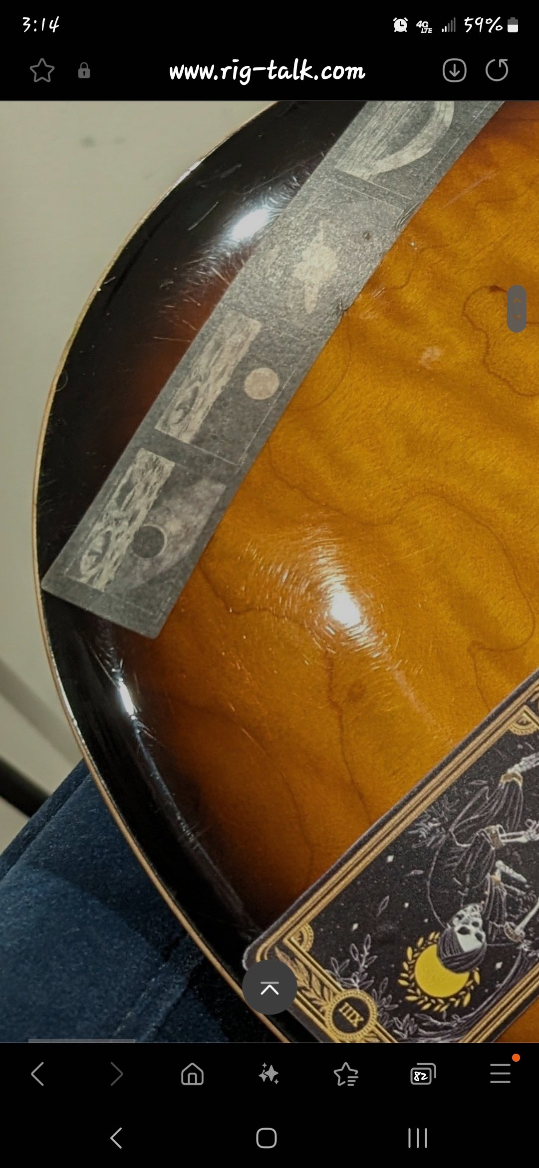 Here's one more crushing blow and the one that bothers me the most. The lower horn and hand contour was masked poorly.. And then finish put over it.