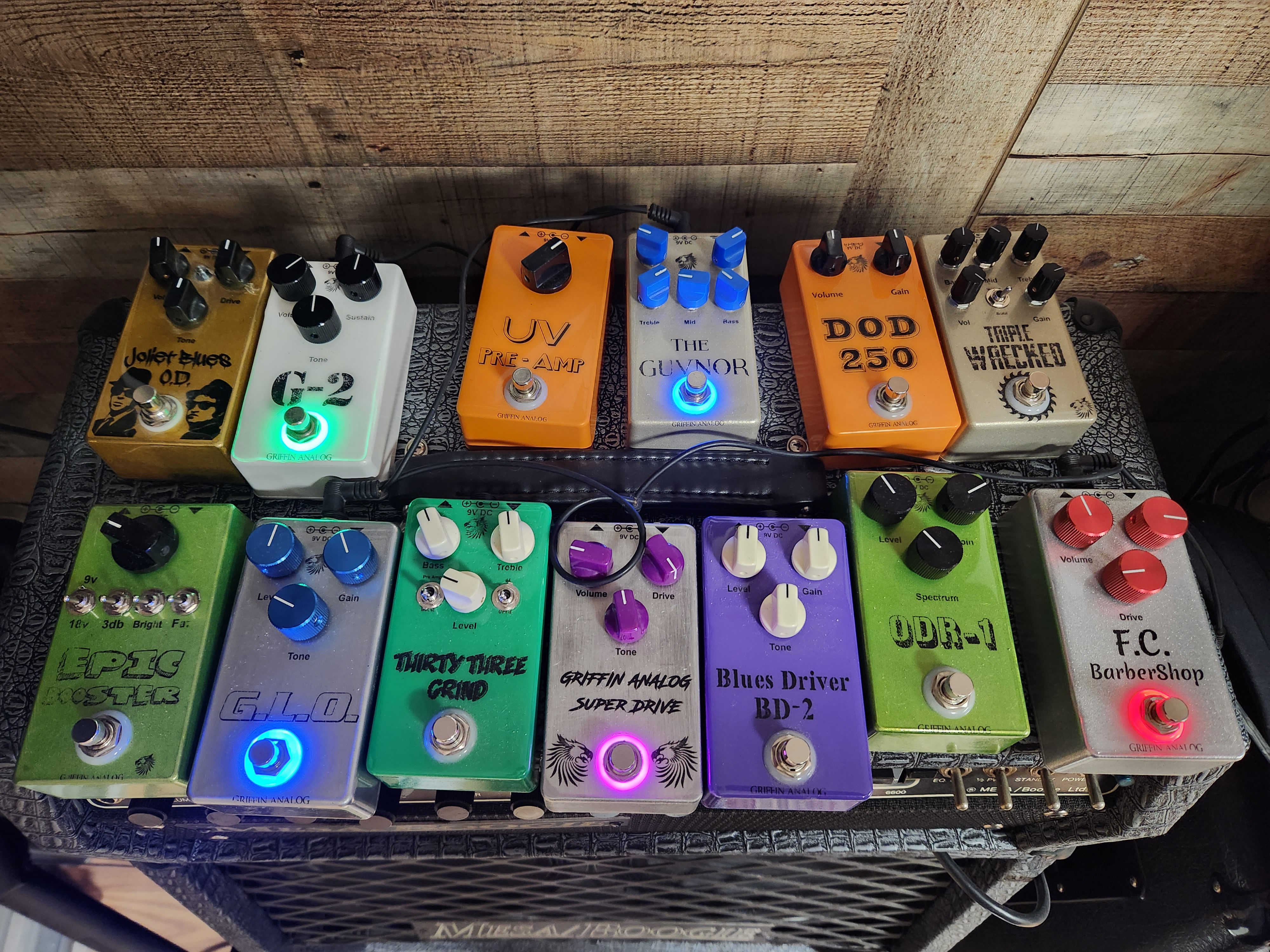 EP Booster ( with all the fixins ) , Greer Lightspeed , Fortin Grind/33 , Boss Sd-1 , Boss BD-1 , Nobles ODR-1 , Fairfield Circuitry Barbershop
