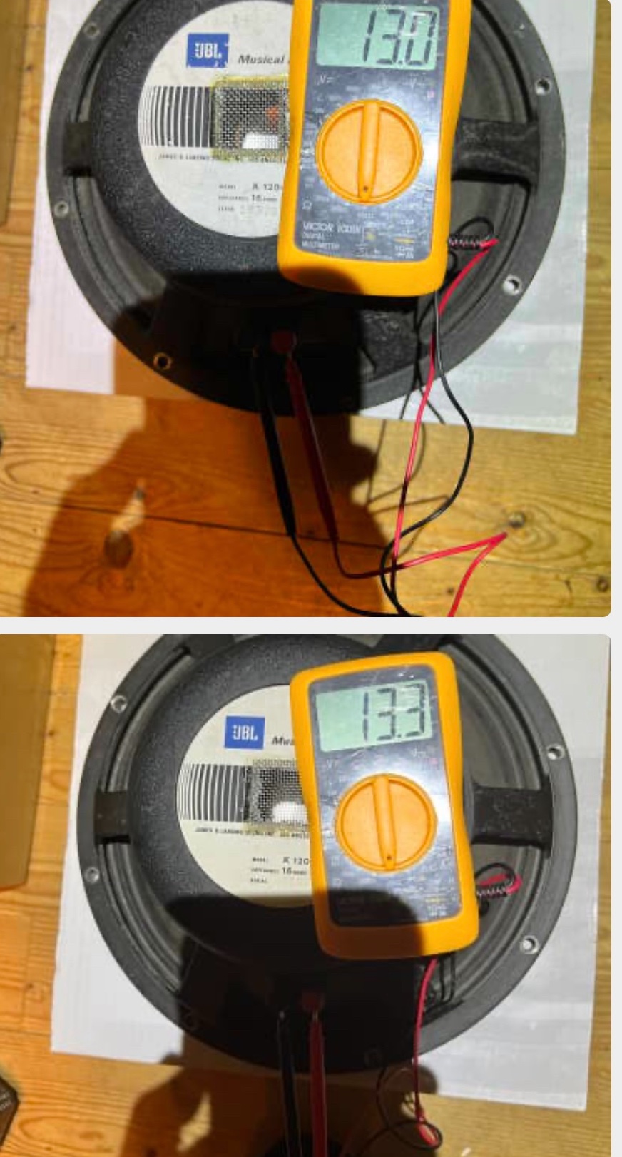 (2) JBL k120 16 ohm - Replacing these with D120, but these sound insanely good- especially paired with redbacks- one dust cap is dented in, but this is easily fixable with tape, and doesn’t affect sound