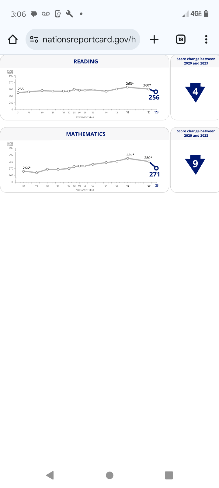 The juvenile here is you...... Ignoring actual data, facts and real science..... Nvm ignoring common sense like the simple data and facts presented by the Nations Report Card.I assume you’re taking about me. If so, we’ve discussed this. I’m not woke and if there was a reliable measure, I’d gladly compete with you to evaluate levels of common sense. Stop with the childish name calling and accusations. If you want to debate a topic, fine. If not, let the adults converse. At this stage of the game, I have zero fucks to give. If you want to continue with the juvenile bullshit, at some point I’ll just go scorched earth.,,![]()