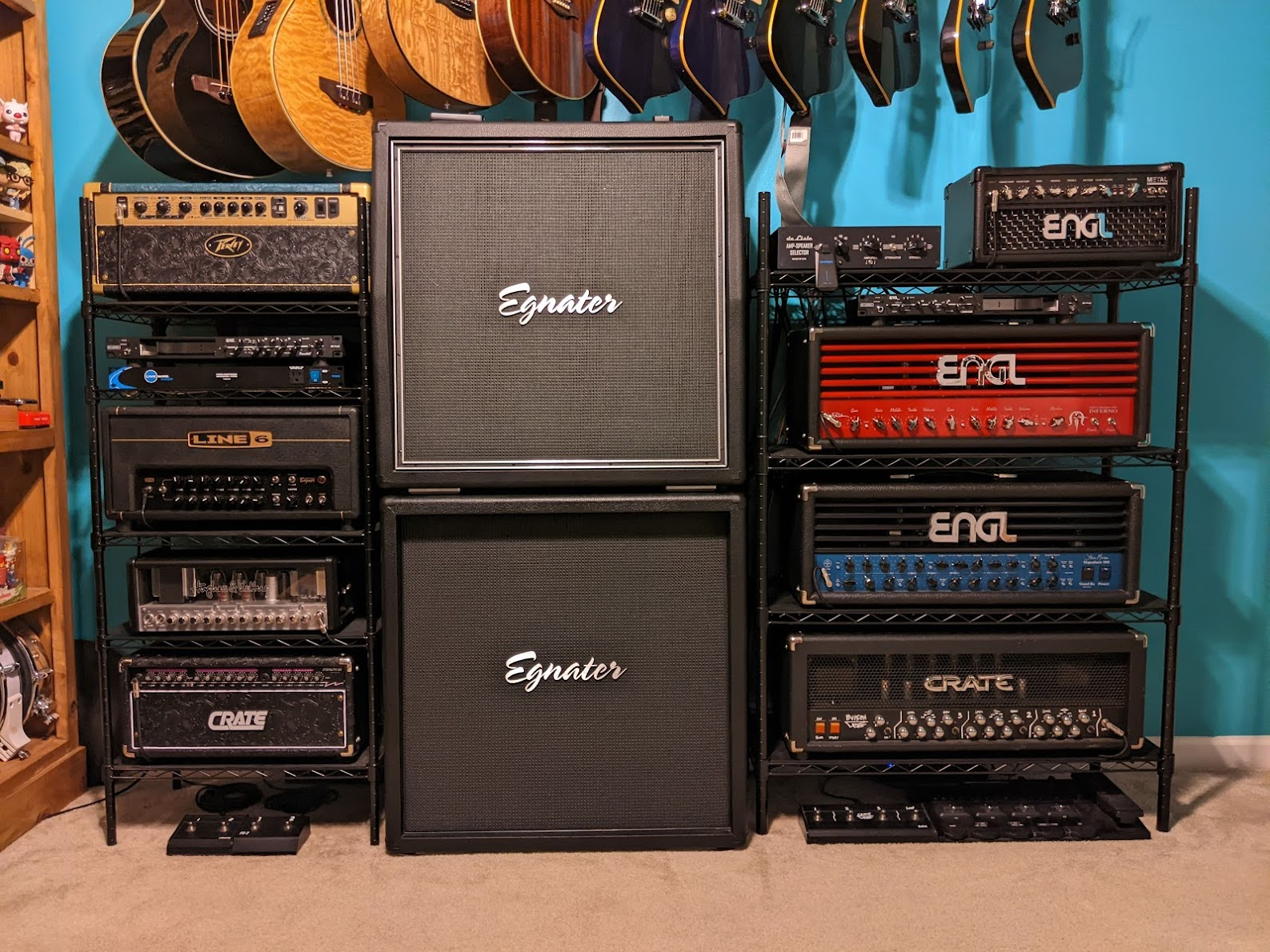 The Engl heads look awesome with one red one blue . If you’re patriotic get a white Powerball 2 . Would look cool afI use those wire shelving units from home depot. I put some 1/8 in plywood on the shelves so the amp feet sit a little better than directly on the wire.