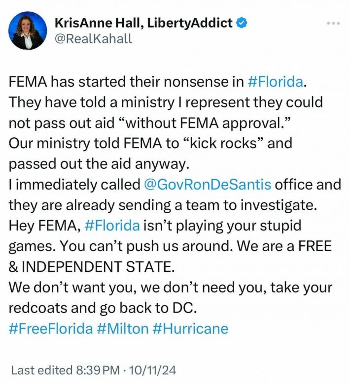 I would believe these people before I believed anything gobernment officials are saying.Yeah, every disaster news reporter and serious fundraising organization has said that FEMA is blocking them for handing our. Not sure what the deal is or what's going on (I'm not there).