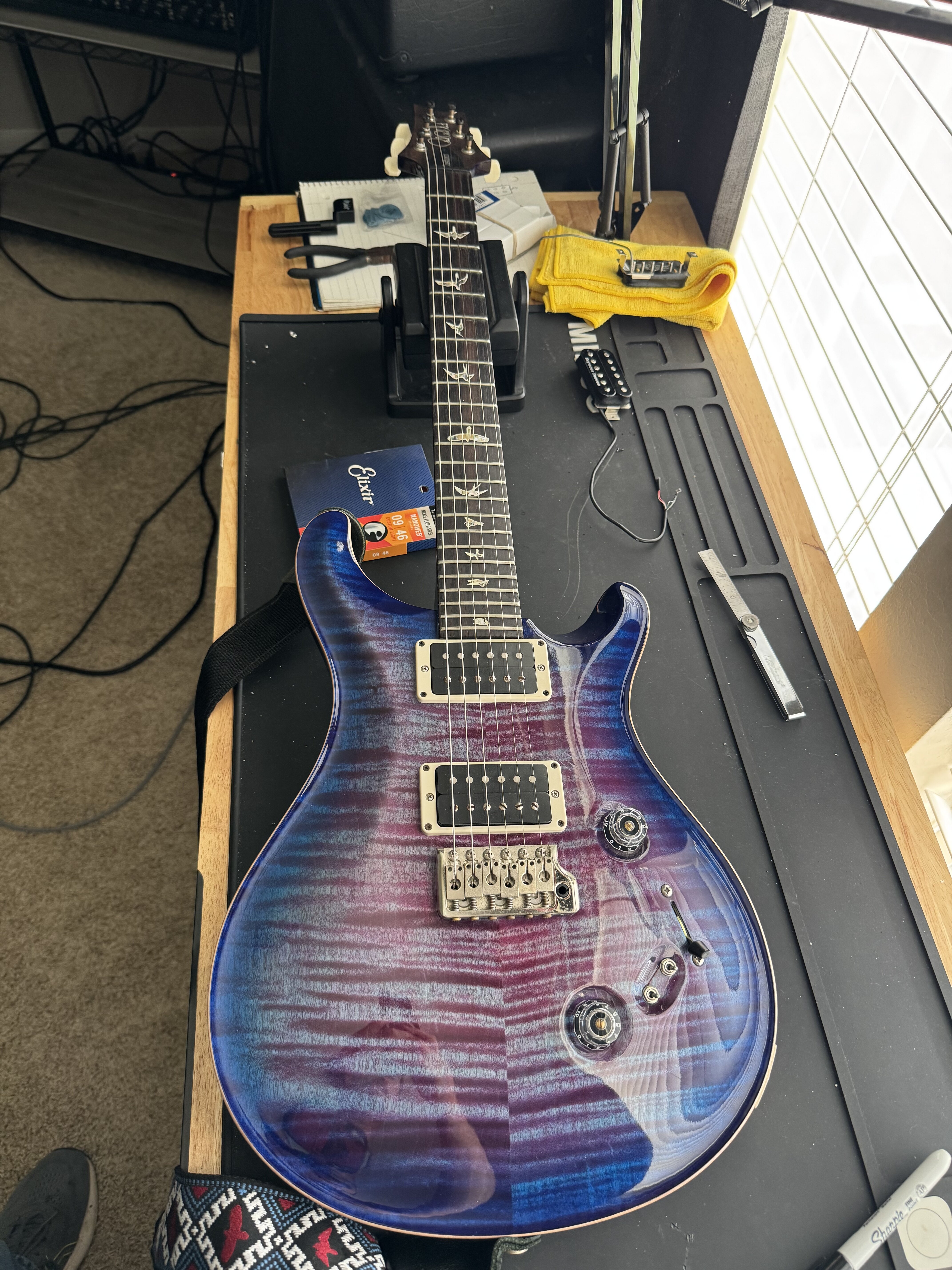 So hot off the heals of trading my LukeIII for a Suhr Modern, this morning I traded my PRS 594 Singlecut (I have two others) for a PRS Custom 24 with an interesting purple-burst with 85/15. My last C24 had the pattern thin neck, this one’s a pattern wide. Sounds great through all the amps!
