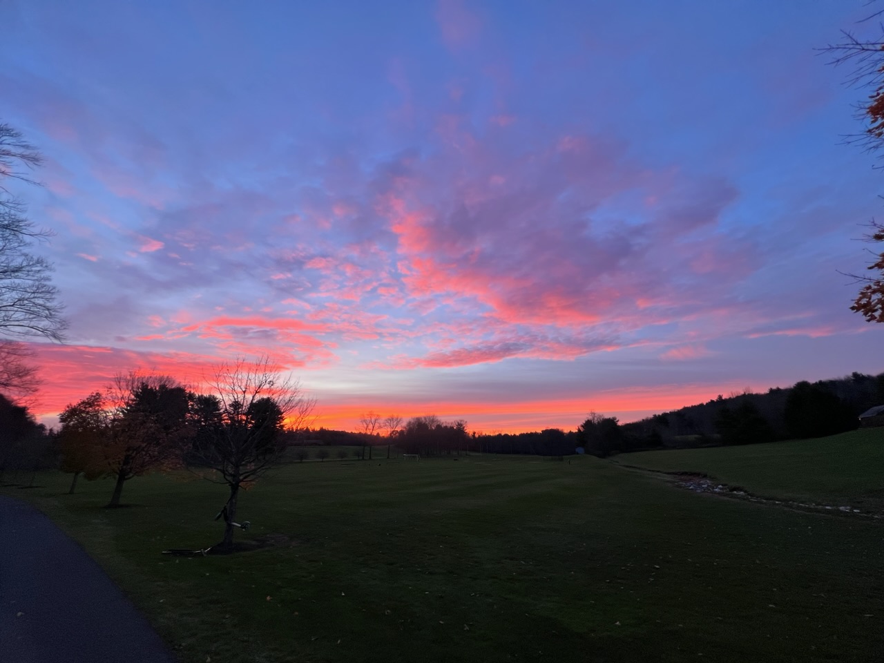 Sunrise: all summer it comes up behind my 40ft barn, don’t see it till about 10am. Now rising further south (and even with the time change) it’s beaming into the bedroom window about 8am. Sleeping in gets harder *sigh*Still pretty this morning, this was looking opposite direction from the pic in my OP