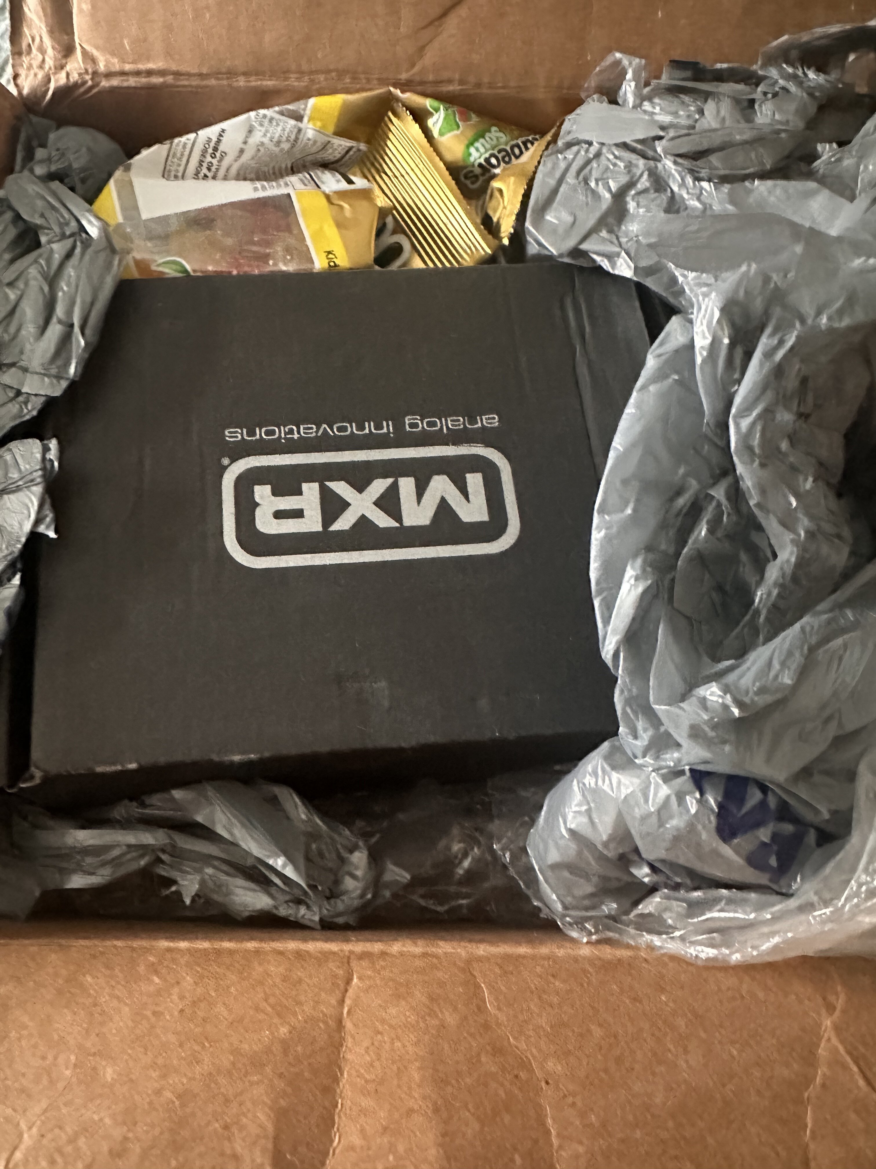 My boo japetus done went and hooked me up… mxr 10 band eq, some sour gummy bears that my daughter ganked…and a bottle of voodoo sauce bbq sauce…. Gonna be laying down some tasty jams with some serious bbq eq action….