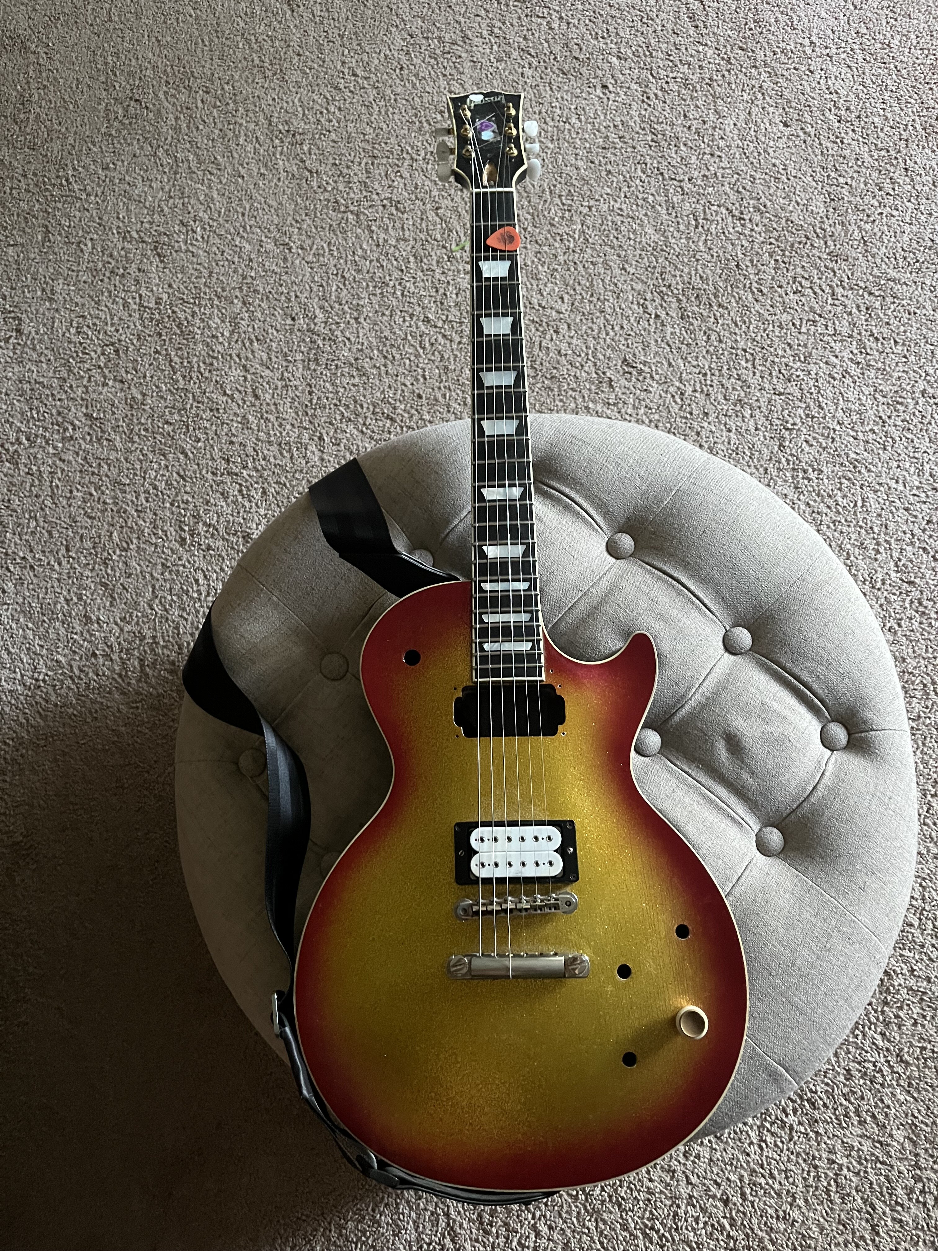 10+ lbs as pictured?? Also, why top wrap only the D string?View attachment 416671Not stock any longer over the years (only the wood is untouched…relatively) but this is 1997 Gibson CS Sparkleburst not unlike Steve Stevens’s pre-Knaggs. Ebony board, real pearl inlays, 10+ lbs. Uniquely, has a smaller 1.65 nut width, which I’m grateful for.