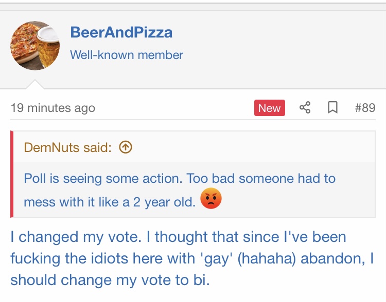 I changed my vote. I thought that since I've been fucking the idiots here with 'gay' (hahaha) abandon, I should change my vote to bi.Poll is seeing some action. Too bad someone had to mess with it like a 2 year old.![]()