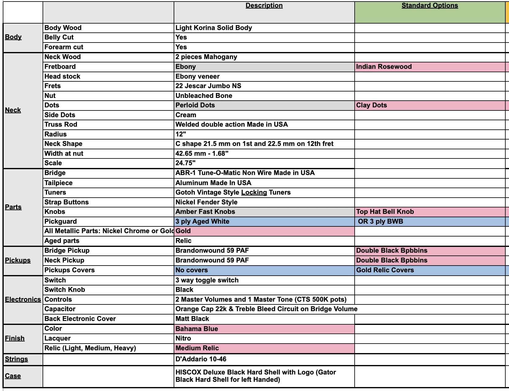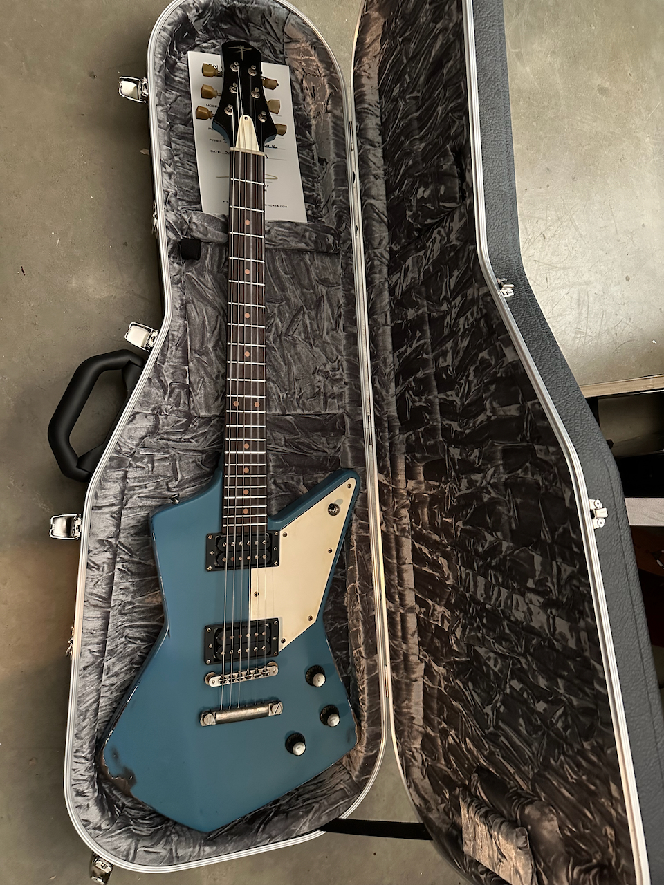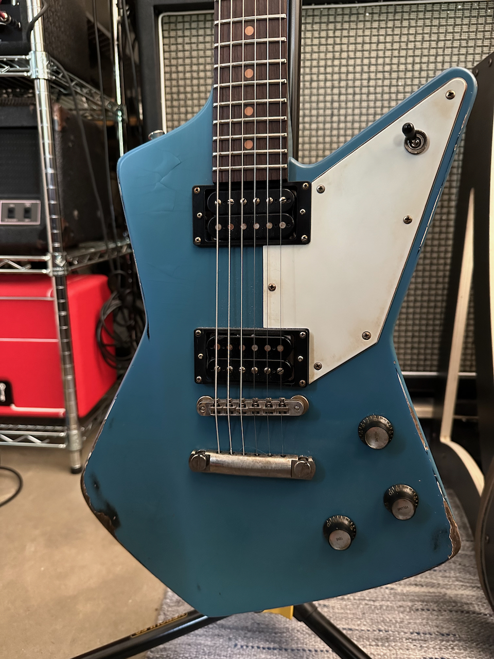This one is in Bahama Blue inspired by an old Explorer I had seen. I've attached pictures in a few different types of light to show off the color. It plays really well and is just a comfy lightweight guitar. Full specs pictured below.