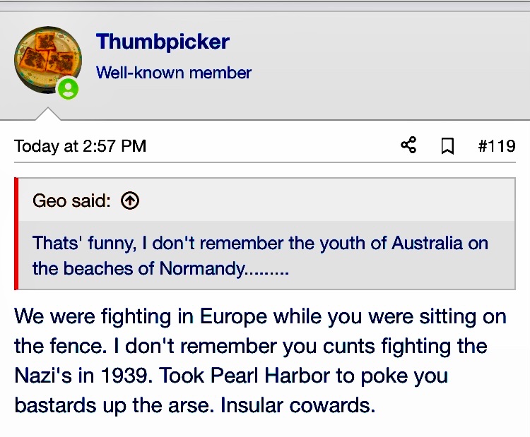You have quite an attitude for a midget accountant from dingo ate my baby land.We were fighting in Europe while you were sitting on the fence. I don't remember you cunts fighting the Nazi's in 1939. Took Pearl Harbor to poke you bastards up the arse. Insular cowards.
