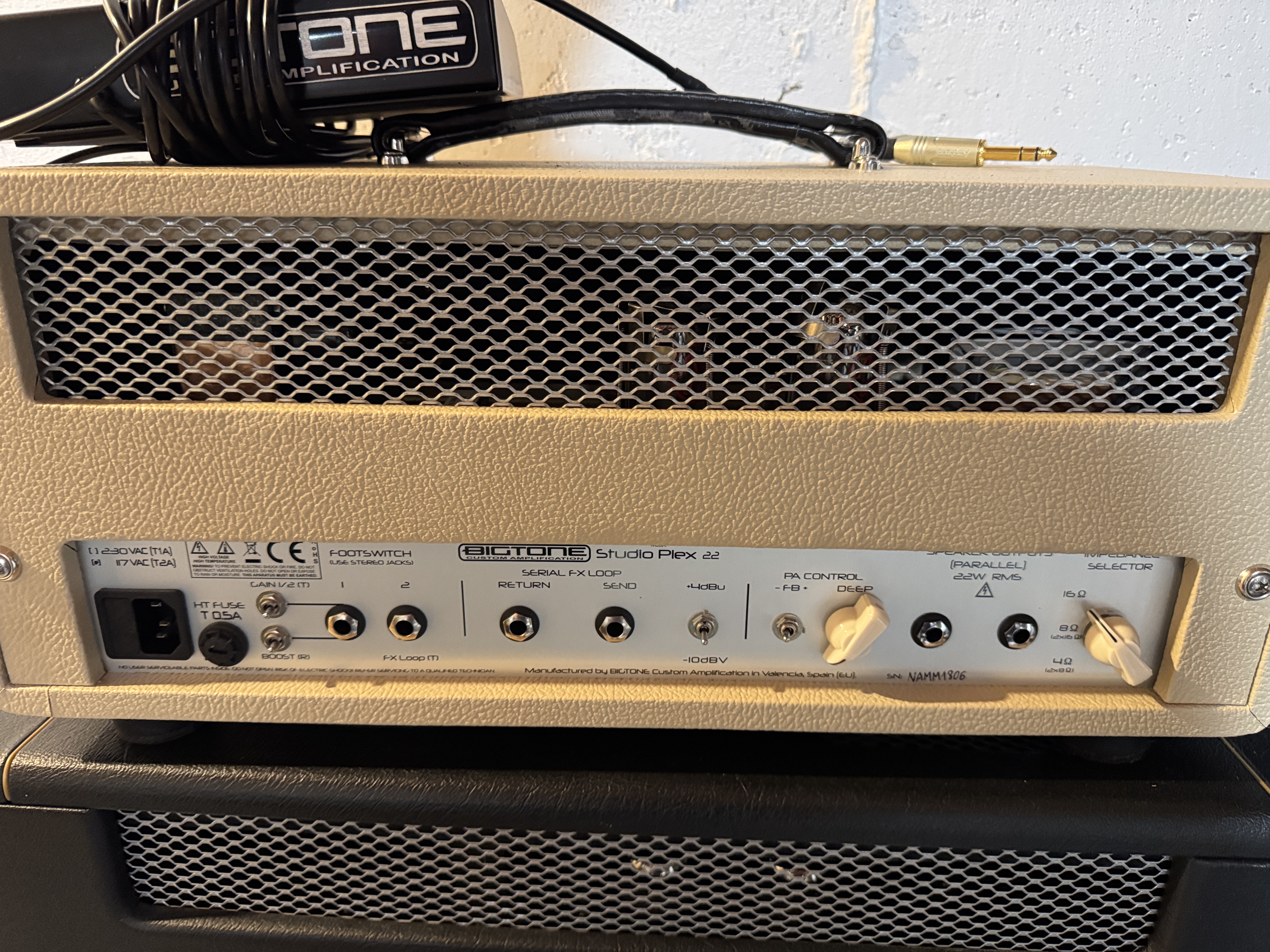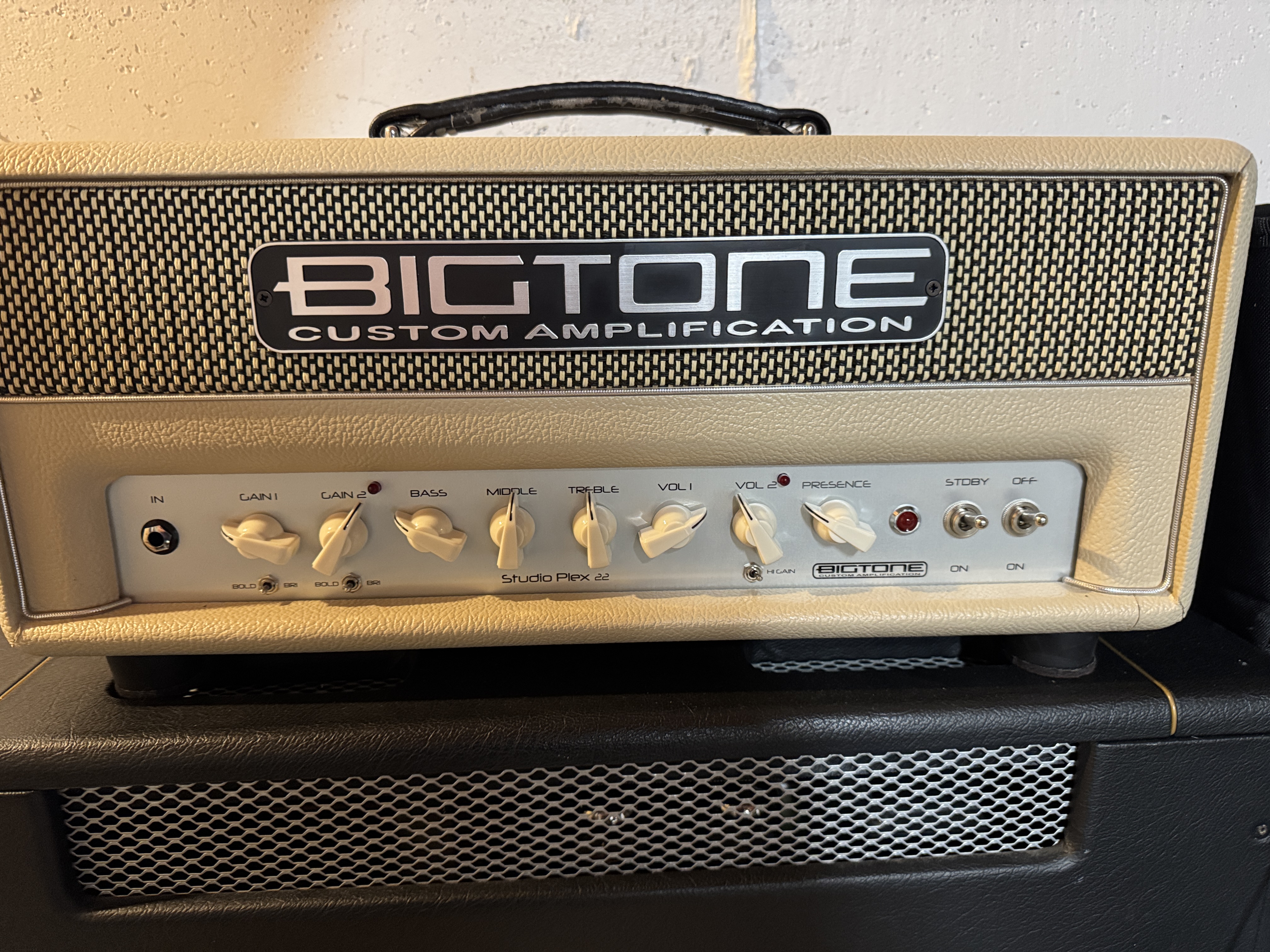Bigtone Studio Plex 22 amp head, two 6v6, two channel, FX loop, footswitch, padded cover, slight wear on handle. There is a video on YouTube with Lance Keltner playing a higher wattage model that demonstrates the amp’s various sounds. The features and tones are similar to this model.