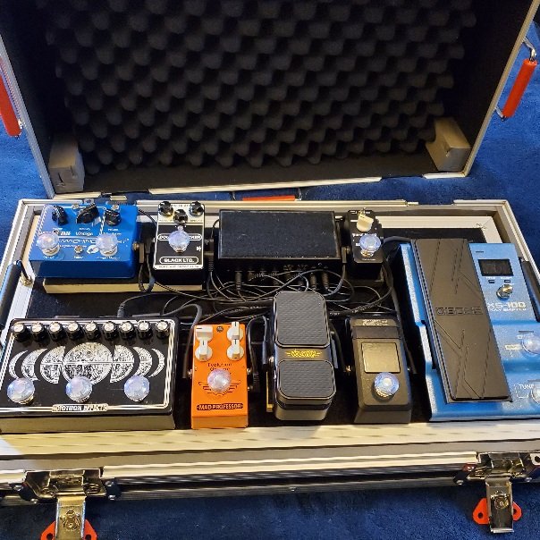 Noice happy new board day *_*I already got my velcro on. That's all I planned on getting done... Next thing you know I found cables, powersupply, and more pedals up in the attic dungeon. All the sudden this is ready for testing!