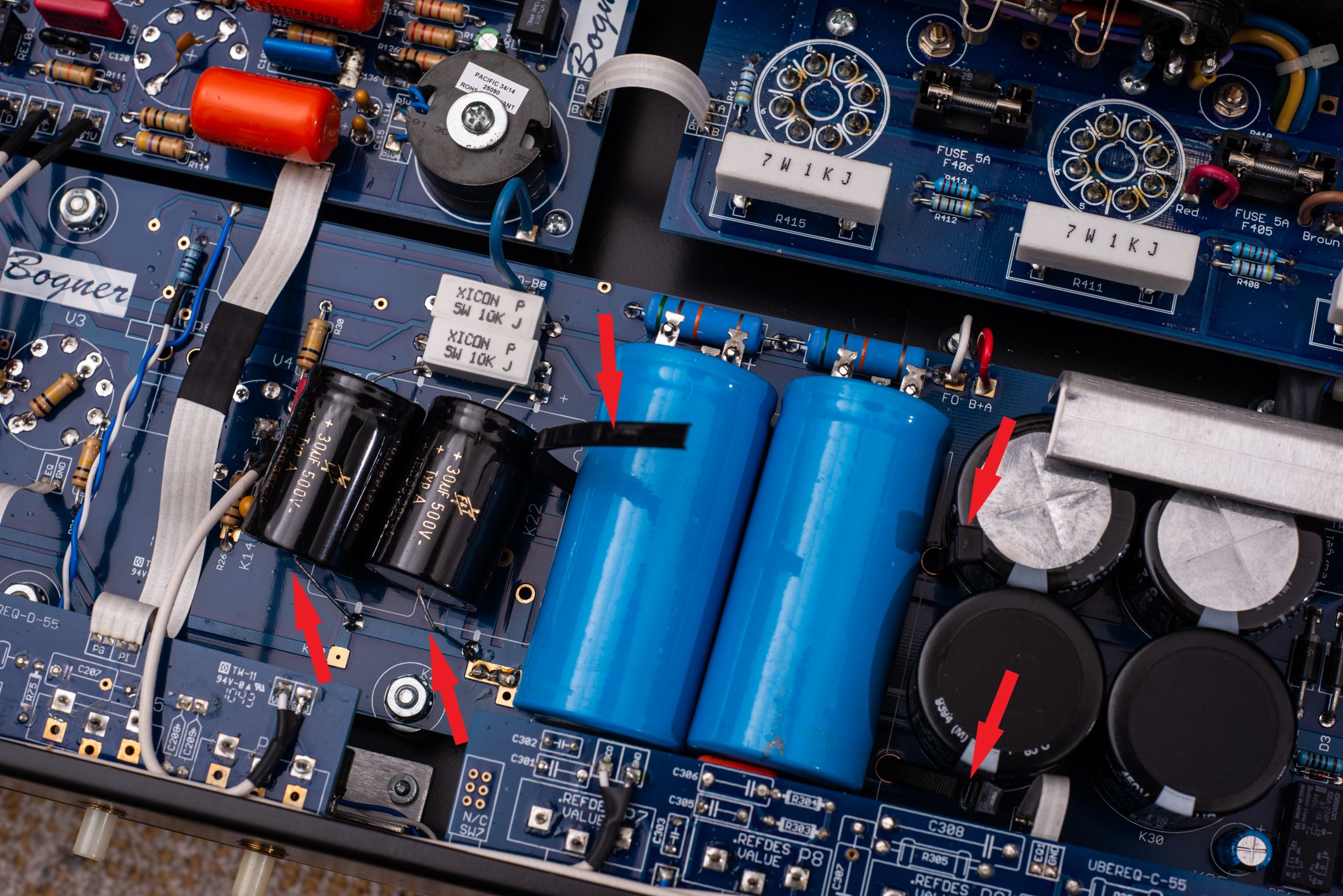 These large caps should be glued on to with some RTV glue....Thanks for posting this. I'm a little disappointed to see those two big caps still mounted on the terminals and held in place with zip ties, but at least this time they are not side by side held by the same ties. On yours, they are black and located towards the bottom by the heat sink, and a little smaller than old Uber's. I guess I see less big filter caps in general on the Ultra?