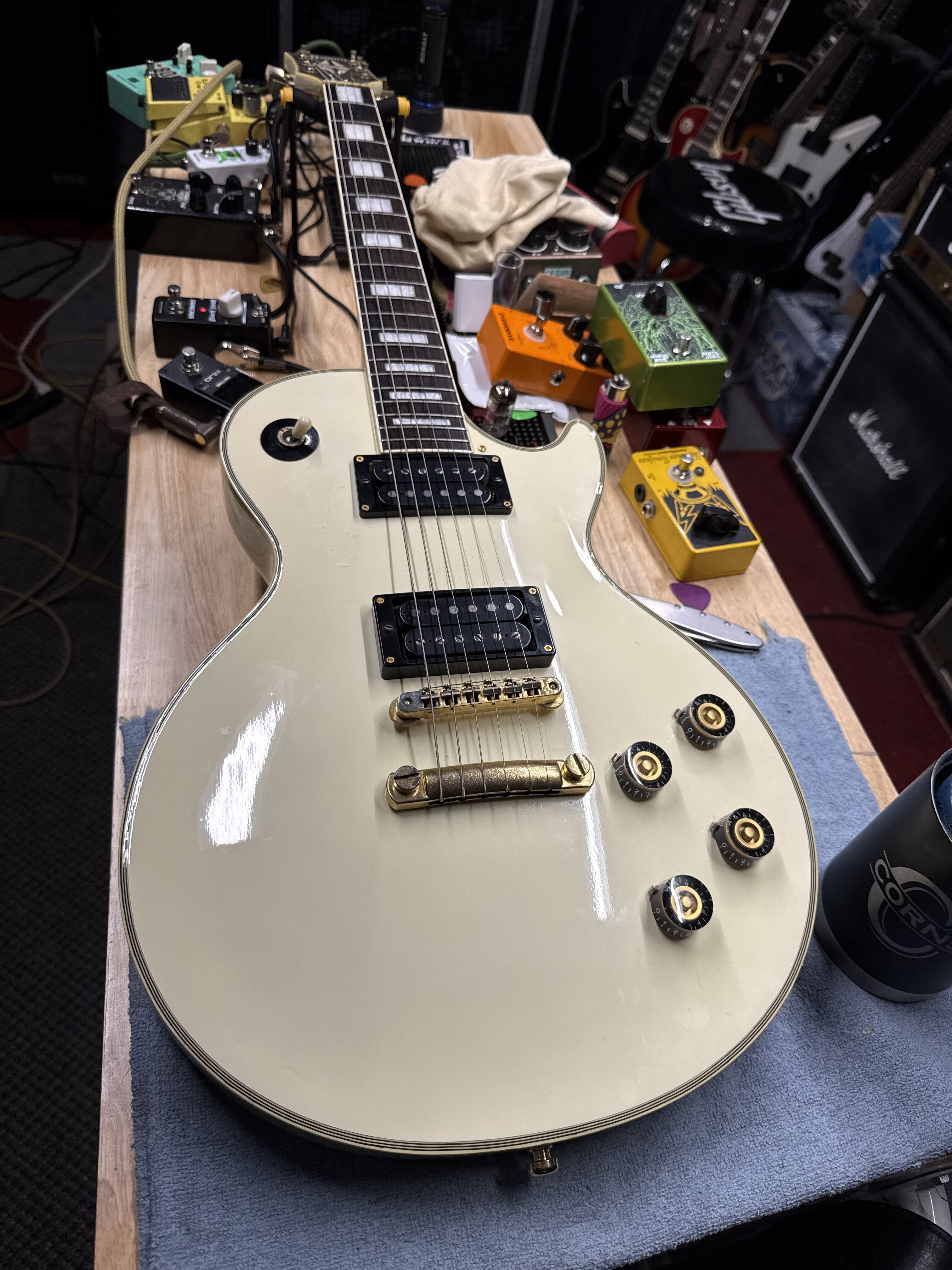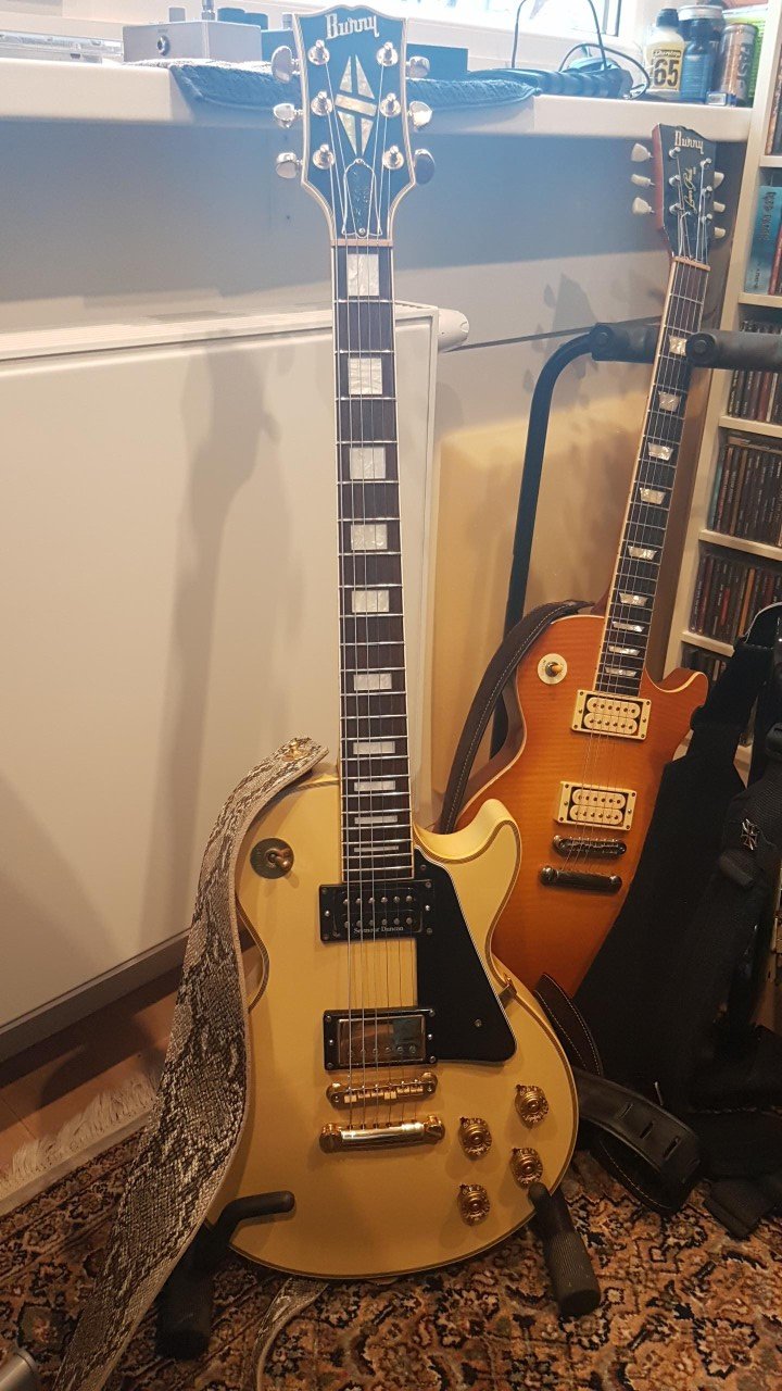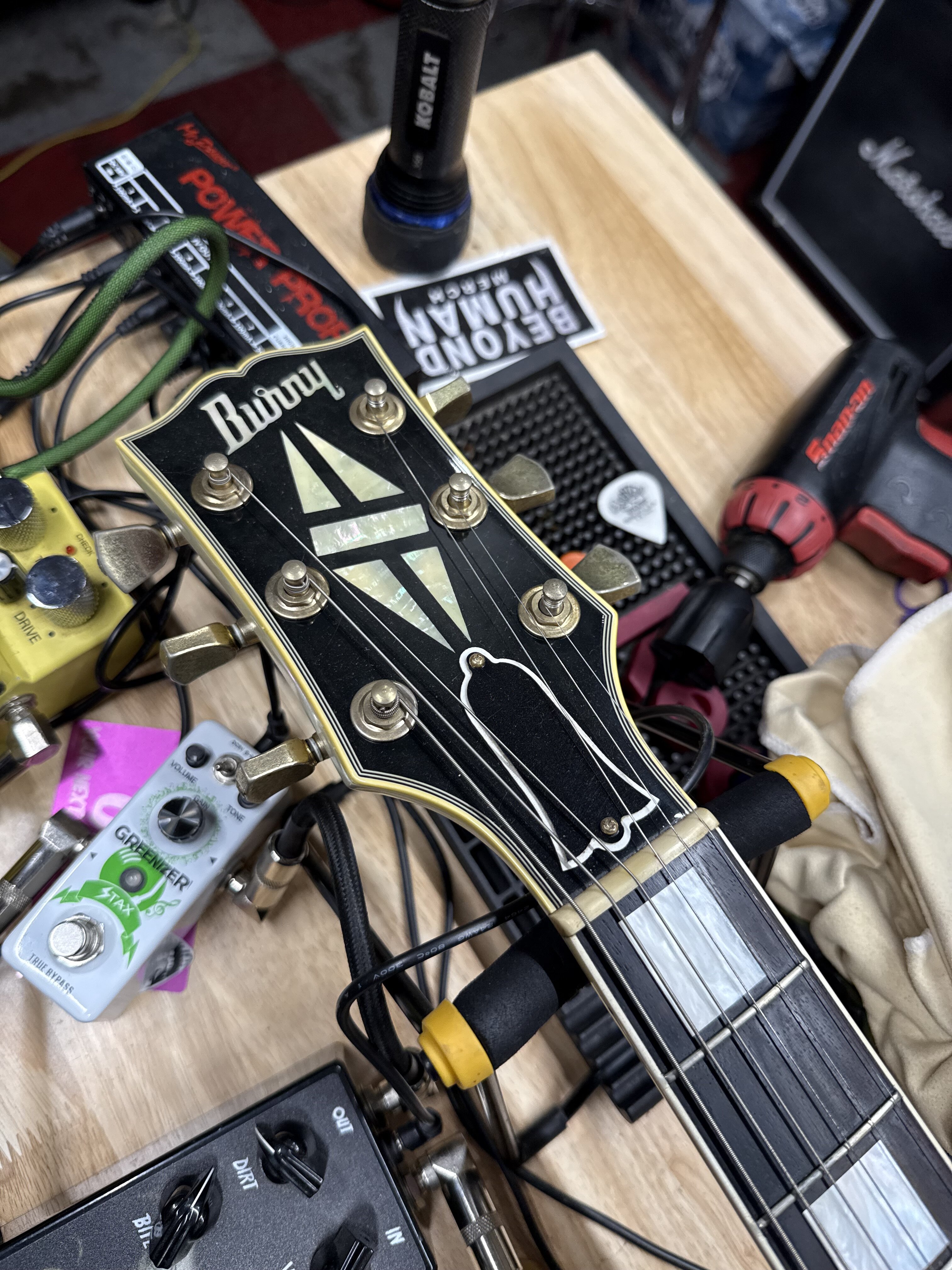 So, I can’t stand tiny frets. And not only were they tiny, they were pretty worn. The previously owner played the shit out of this guitar, and I can attest it’s a beast. It appears to be solid mahogany, no maple cap, so it’s a very full sounding guitar I hade swapped the mismatched dimarzios and put in my Whiskey bridge/P’AF A4 neck with aged gold covers to matches the guitar. I did my homework and everyone I asked about refret jobs recommended the same person. I wanted. I wanted jumbo frets and an oil infused bone nut . I dropped it of 8 days ago and he just told me I can pick it up Monday. I’m super excited. He went to the ESP Luthiery School and worked at ESP before moving back to Okinawa.
