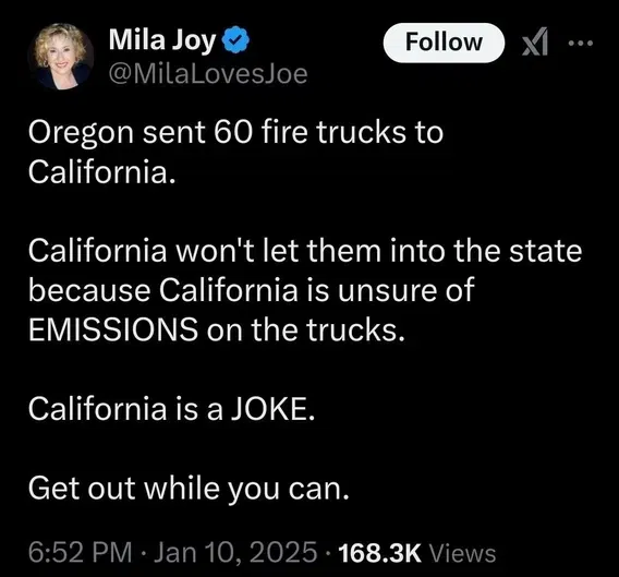 And how about let's deny all the out of State fire trucks and help to go to Sacramento first to make sure they pass all the emissions and legal stuff before they can help.