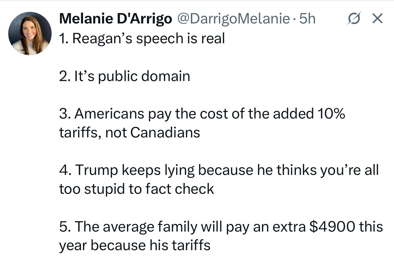 why the fuck do you care?The president announces an arbitrary price hike on Americans because his feelings are hurt by an ad accurately quoting Ronald Reagan’s criticism of tariffs....
