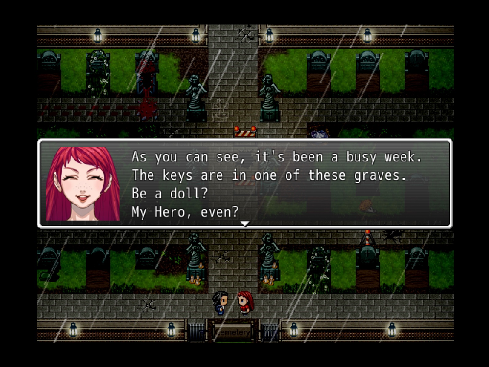 "Hey, I have an idea. You could help me find my keys," she hints. "You mean like at the graveyard?" You inquire in response. "Well, yeah. I mostly just tend to the gardens, but given the uptick in deaths lately; they have me digging graves lately." Wide eyed and unsure of yourself, you just sit for a moment in silence.