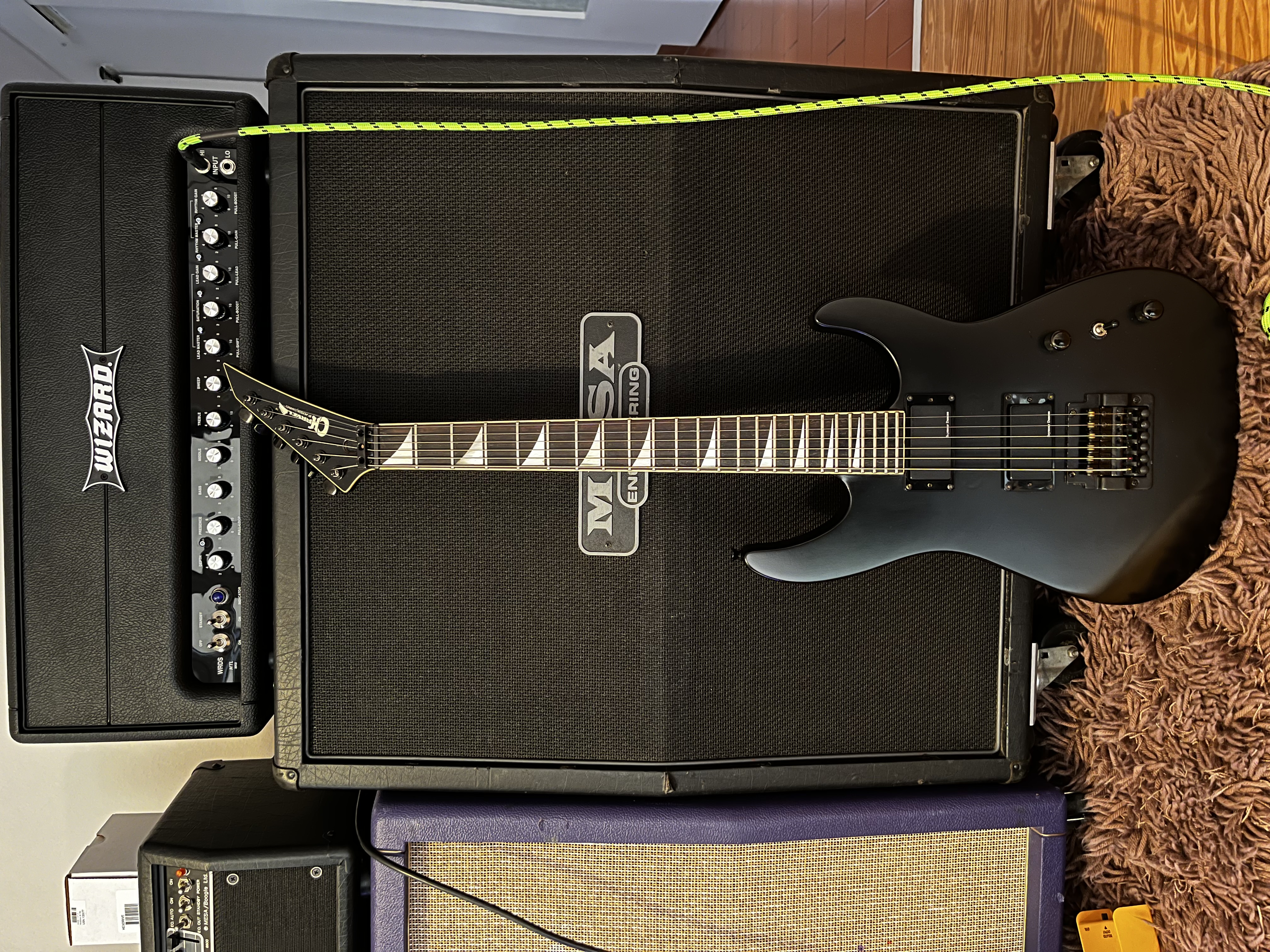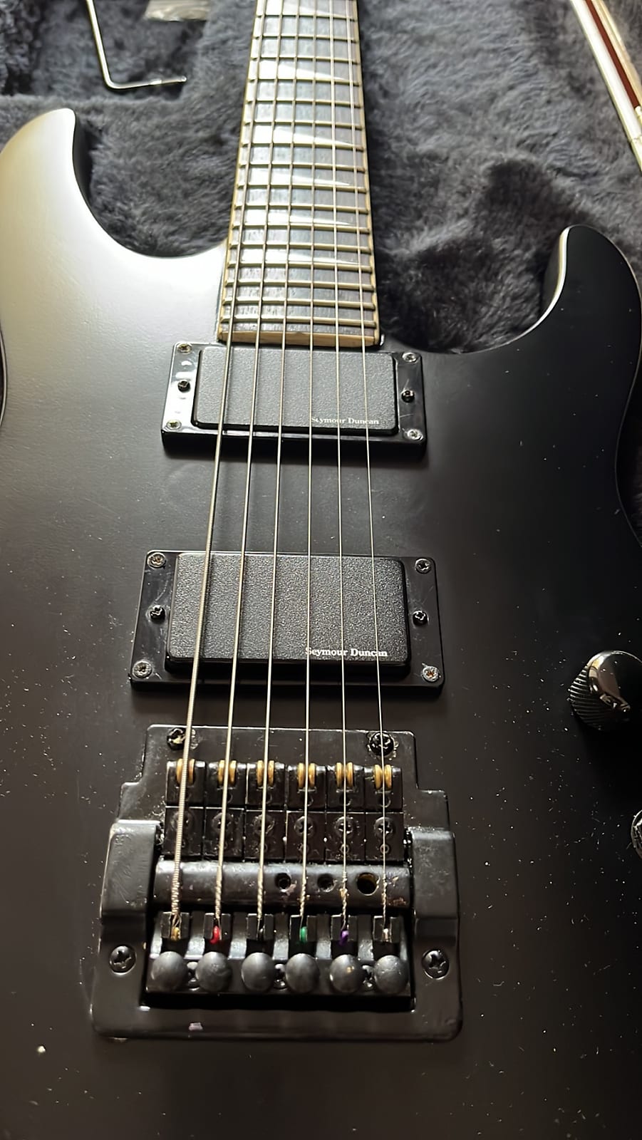 For sale this gorgeous Charvel 6. It's the 1986 kahler USA model that has been repainted / modded to 2 humbuckers instead of the original h s s pickup layout. It comes with the Seymour Duncan blackouts and it sounds amazing! Really resonant as well. The frets have plenty of life yet and the neck is straight. New setup / standard tuning and new Ernie Ball 10 46 strings.It comes with the original Charvel case.