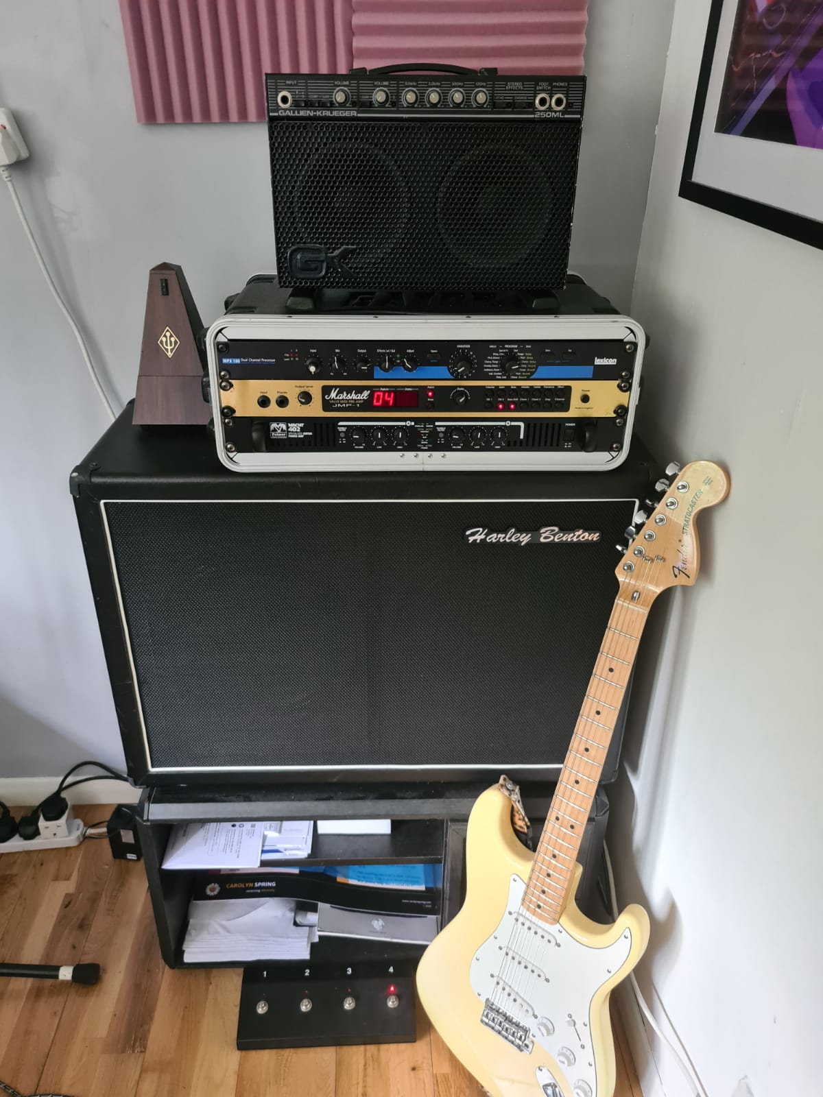 Been a while since I've dicked about with old racks since buying an AxeFX. Saw a JMP1 up online for 300£ ($410) locally so went and grabbed it. Had the Lexicon lying around from and old rack system. Sadly I sold the EL84 20/20 I had but the Palmer Macht 402 is pairing really well with the JMP1 despite being Solid State. The Palmer has front EQ controls meaning you can sort out any flubbyness or fizz. Running finally into a cheapo V30 2x12 from HB. From hanging around this forum, I've learnt that the FX loop is a tone suck so it's just JMP1 Stereo to Lexicon Stereo to Palmer