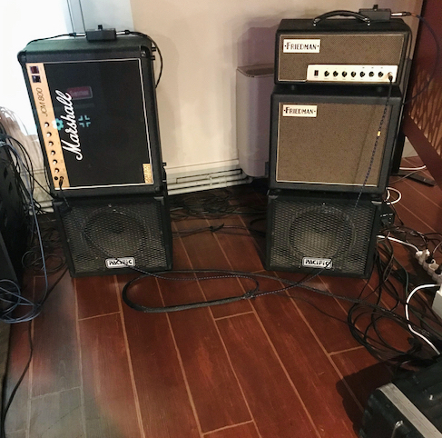 And when I want to go all in: 4 amps, either of the same type or 2x2; used in a « w/d/d/w » kind of fashion. Usually use again open backs where the really « wet » effects are, I like how that helps diffuse the ambiance in the room. You can play with different physical arrangements of that, including stacking cabs/amps.