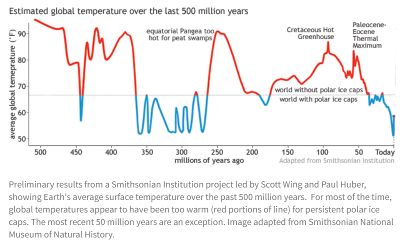 As you can see from the graph, on a geologic time scale we are actually in one of the coldest points in the earth's history. And temperatures for most of earth's history have been warmer than today.