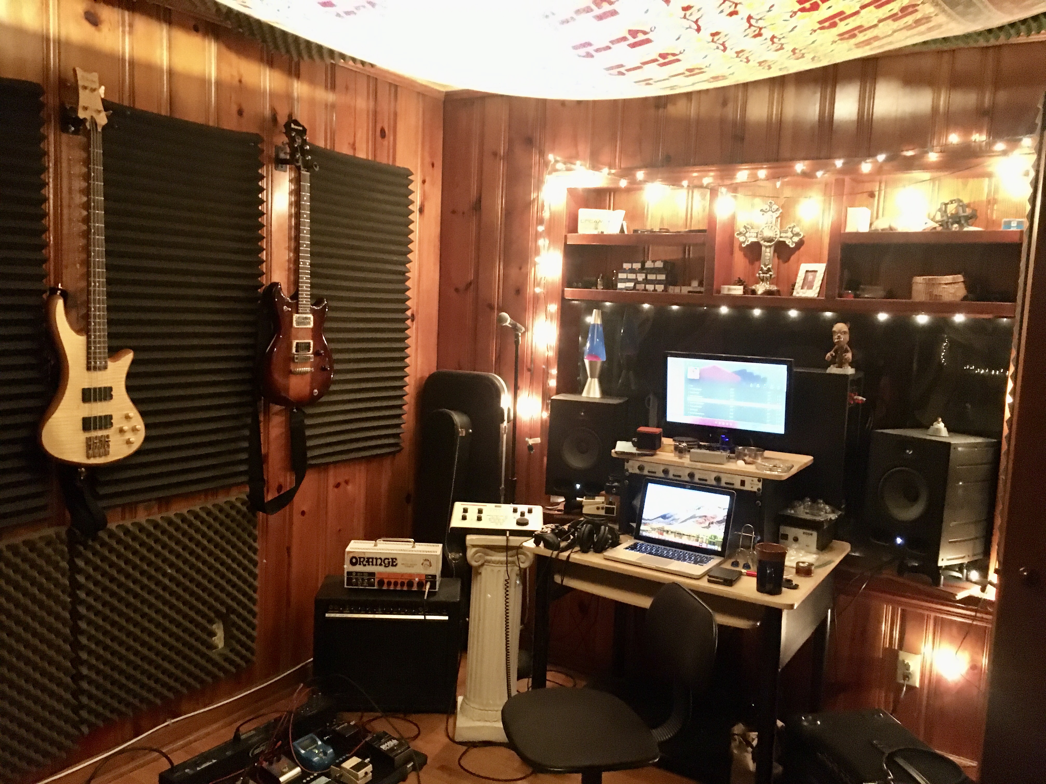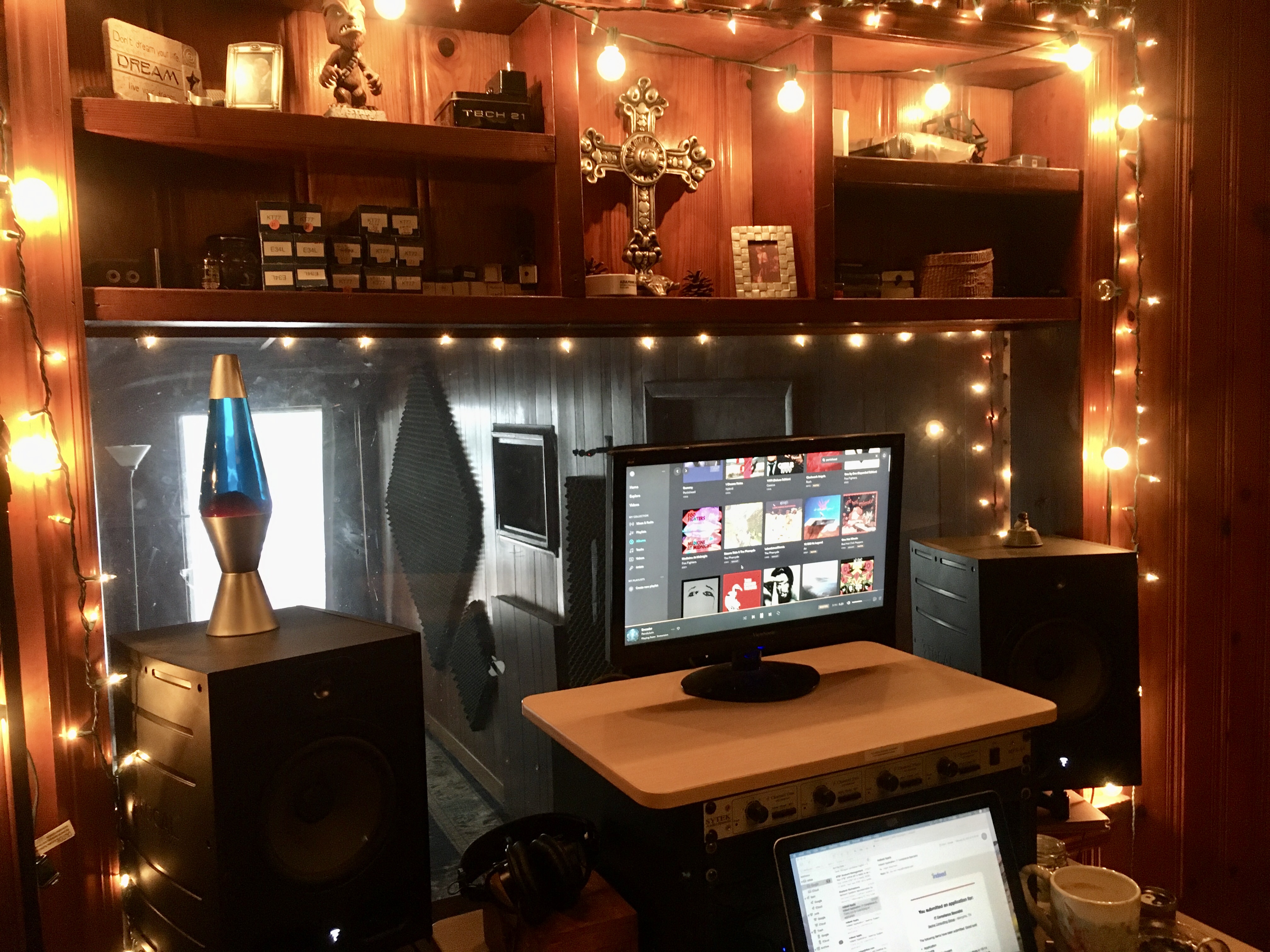 That blessed plexiglass window gives me 30+ feet between the bookshelf diffusers behind me and the end of my den, which provides a bay window into my back yard. A moonroof over my listening position give me an extra 5' above my 8' ceiling. Still, the Focals' mid woofers are under the half way point, even on their IsoAcoustic stands. Devil's in the details, especially in this little box! I don't subscribe to "small driver for small room" philosophy, I like headroom and low bass. Yamaha YST-SW150 sub is in the window with drivers in the center for imaging and the fact that the floor is raised hardwood, which is vibe-y as FUCK but MAN it gets excited! Since this is mostly for writing/jamming/good times it makes sense, all that clinical shit I leave for someone else.