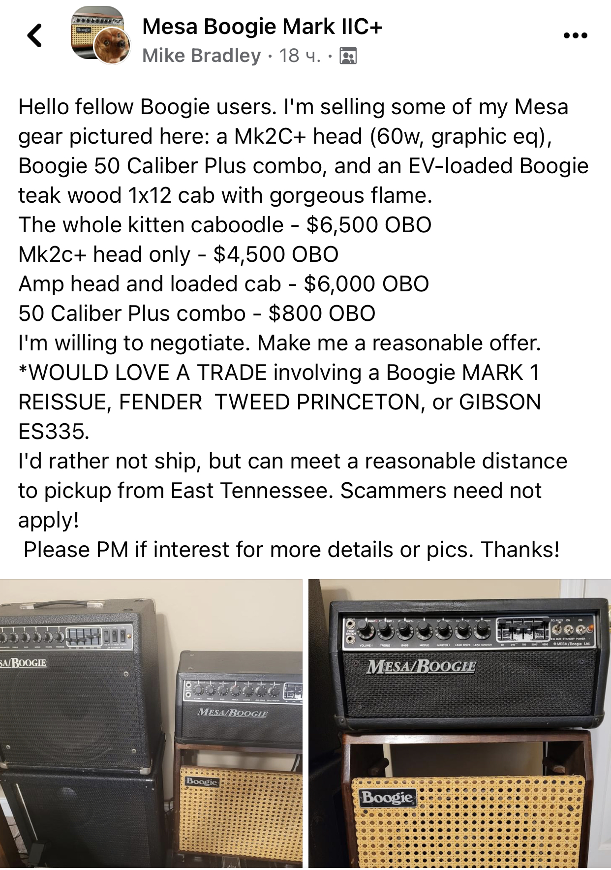 I would approach with caution anyone trying to “flip” mark amps currently. Well, really anything. But, Their value is crashing pretty hard right now and lots of stuff is sitting. If you’re doing it to play it, absolutely knock yourself out! But if you’re trying to make a buck the used gear market is taking a massive shit. There’s even a mark iii ++ that’s been sitting for a month for only 2k.