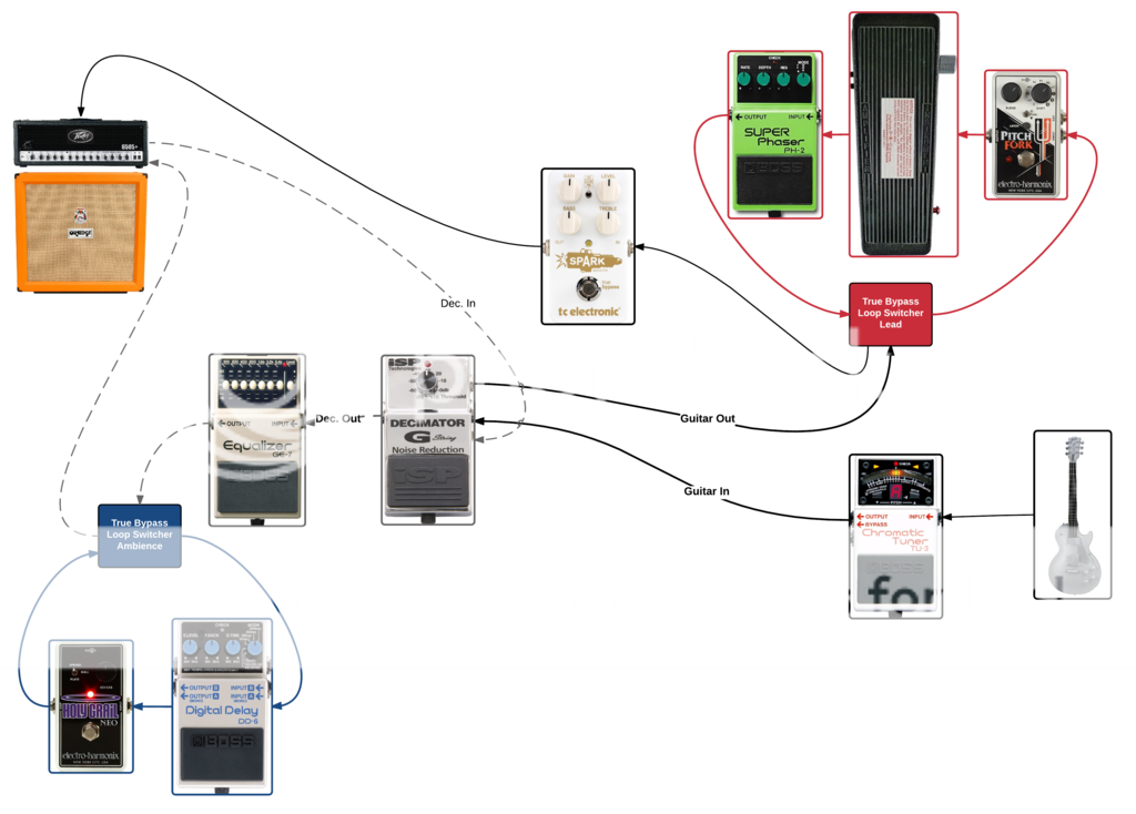 My main concern has been cleaning my main rhythm tone, hence the red loop, to pull out three known noisy pedals.