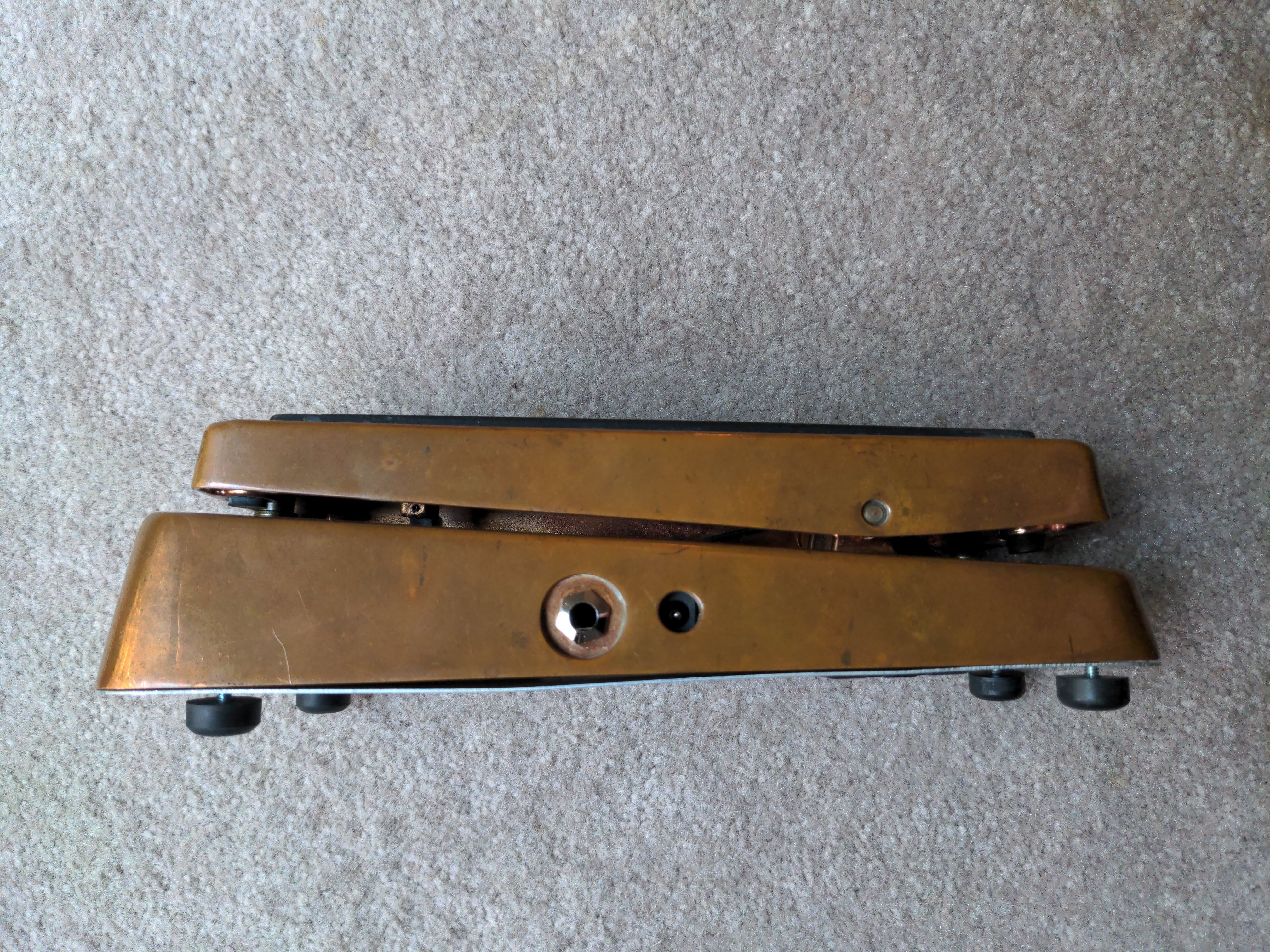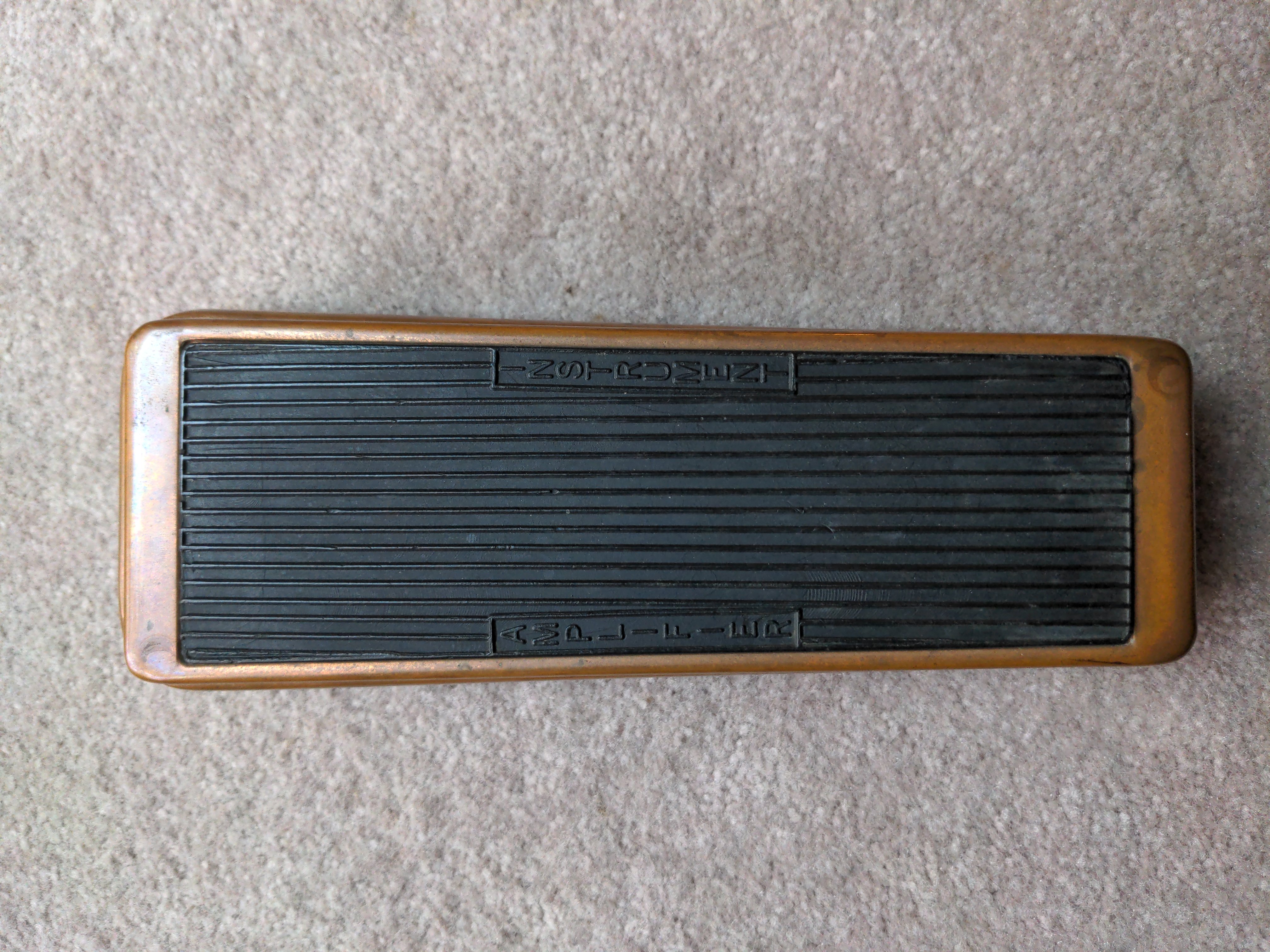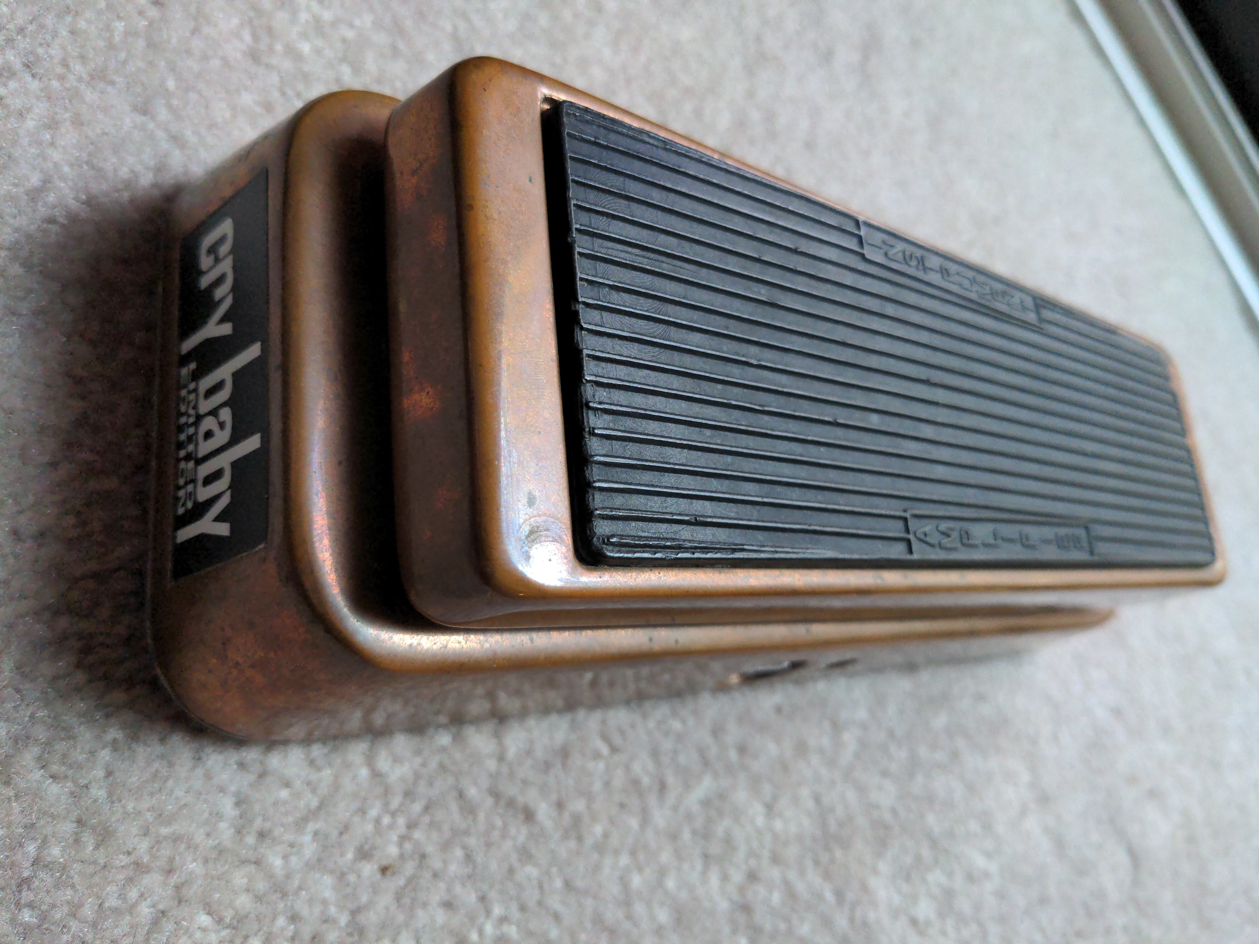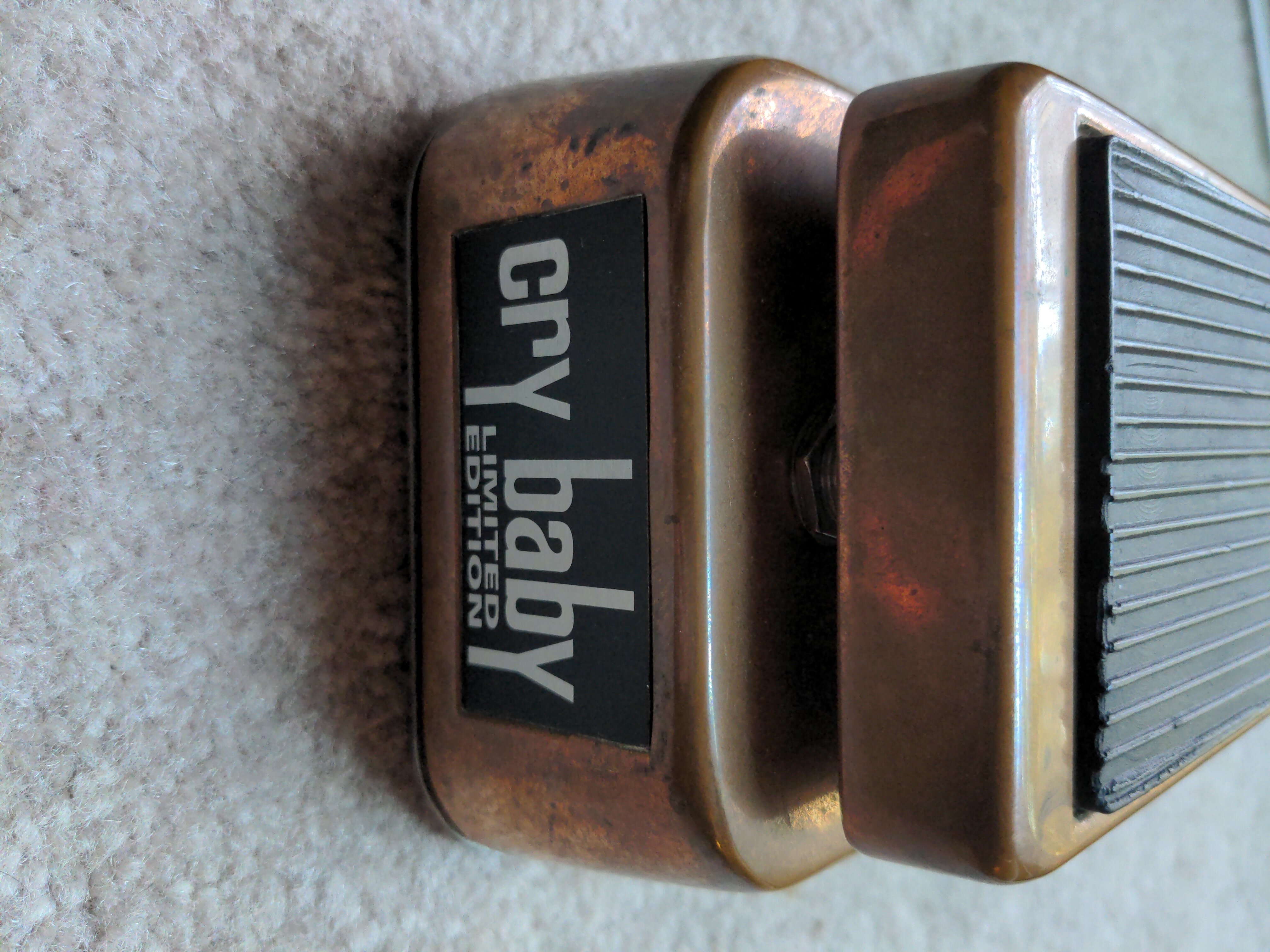 A hybrid Cry Baby I put together from the circuit board and stomp switch from a Joe Bonamassa signature Cry Baby inside a copper Cry Baby enclosure from one of the Limited Edition runs of the regular Cry Baby, with a 100k sealed wah pot from McCon-O-Wah.