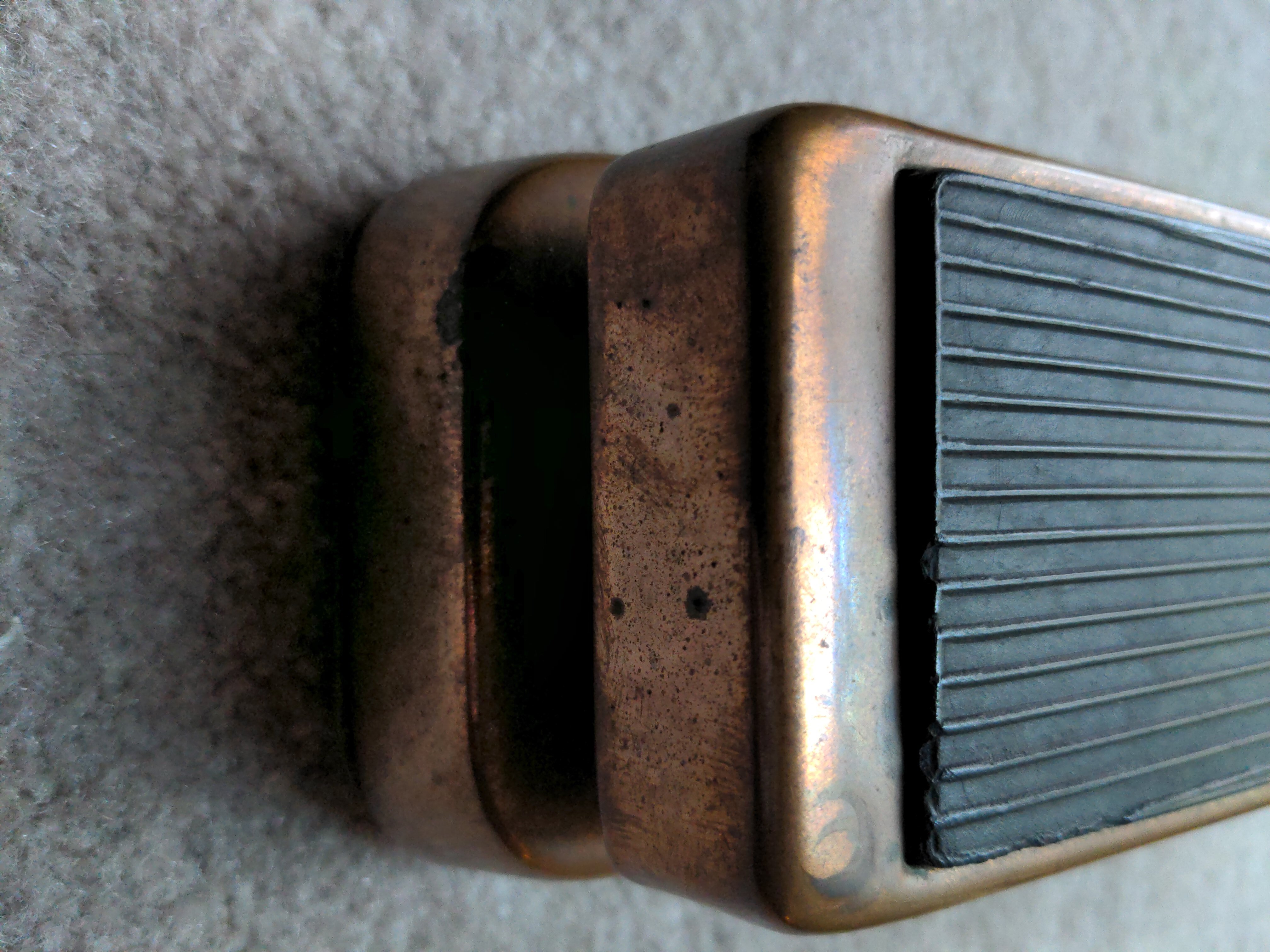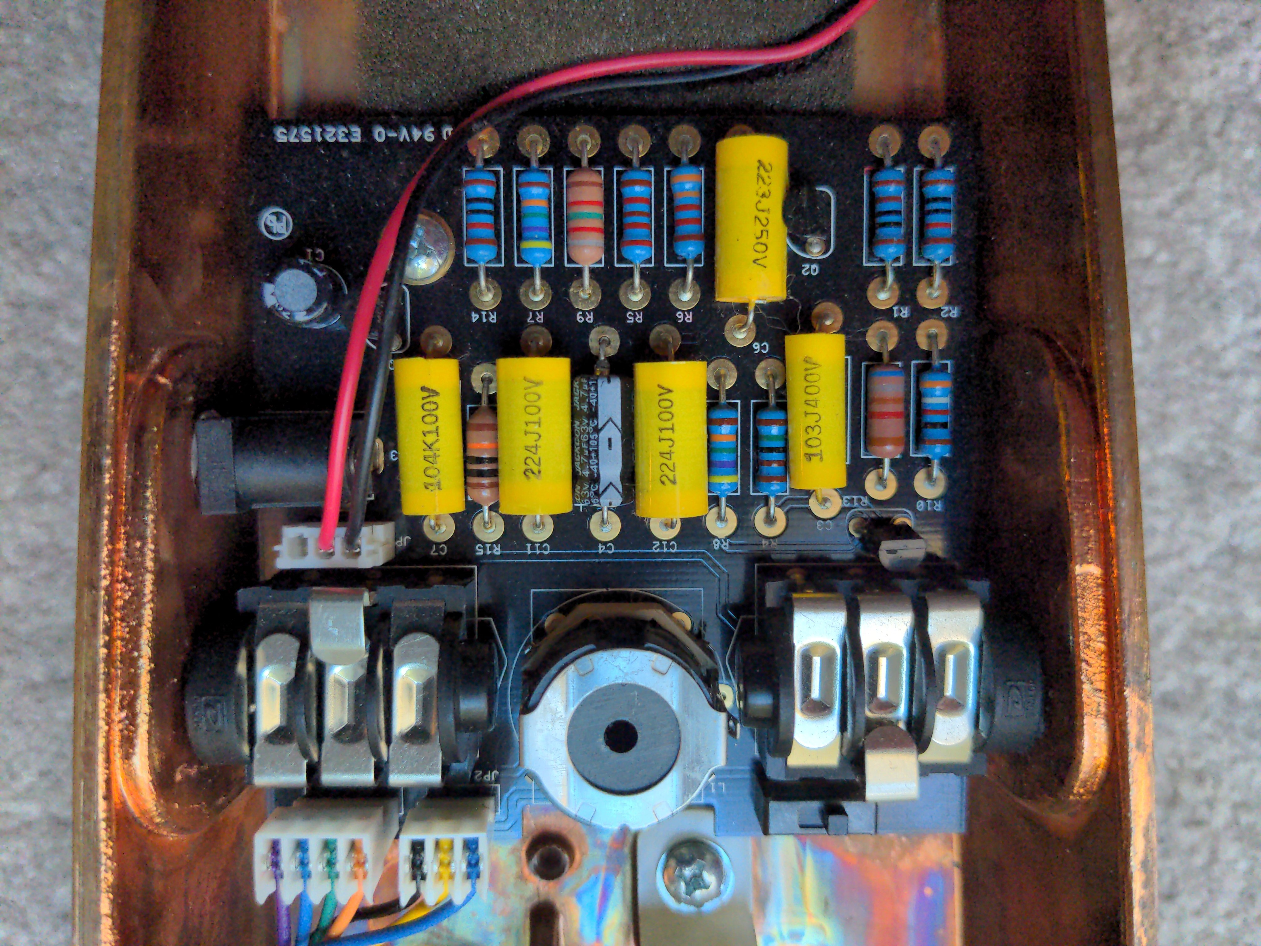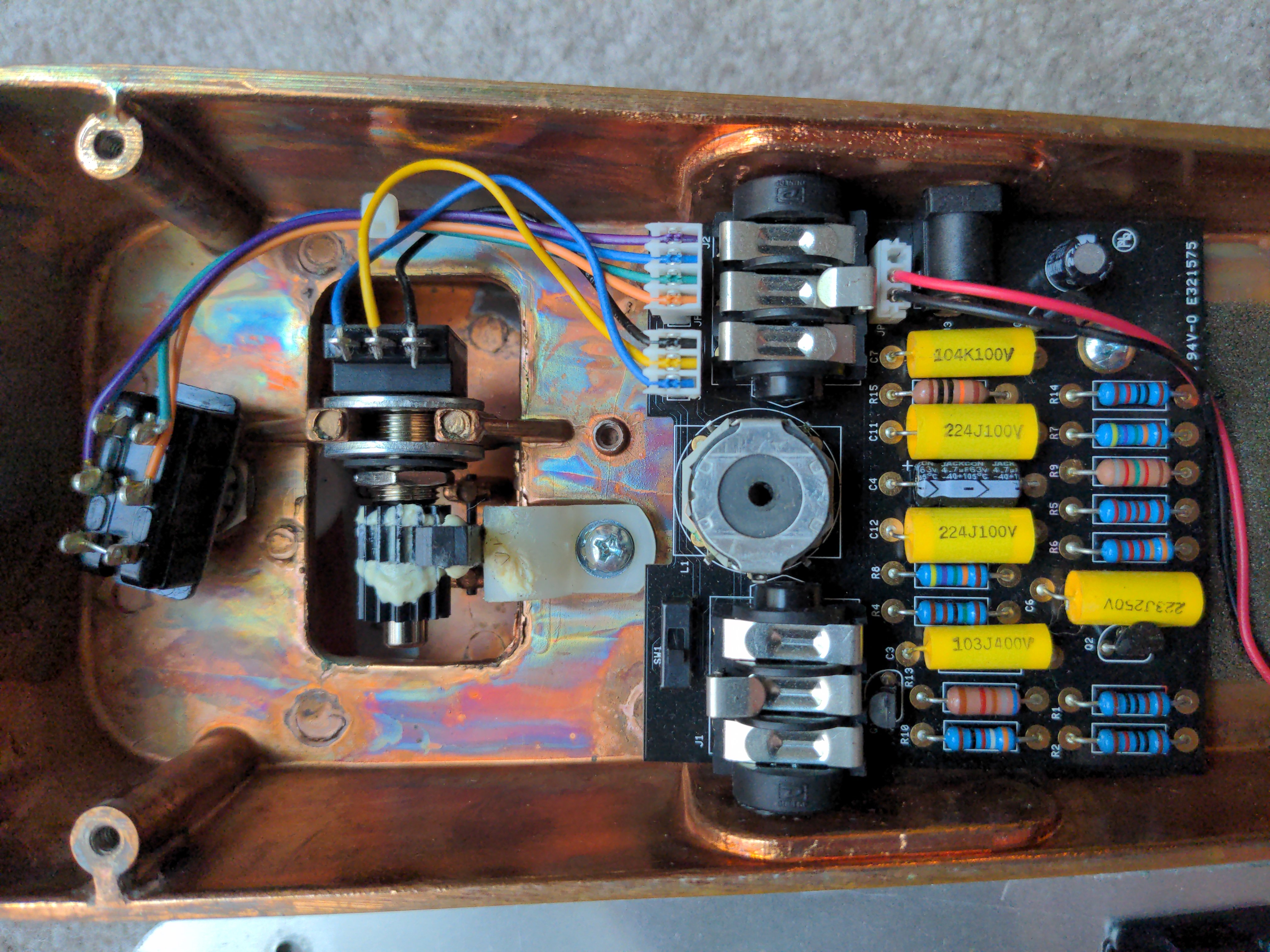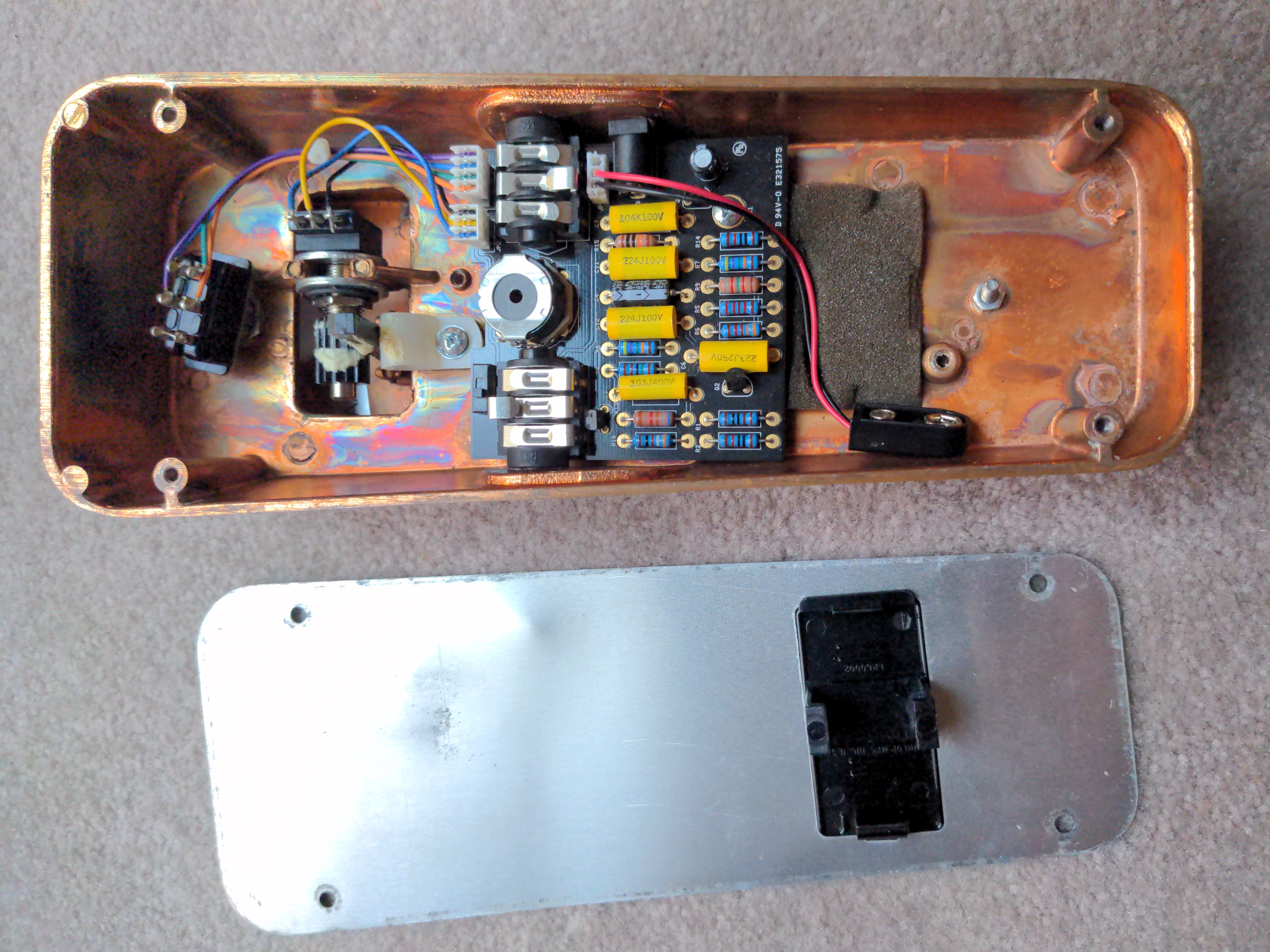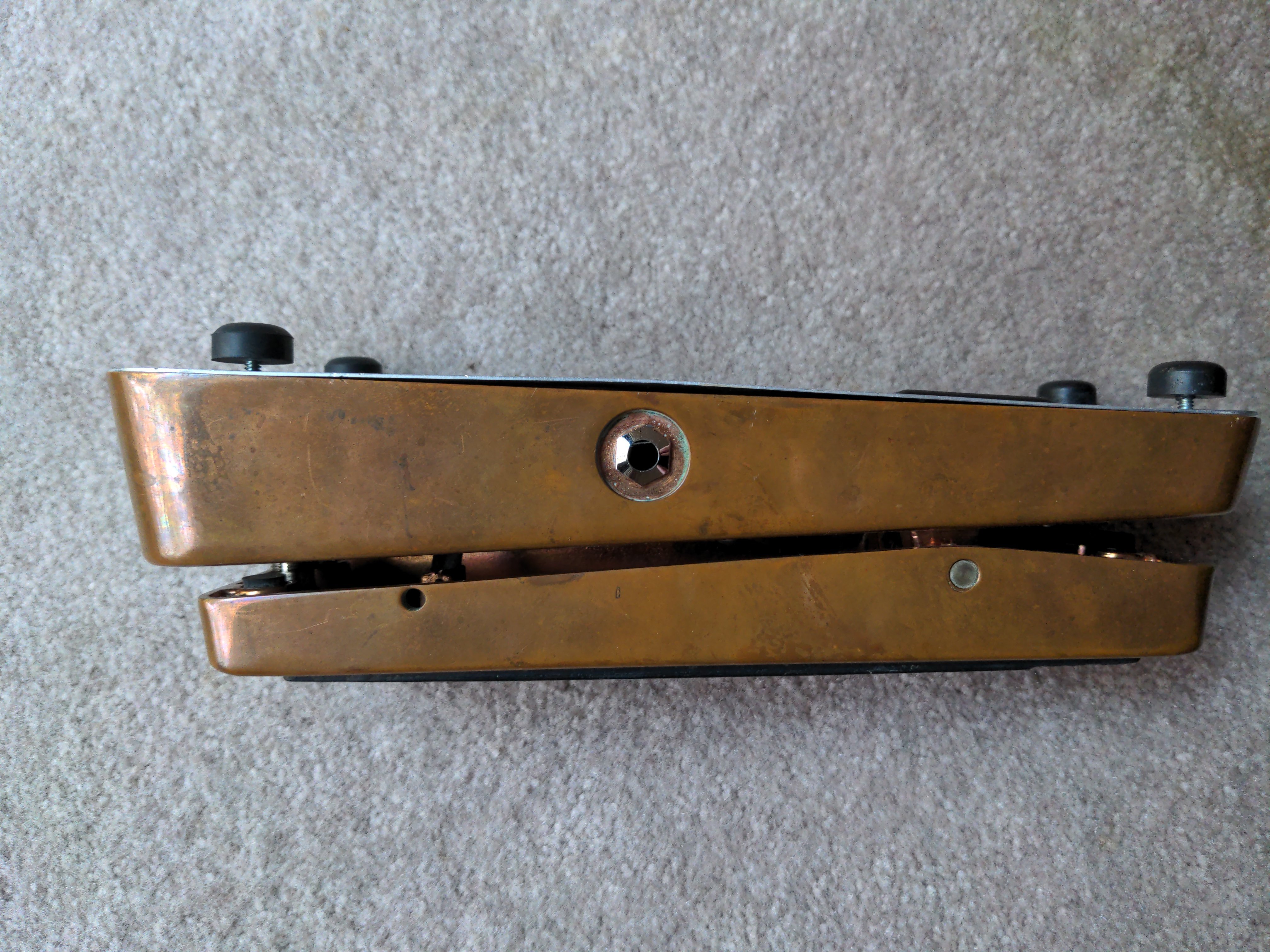 A hybrid Cry Baby I put together from the circuit board and stomp switch from a Joe Bonamassa signature Cry Baby inside a copper Cry Baby enclosure from one of the Limited Edition runs of the regular Cry Baby, with a 100k sealed wah pot from McCon-O-Wah.