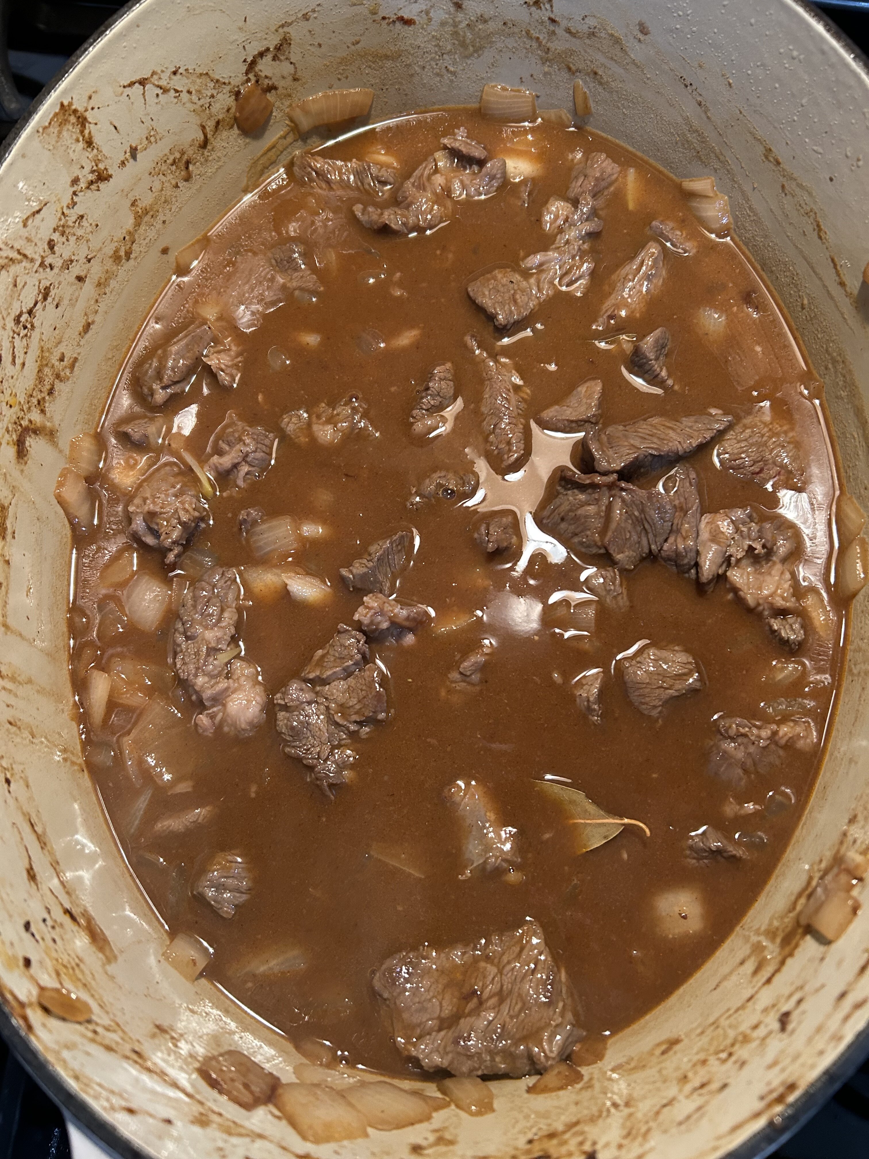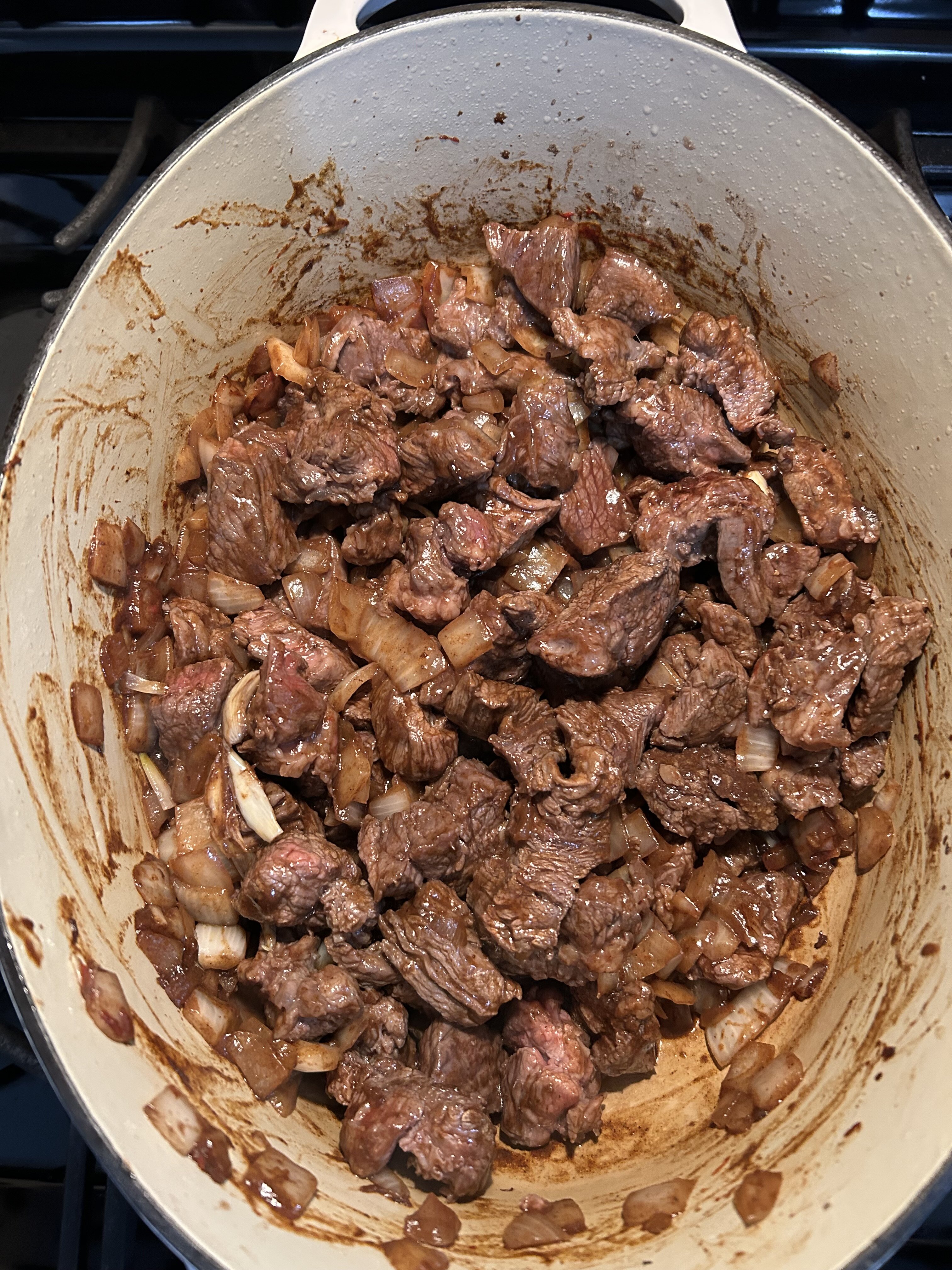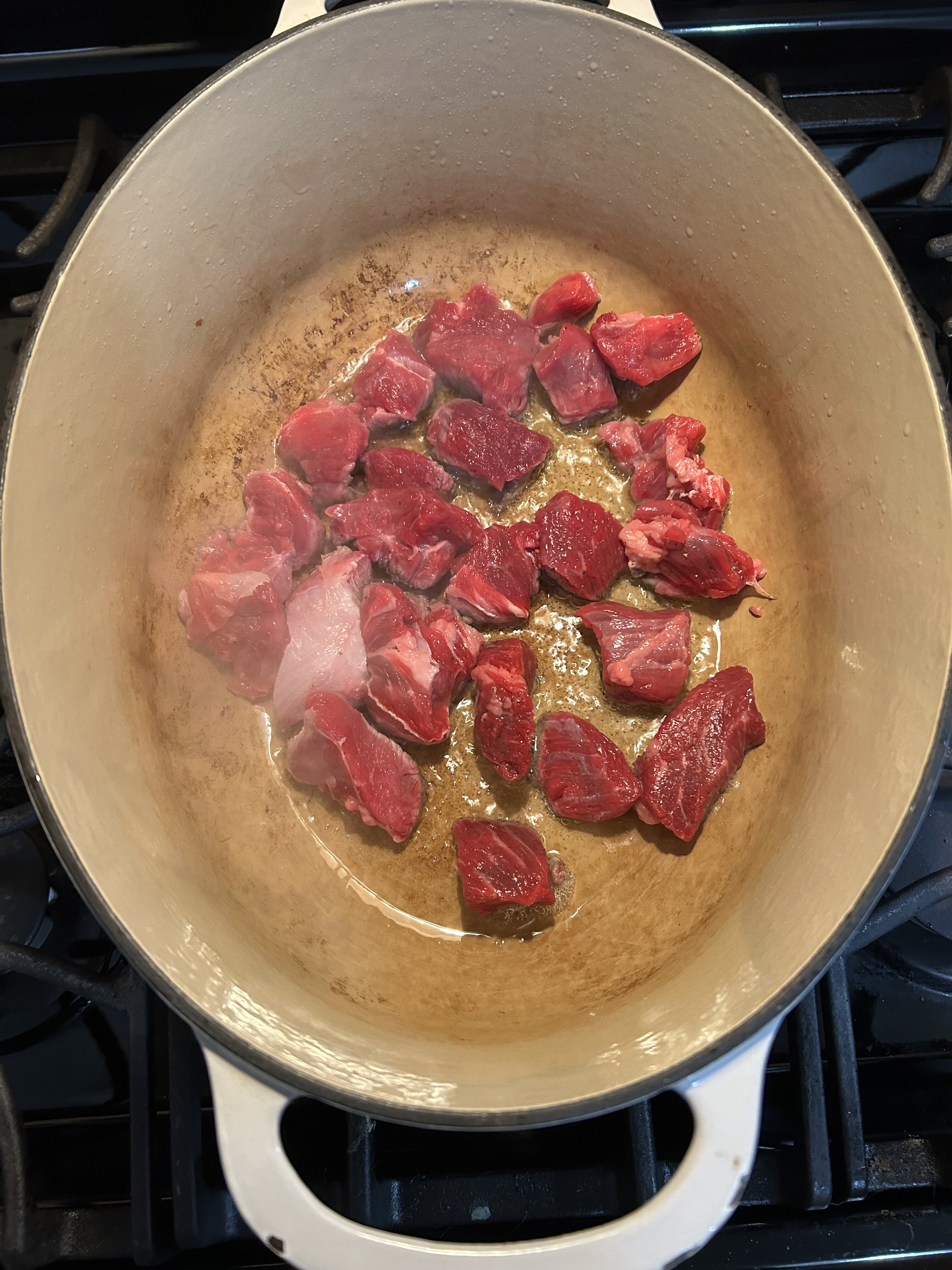 I have the beef and vegetables prepped. Working with a well-loved Dutch oven.
