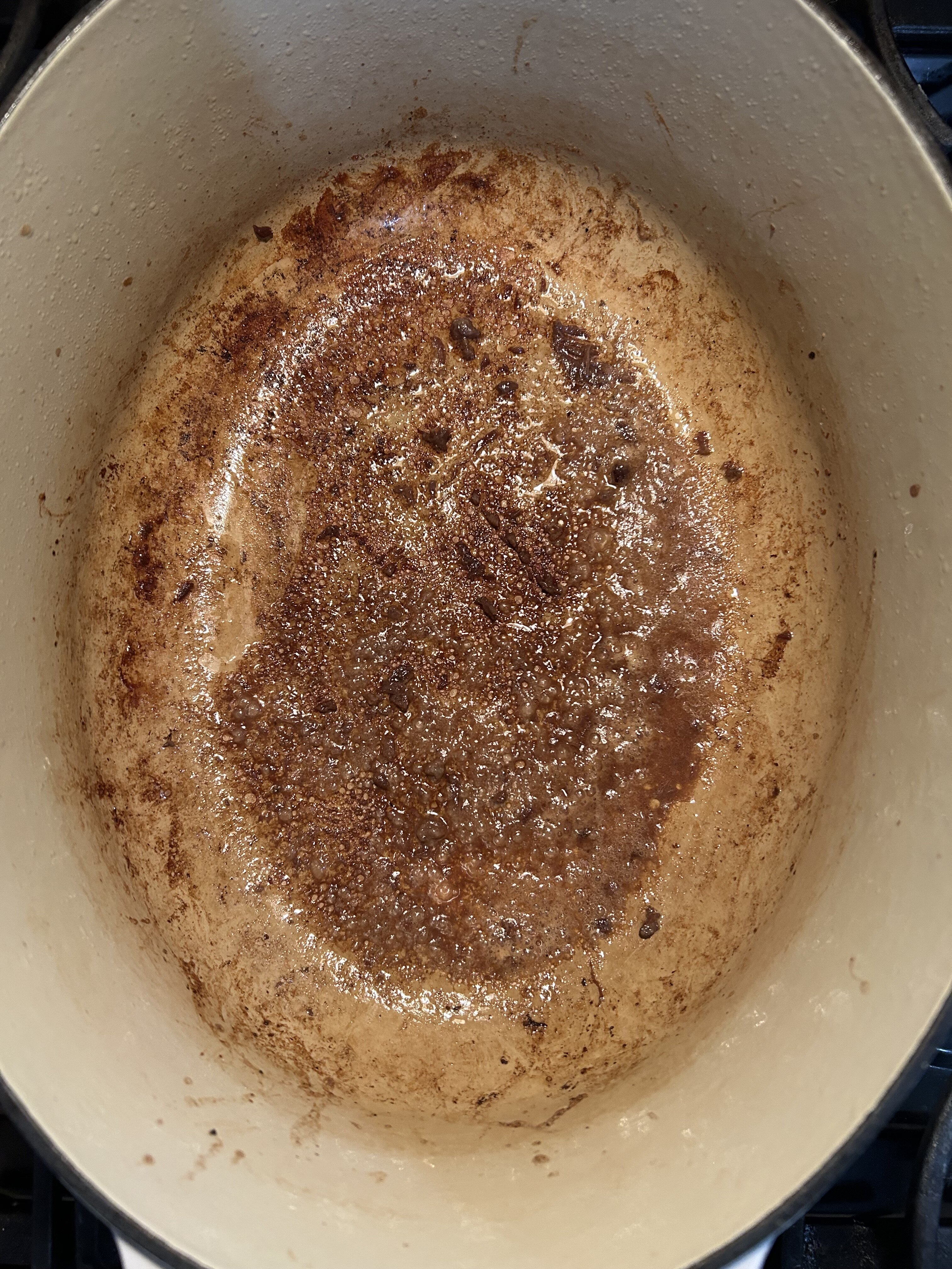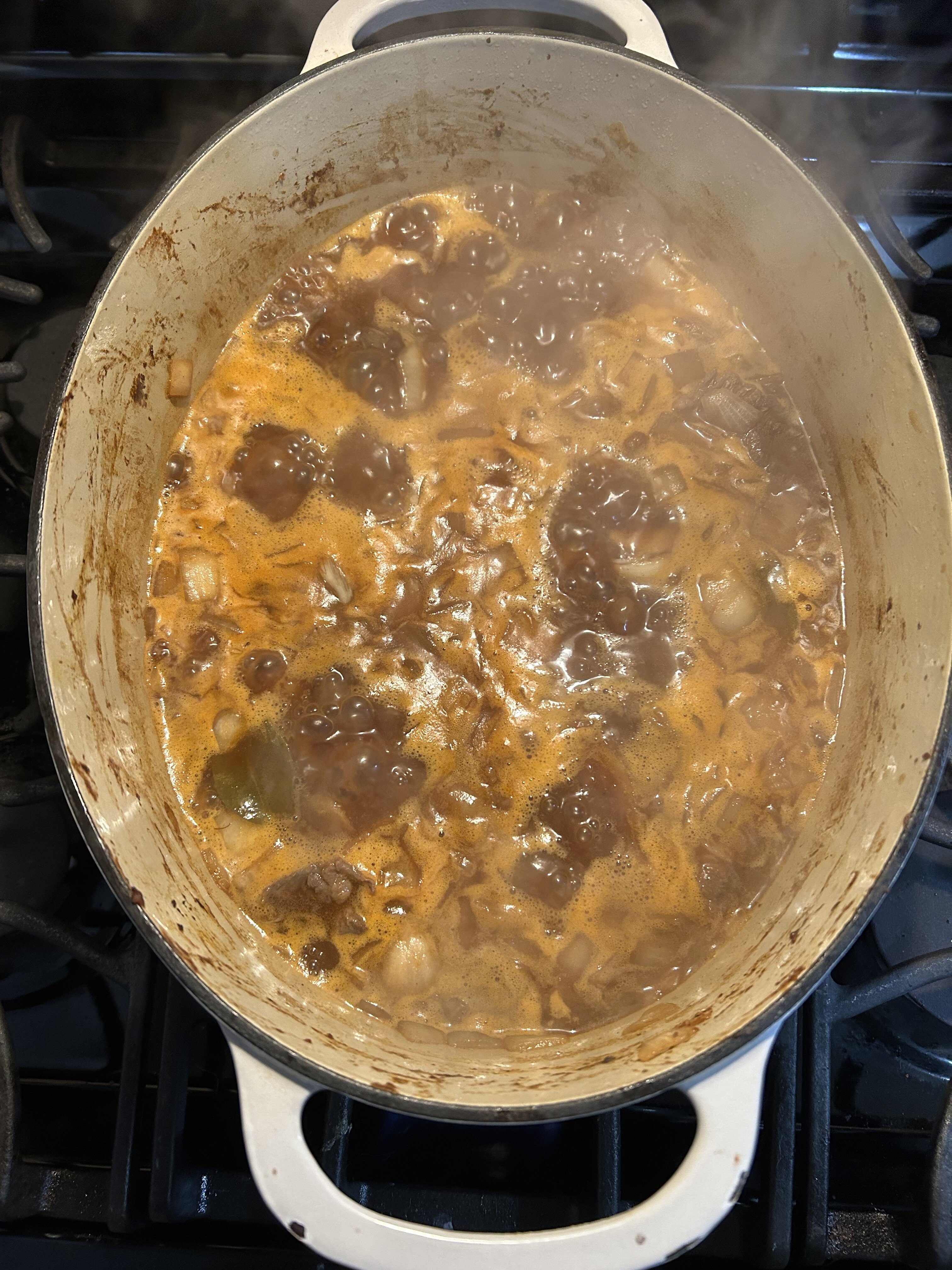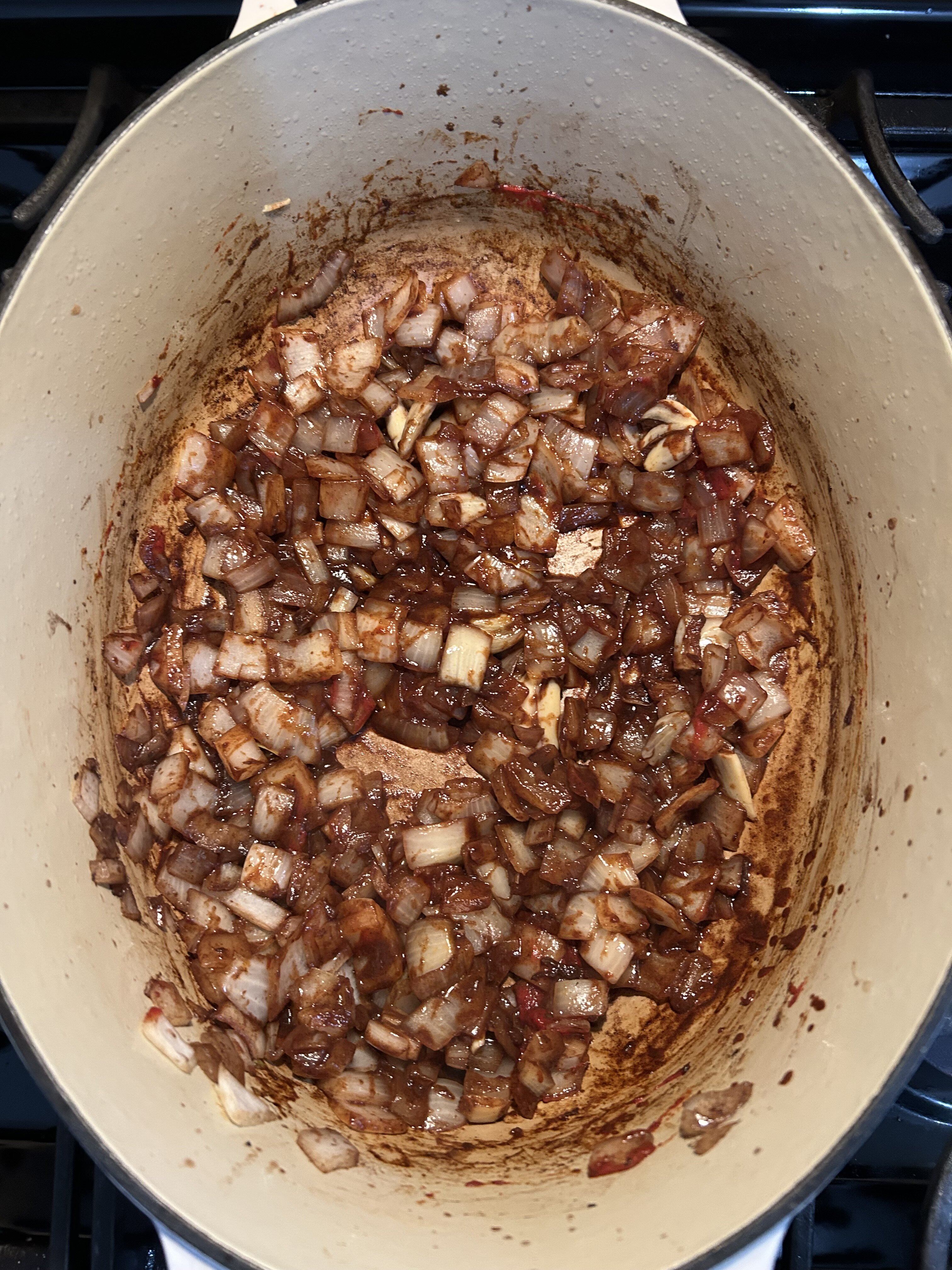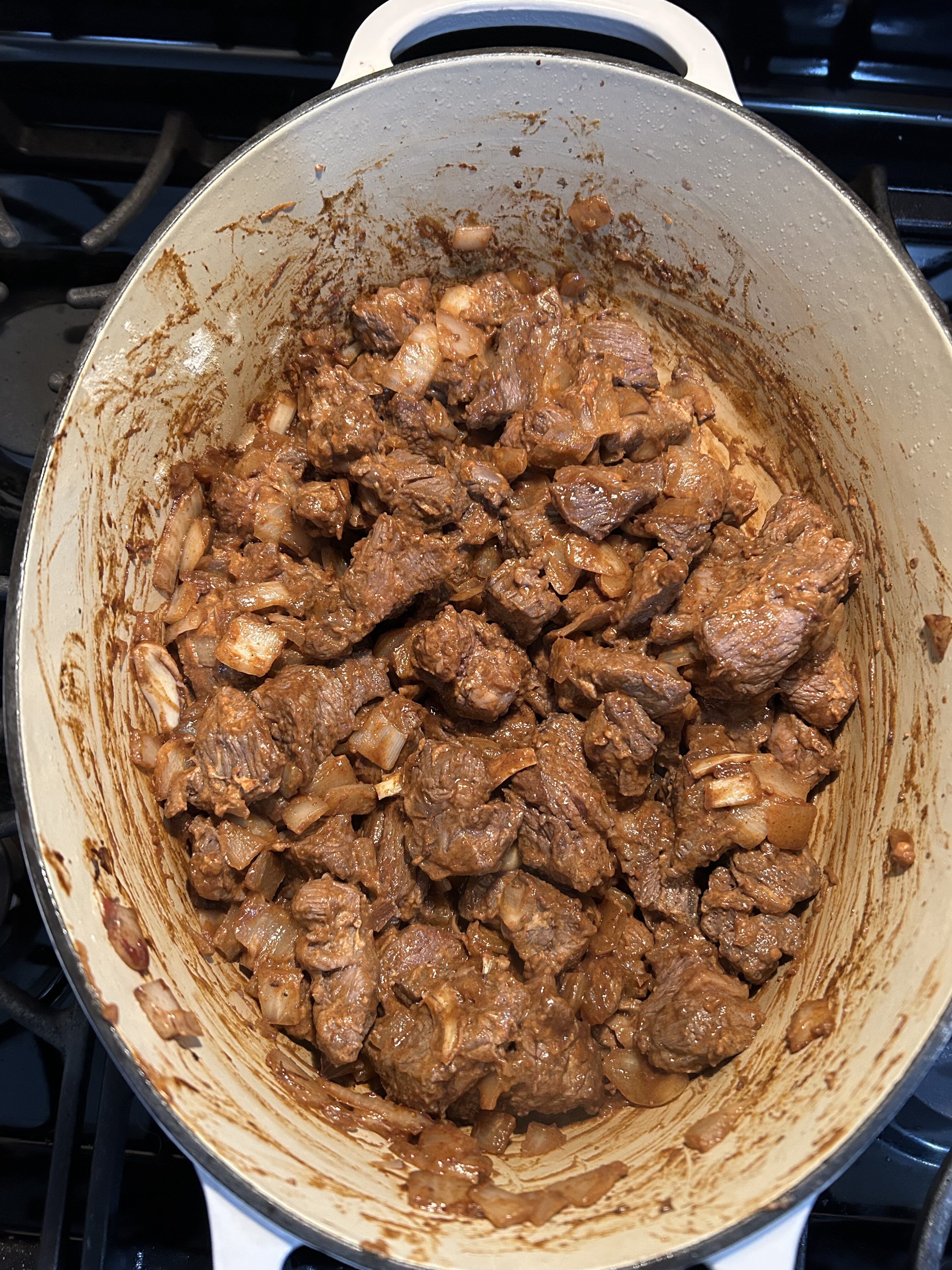 I have the beef and vegetables prepped. Working with a well-loved Dutch oven.