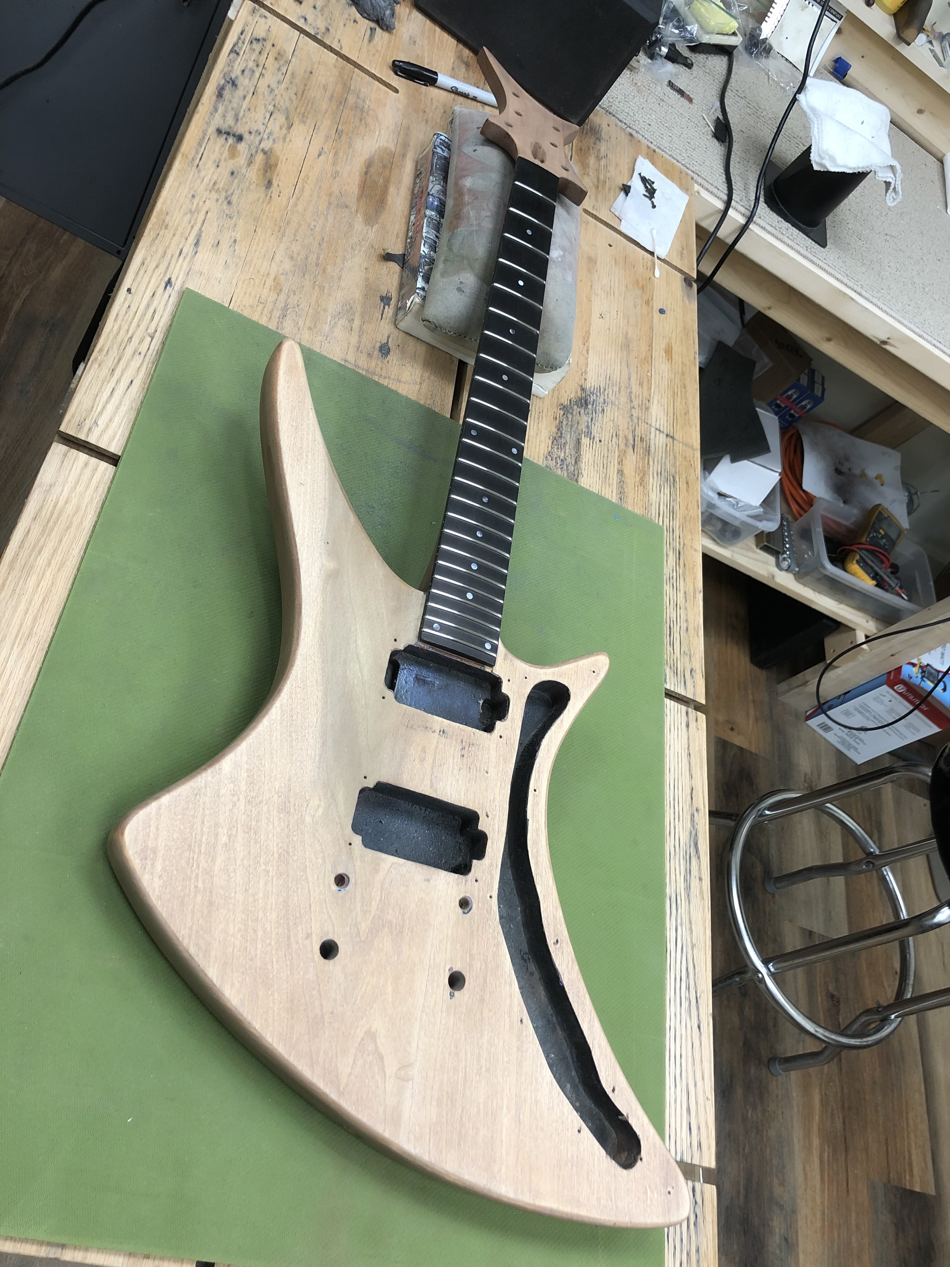 It's a Laurel fretboard, lighter than I like, so thinking about using India ink to dye it black on my next string change. IDK, ebony or richlite (black) would look better than brown with an all black guitar IMO.