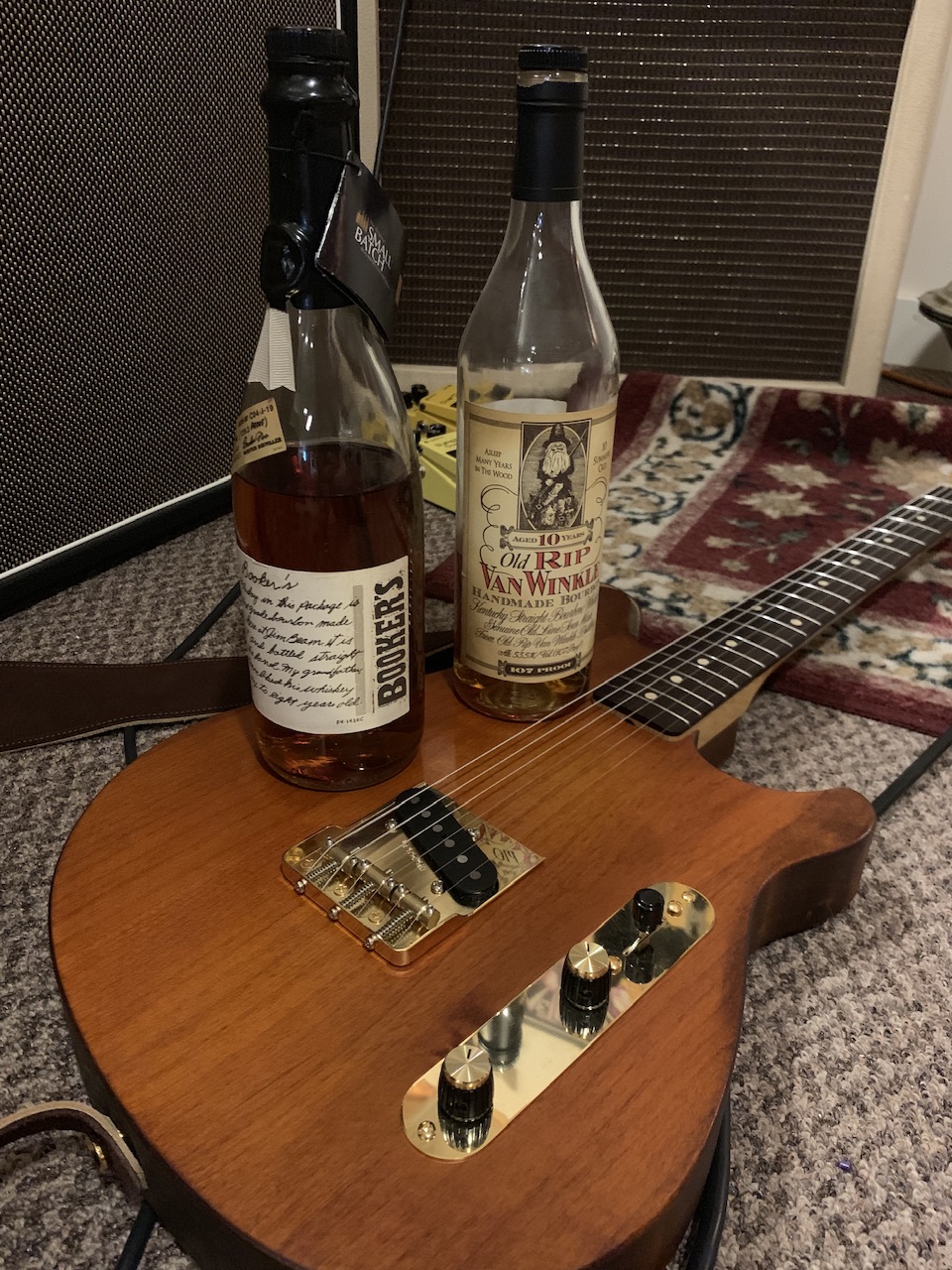 Mmmmm Bookers! You got good taste in Bourbon.That’s my “single barrel” partscaster. I stained it with analine dye powder and bourbon