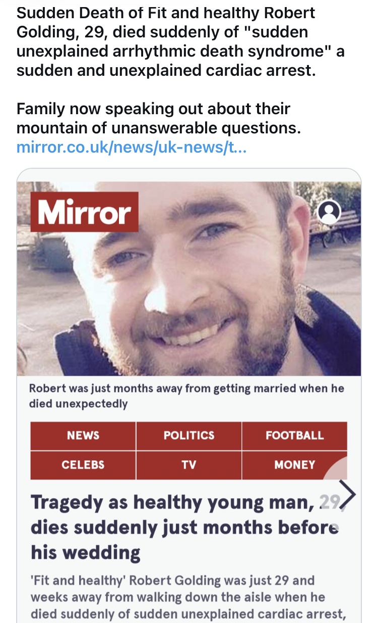 Well, since everyone else is proving the details by sharing articles of people dropping dead "suddenly" in such high frequency. And YOU claim that this is normal weekly, PROVE it then. Dig up some articles and back up your words and share articles from before 2020 with young athletes dropping like flies. This is your chance then to prove it, otherwise yet again you bring nothing to any thread but fake user ids and zero intelligent input.Newsflash my guy: