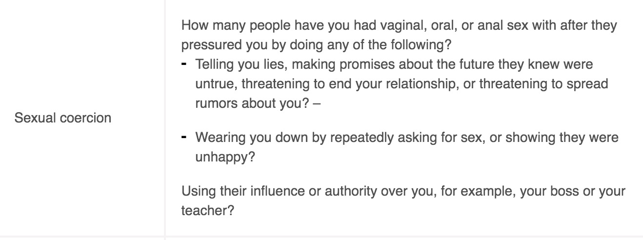 Coercion accounts for 80% of the rapes in this study (4,877,000 of 5,935,000 pregnancies).Here is the criteria for coercion. I don't agree with "Wearing you down by repeatedly asking for sex, or showing they were unhappy". And I think it would be hard to determine the others realistically by phone questionnaire.