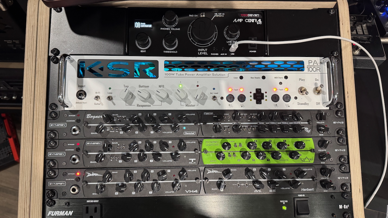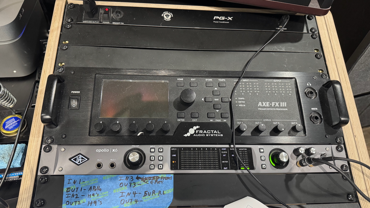 My studio desk has two 8u rack spaces. On one side I have a Synergy rig with KSR Power amp and the Redseven EVO. The other side has the Apollo X6 audio interface and the AxeFx3. All my amps as well as the Synergy/KSR Power Amp go through the RedSeven -> 2 EQ pedals (Left and Right) -> Eventide H90 -> AxeFx3 for time based effects -> Computer/StudioMonitors